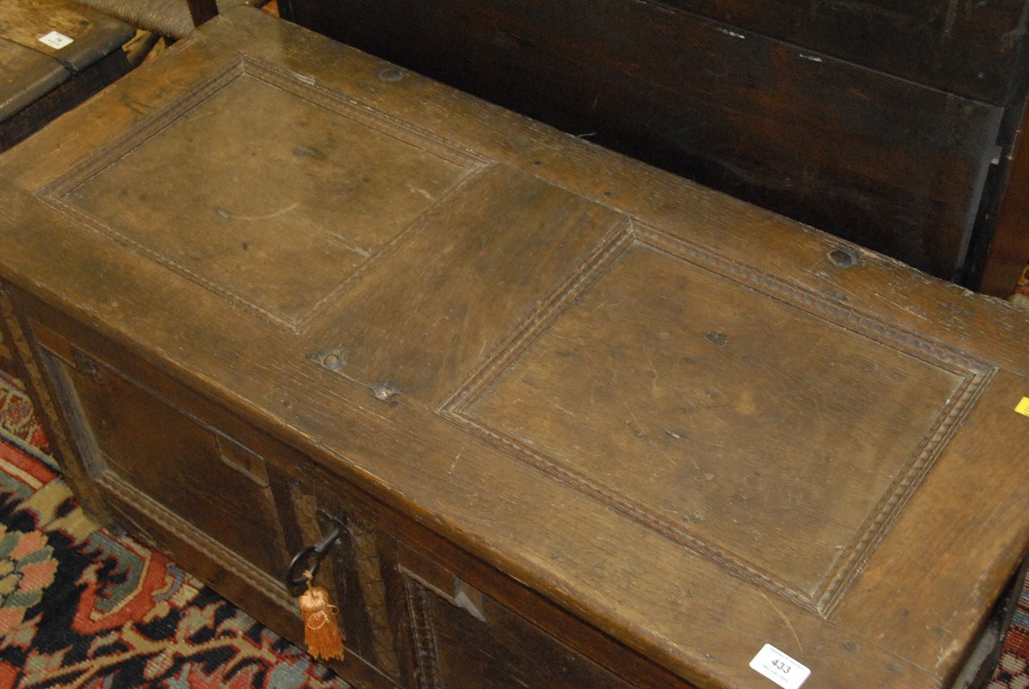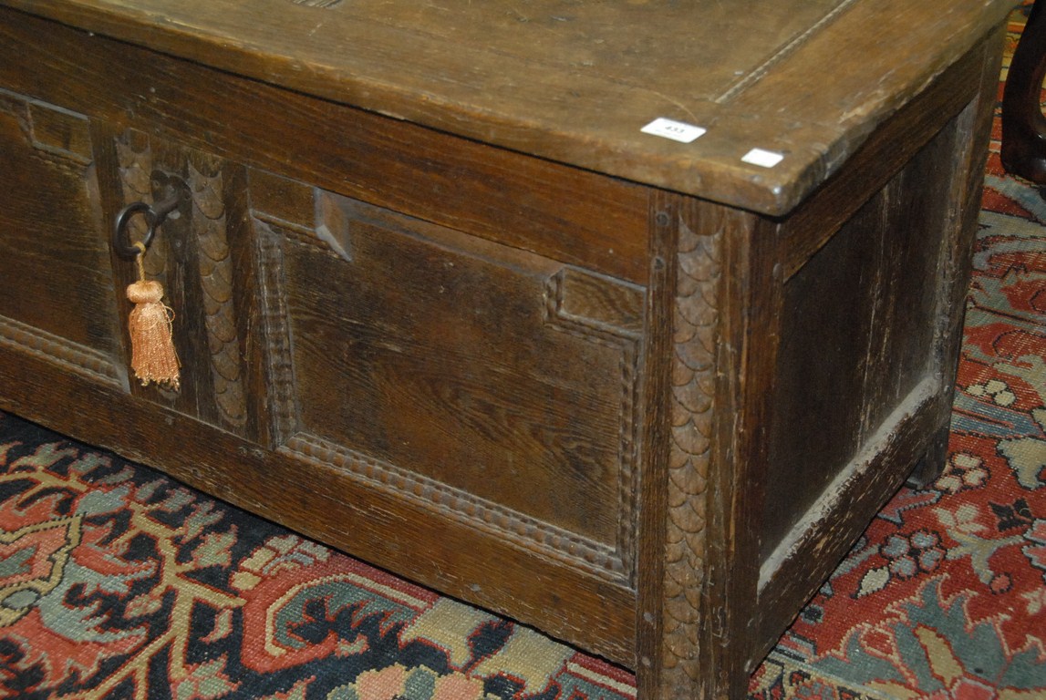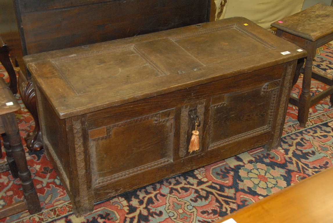 Lot 433: Early English oak chest with lift top and recessed panels with surround carvings, 17th century. ht. 21in. lg. 43in. wd. 20in.