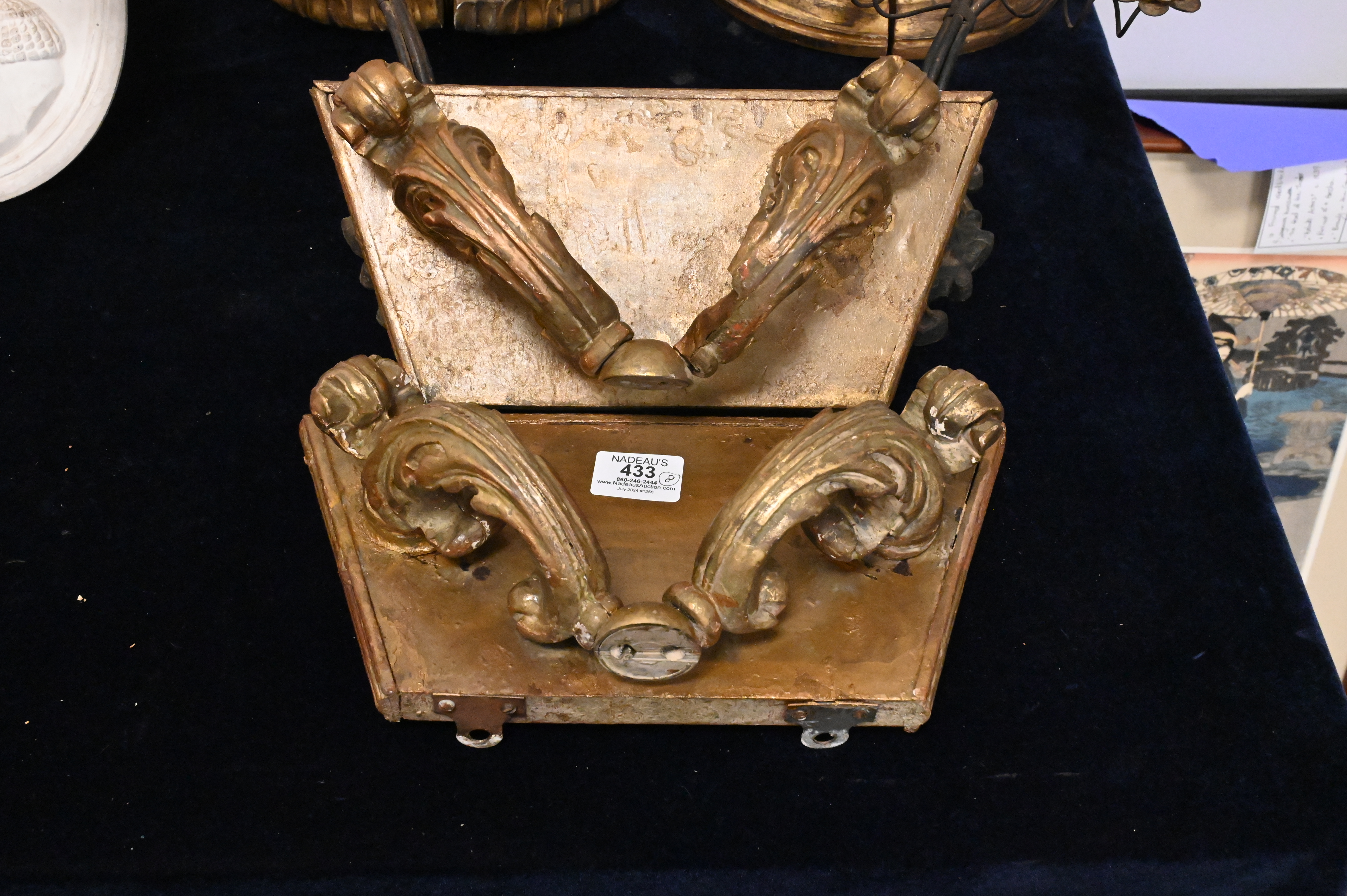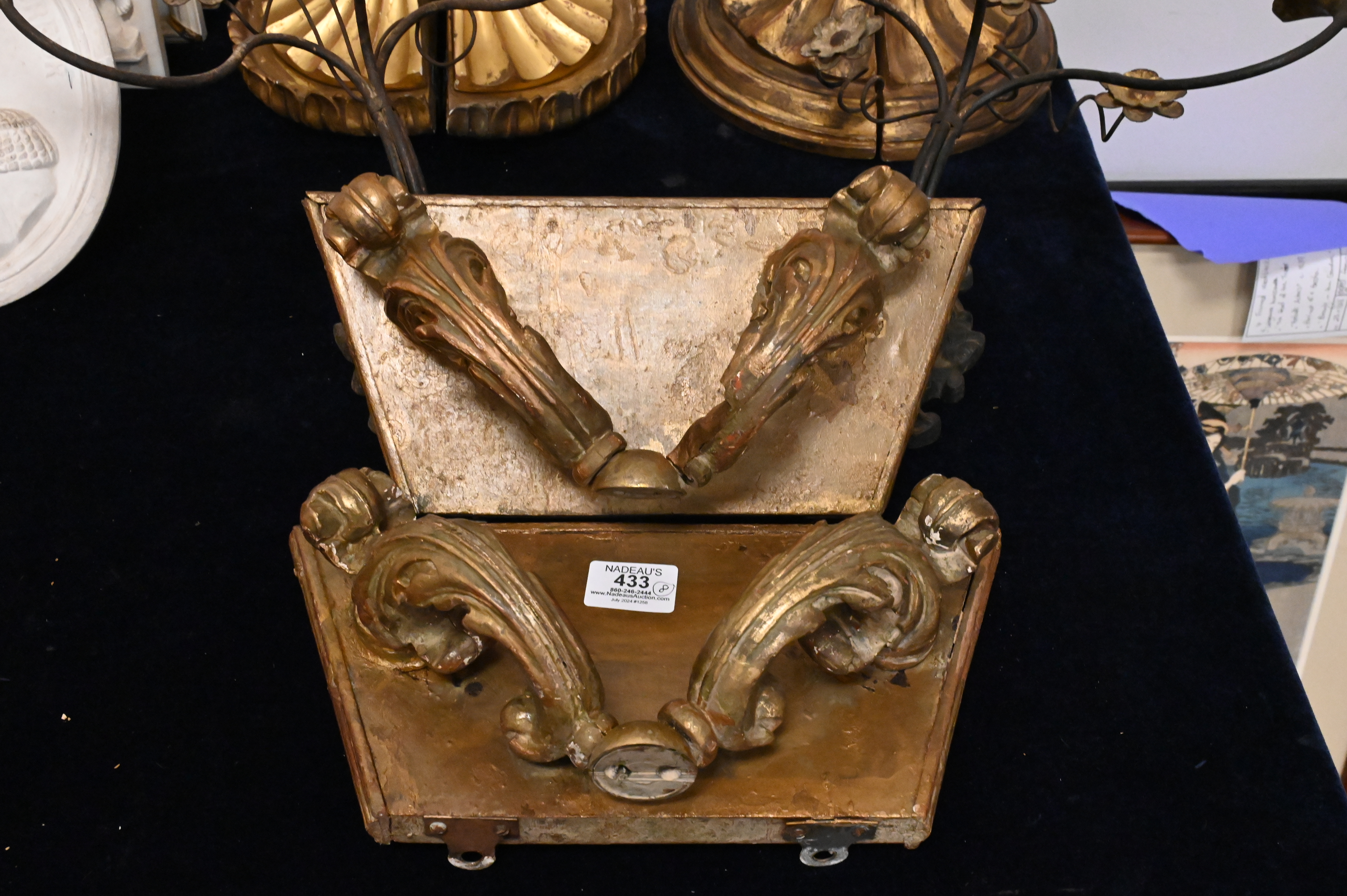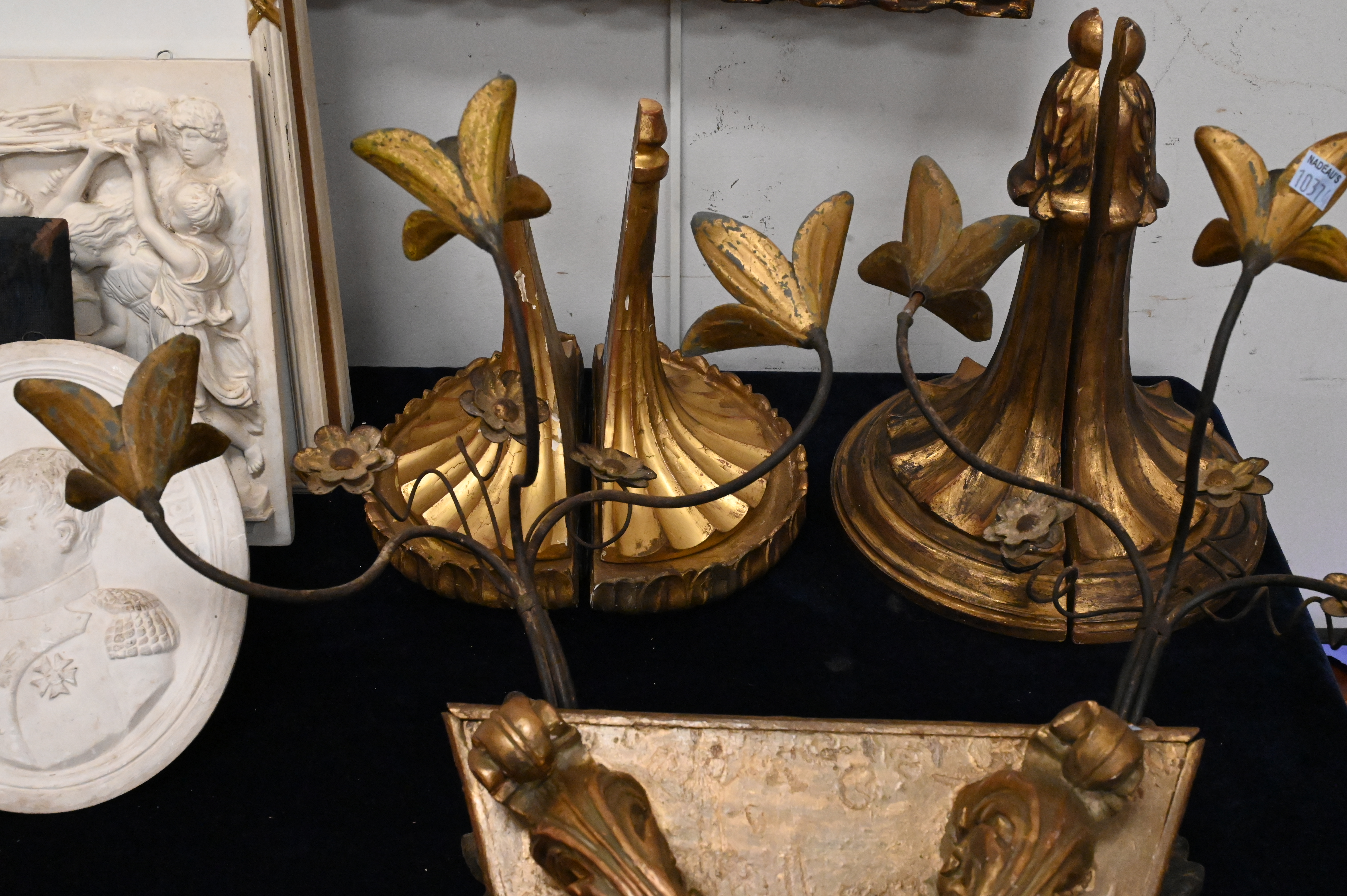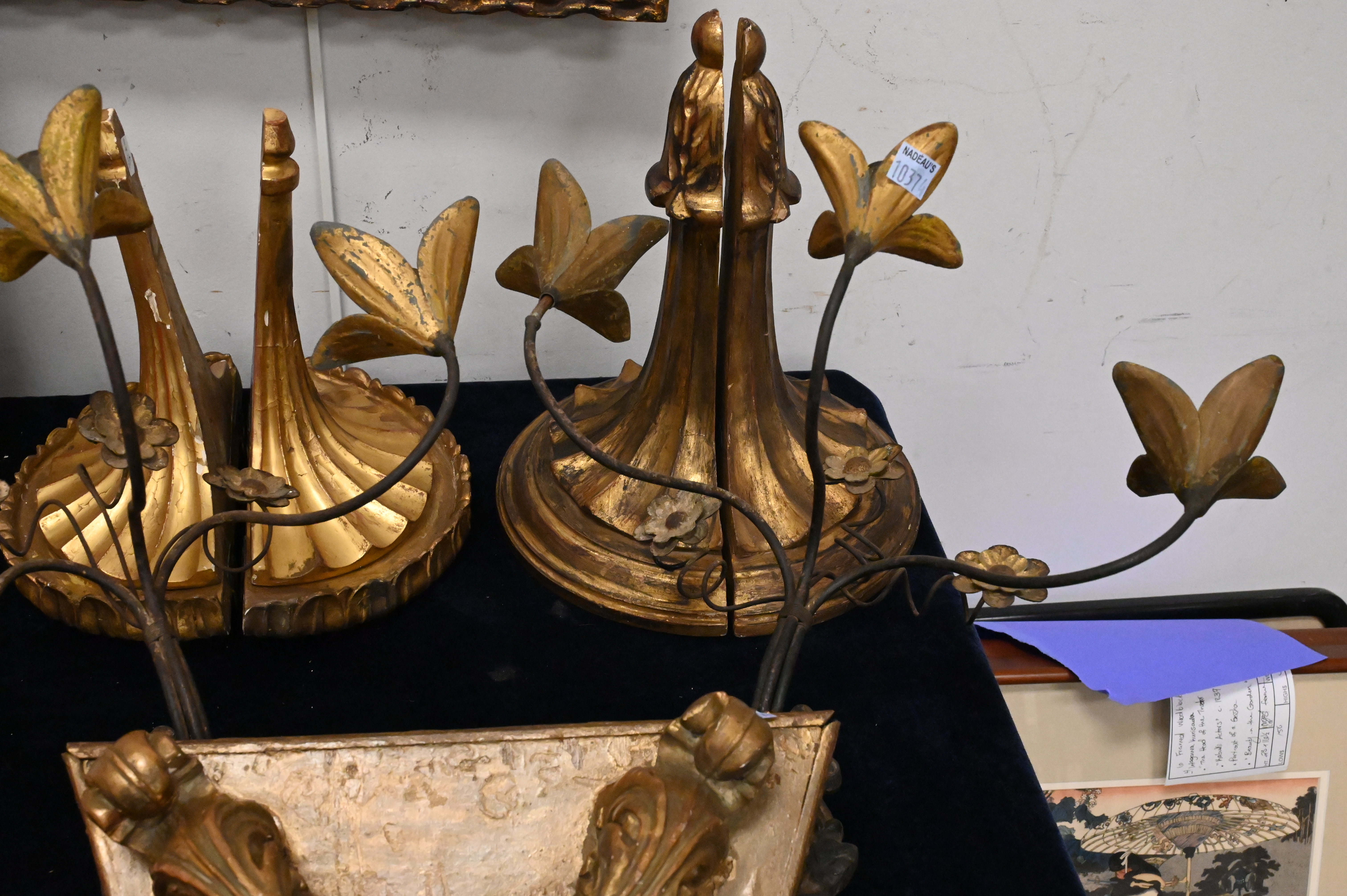 to include a pair of gilt hanging shelves/wall brackets, pair of gilt and metal floral sconces, and two pairs of Italian style carved shelves