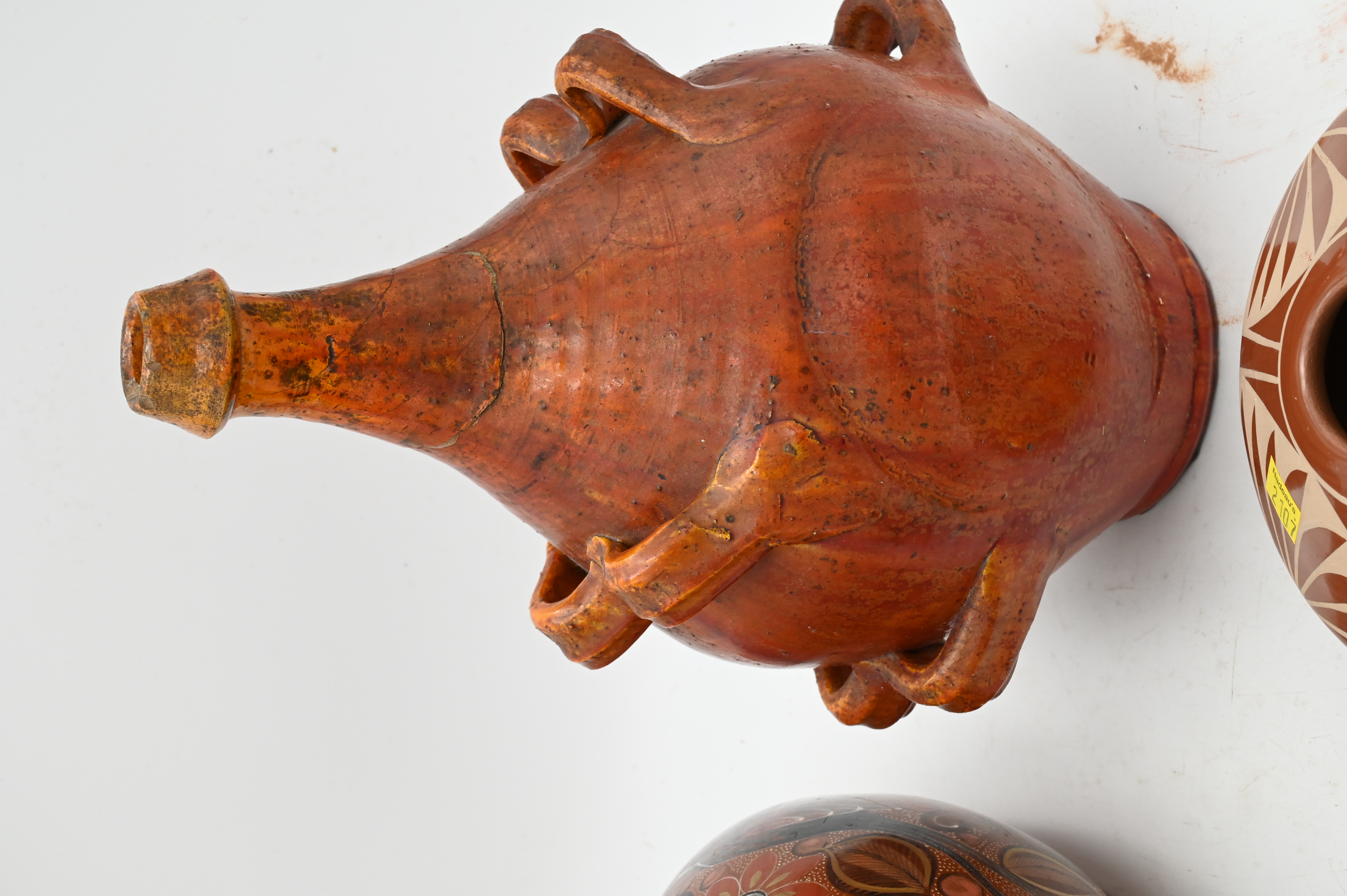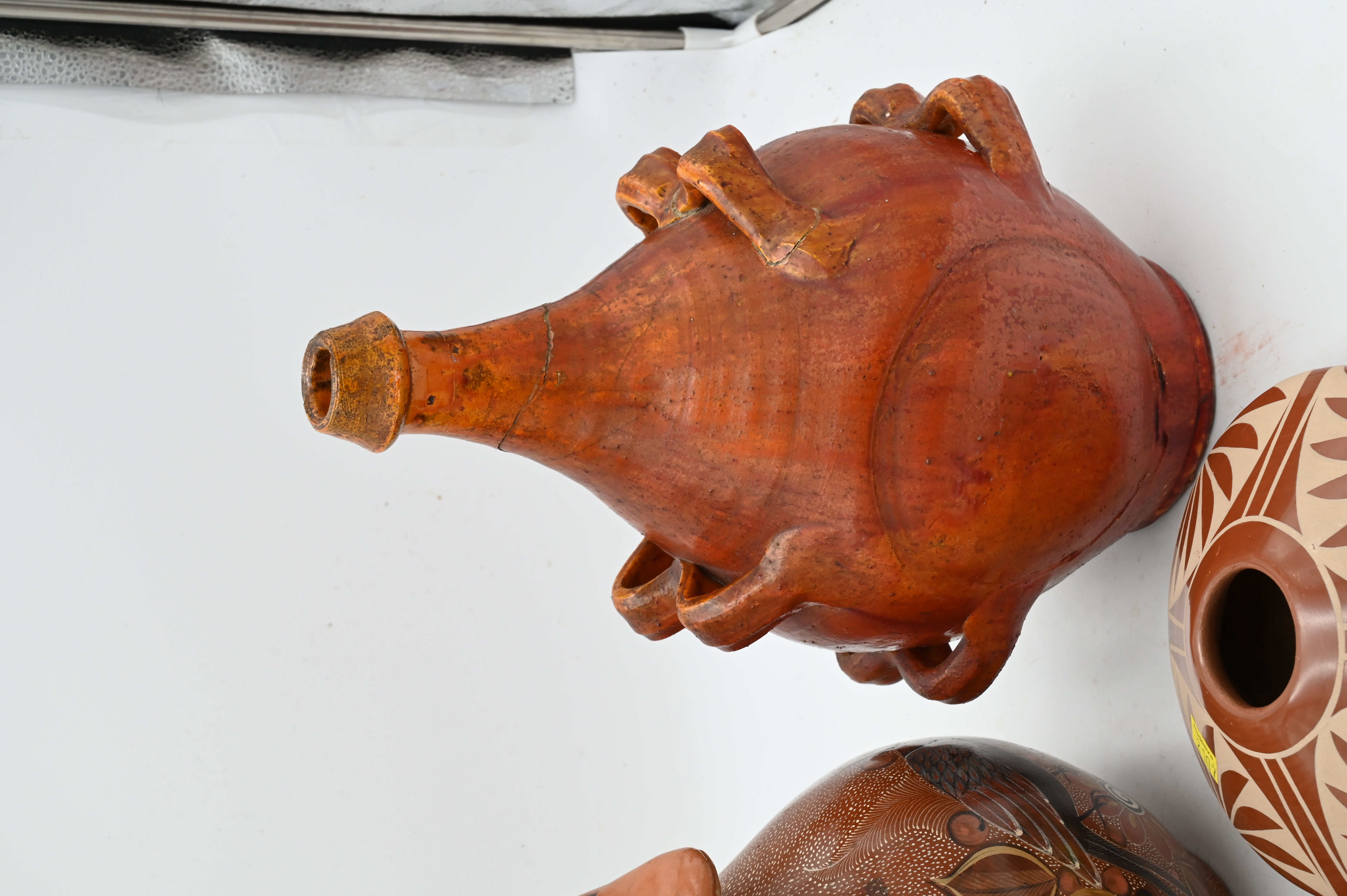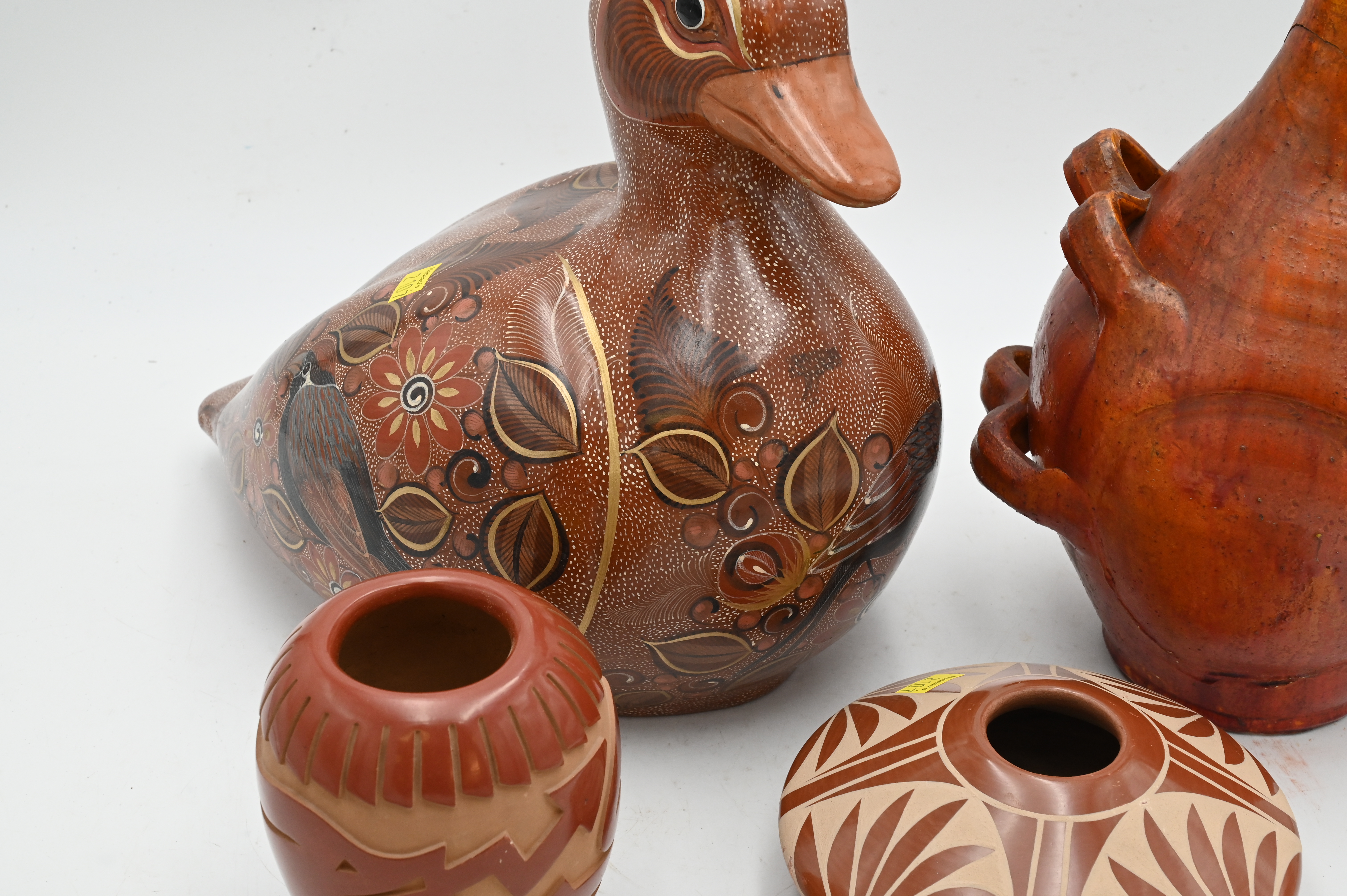 Four Piece Native American Ceramic Grouping, to include two pueblo redware pots, one squat signed Doug & Charlotte Vigil, the other signed by Ethel Vigil, a ceramic duck sculpture having ornate design, along with a red glazed amphora, height 14 inches.