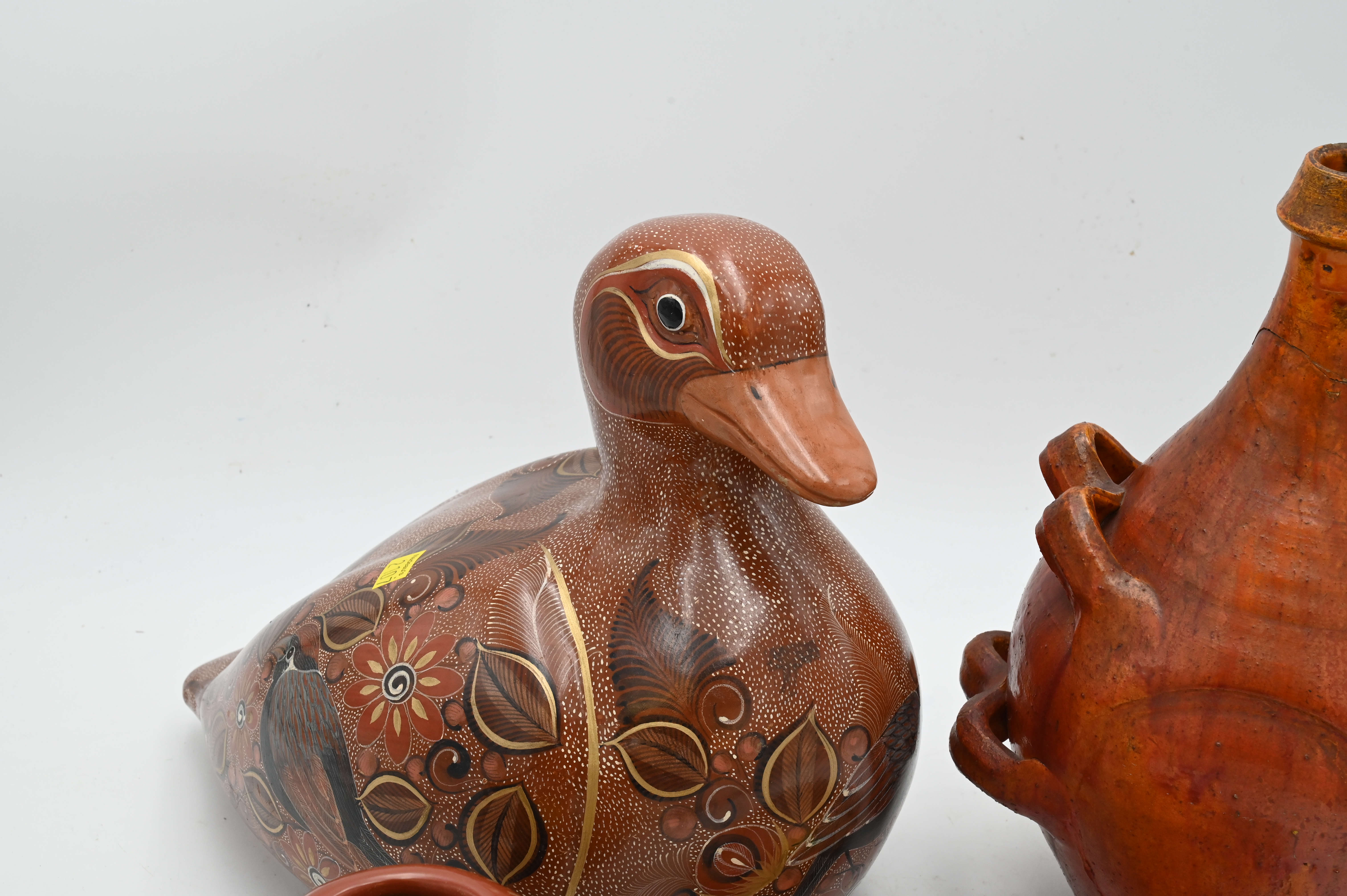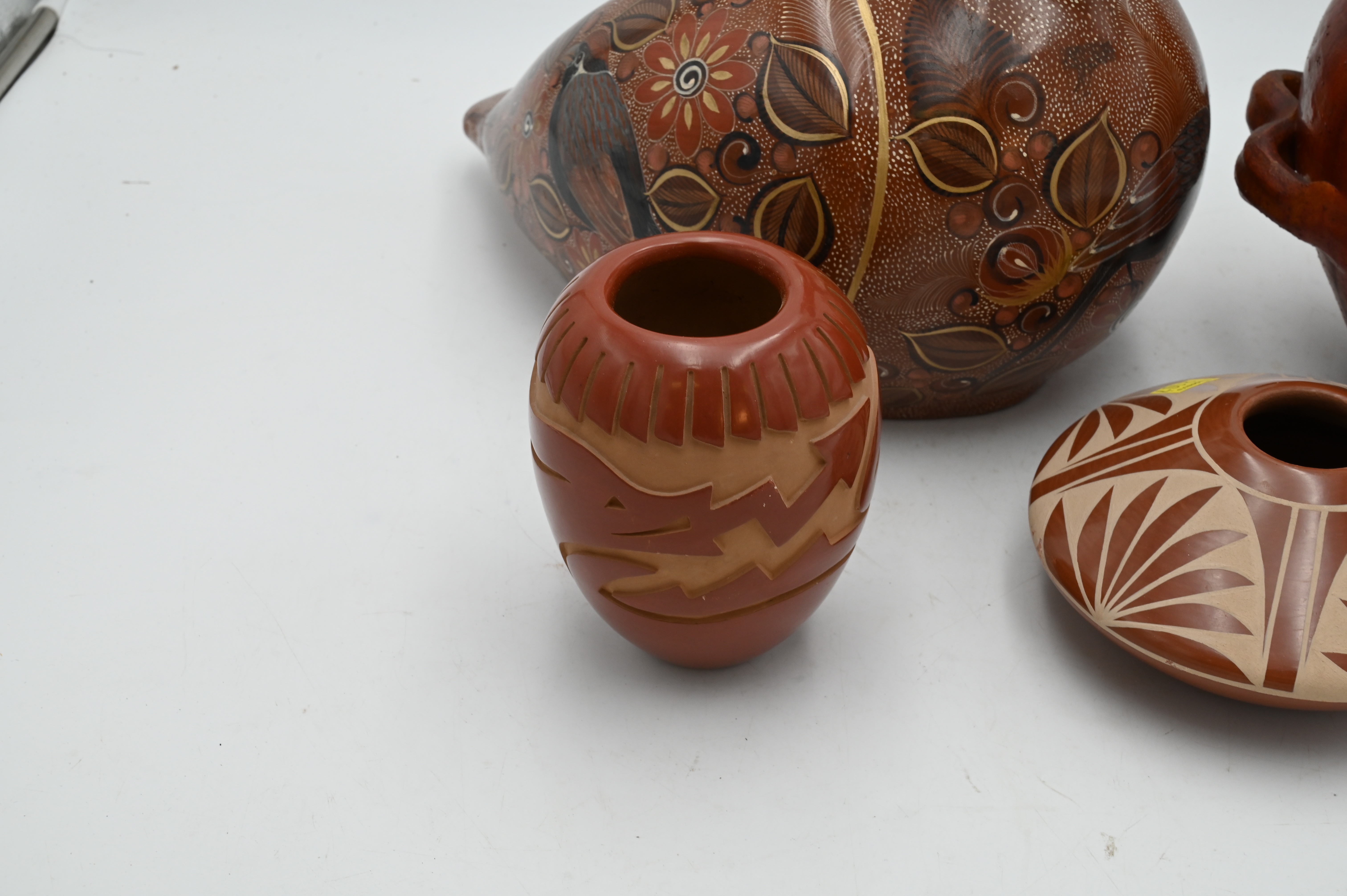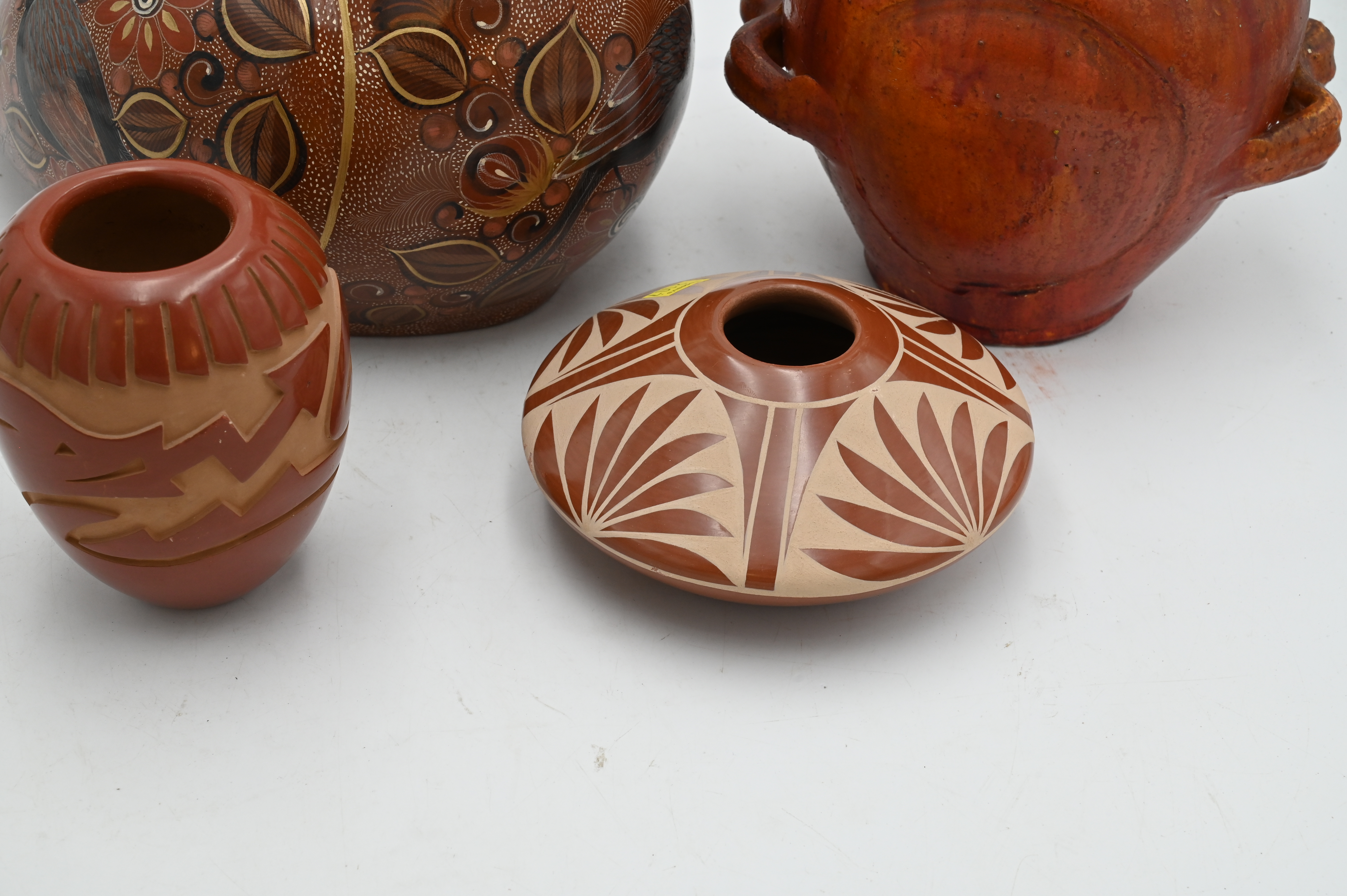 Four Piece Native American Ceramic Grouping, to include two pueblo redware pots, one squat signed Doug & Charlotte Vigil, the other signed by Ethel Vigil, a ceramic duck sculpture having ornate design, along with a red glazed amphora, height 14 inches.