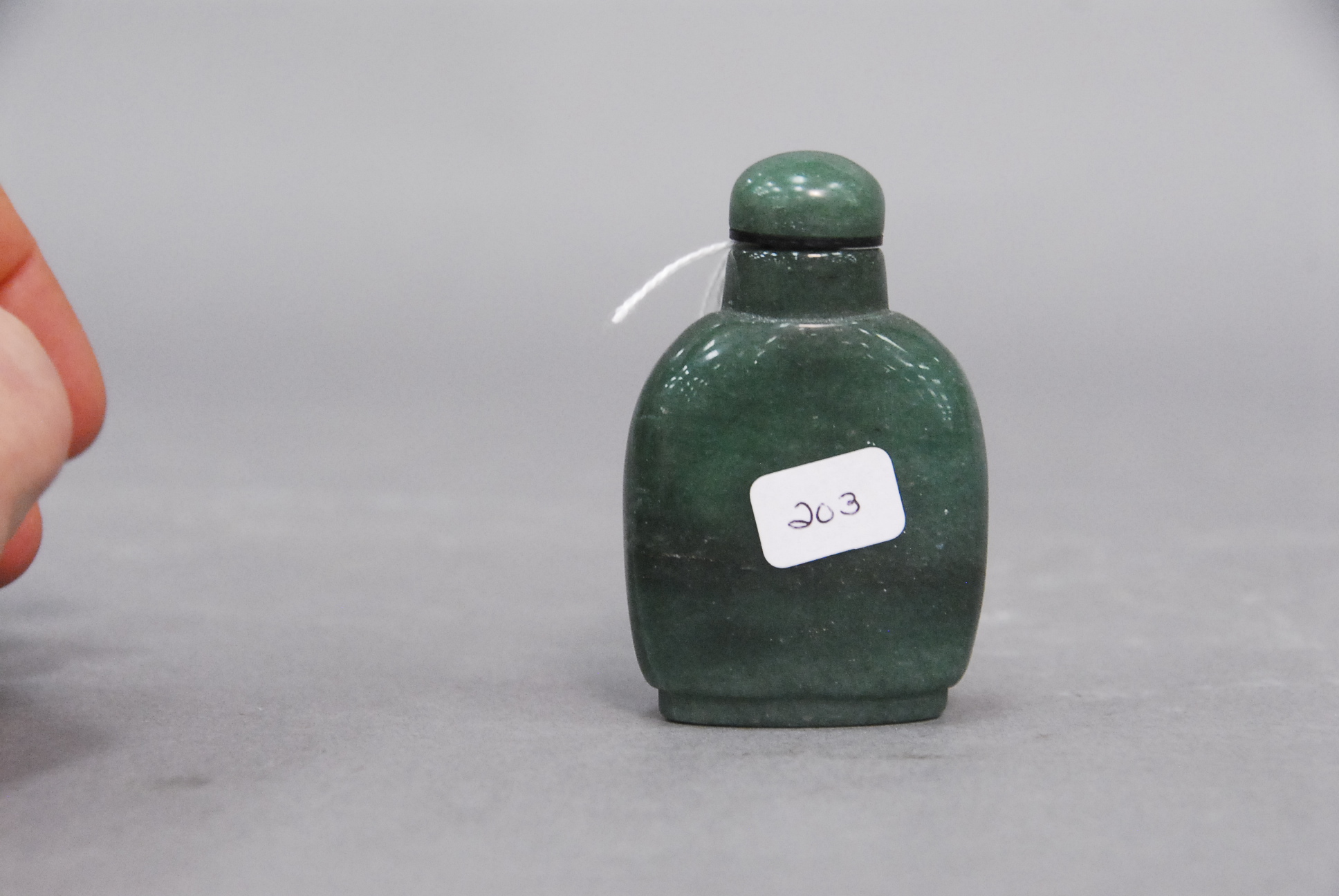 Green jade snuff bottle, having green jade top, 19th century, ht 2 3/4.