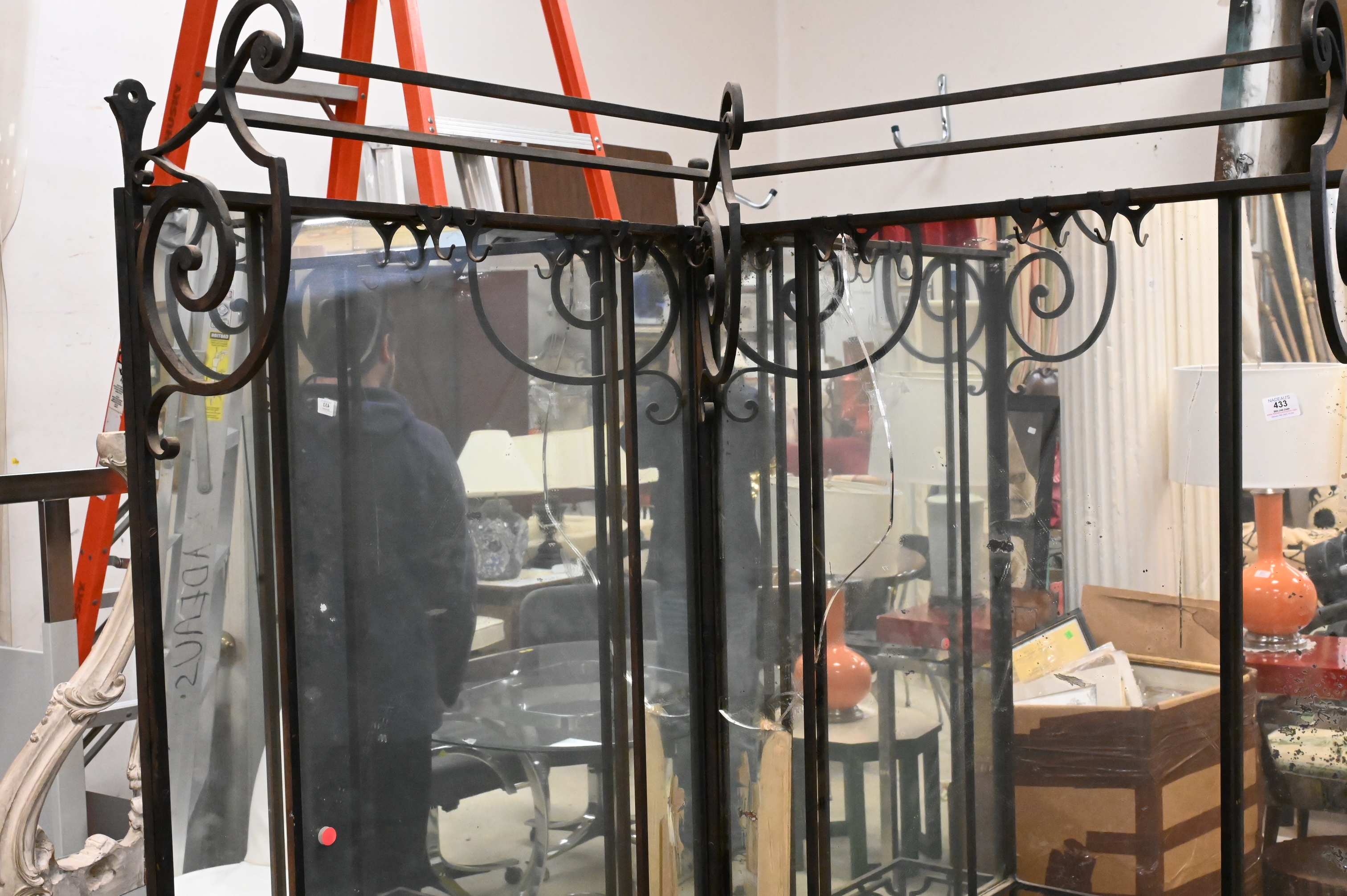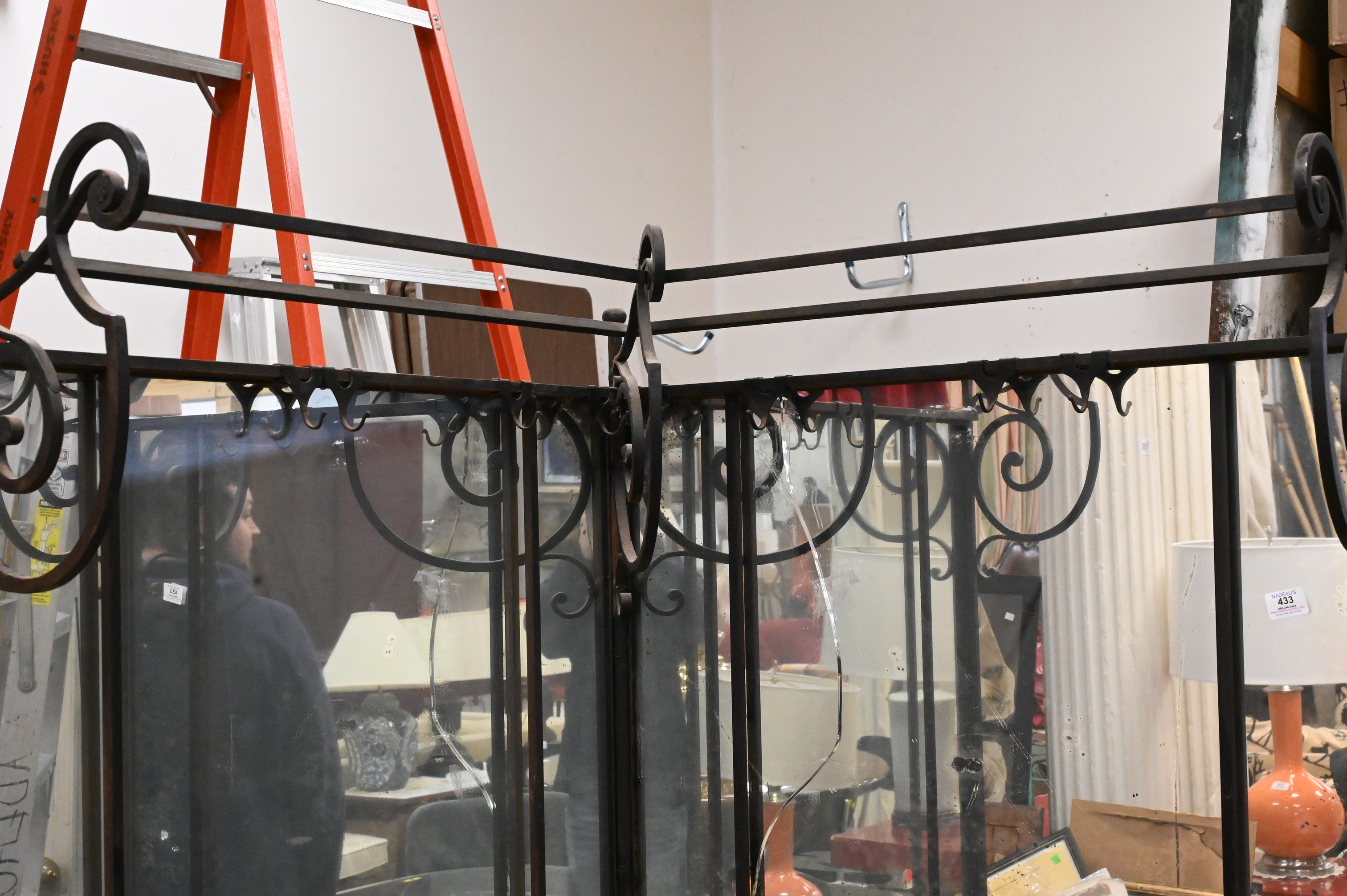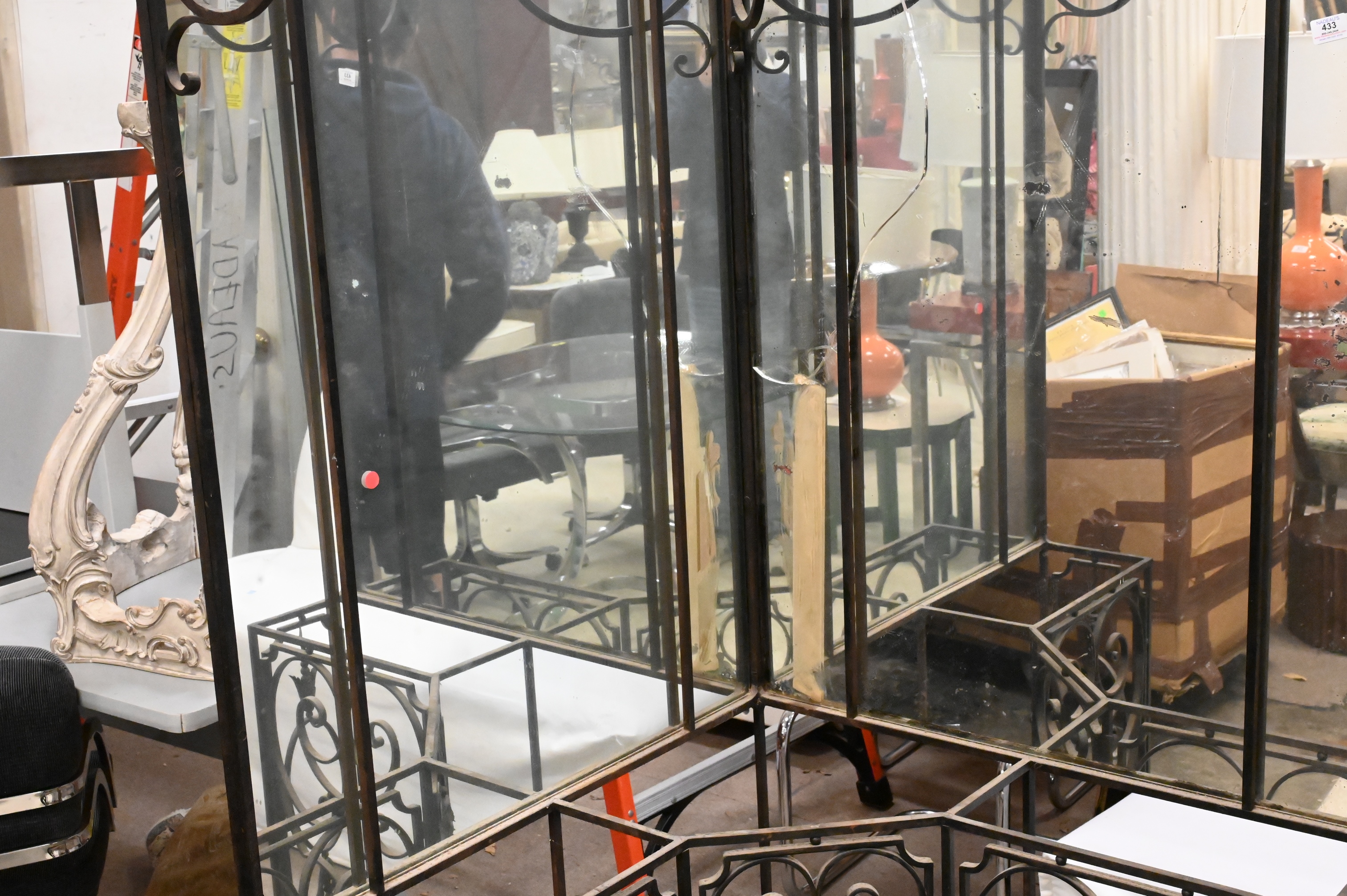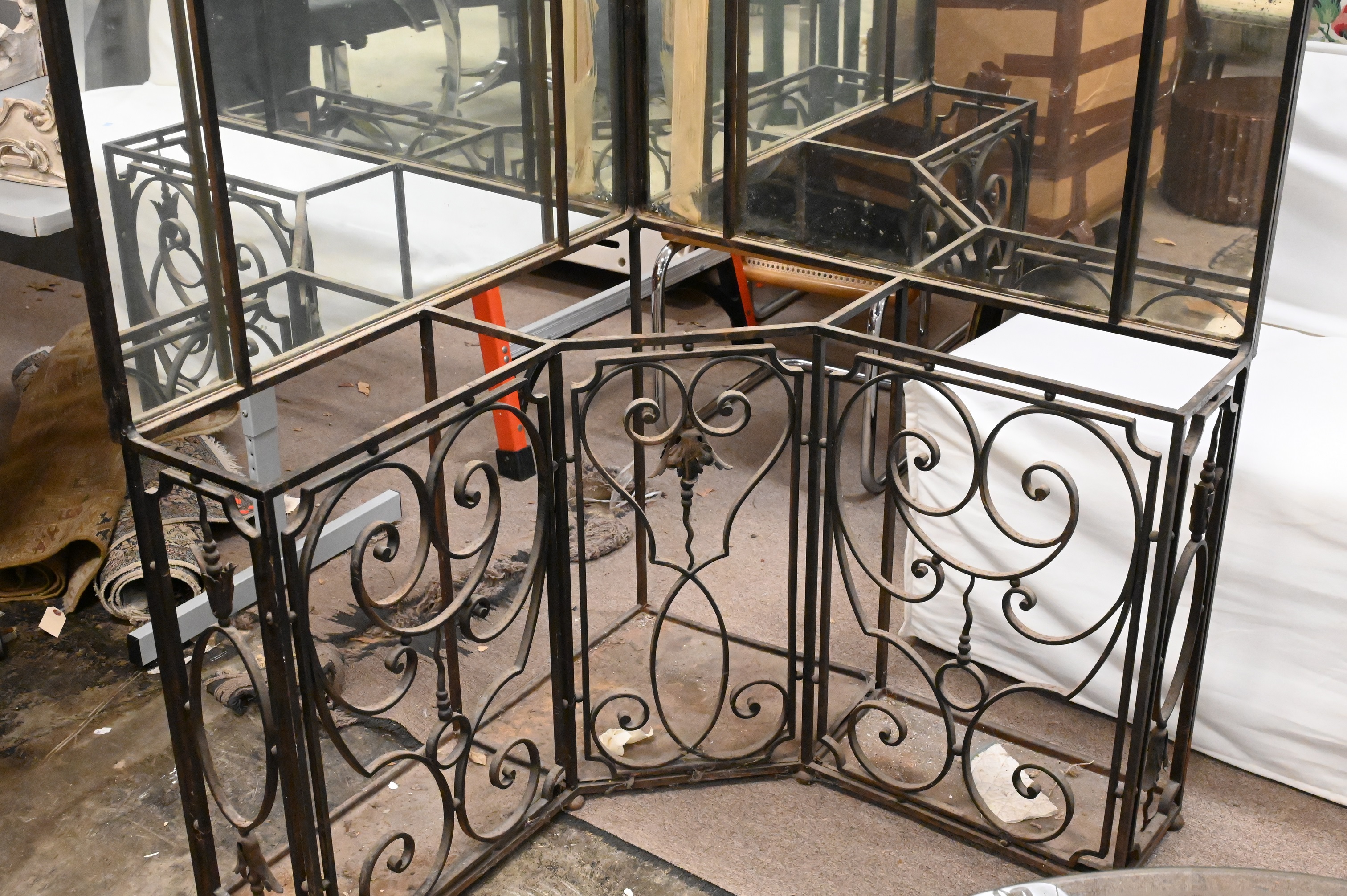 Iron Mirrored Corner Hall Rack, having umbrella holder base, old tag on reverse Argenture Garantie Depose Double, one mirror cracked, height 78 inches, width of each 36 inches.