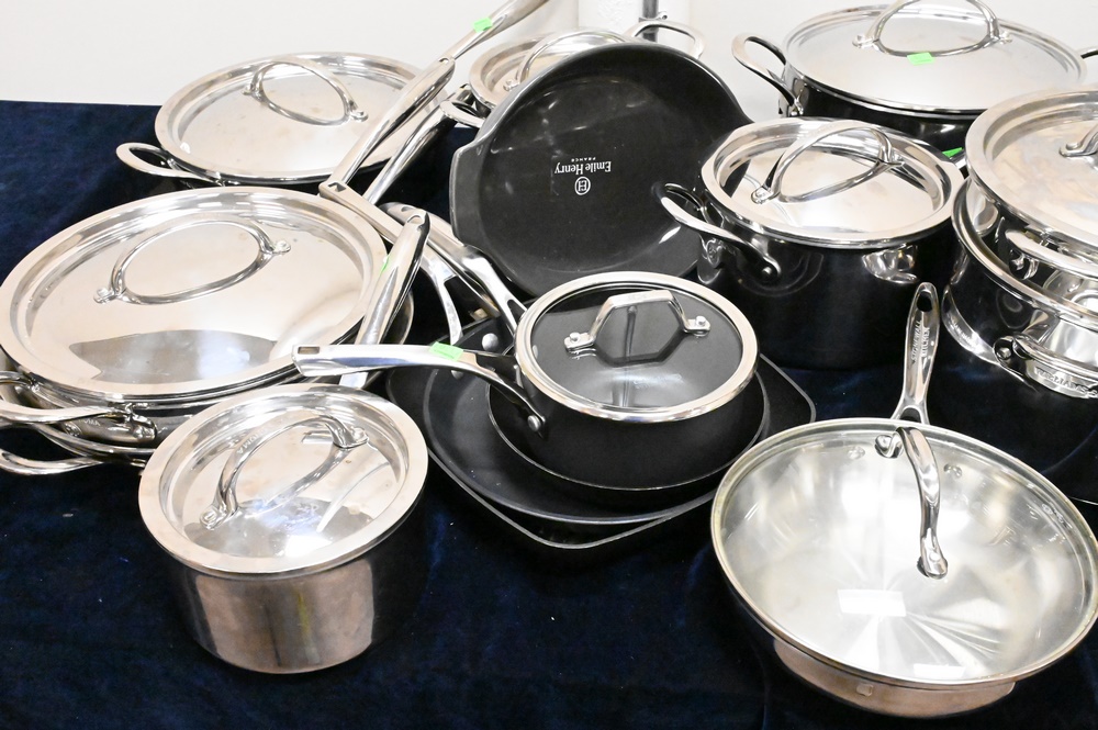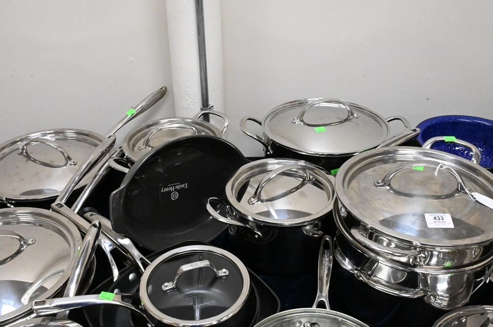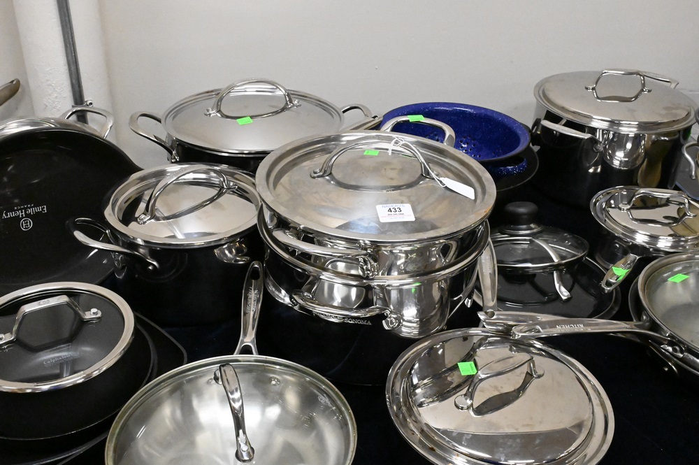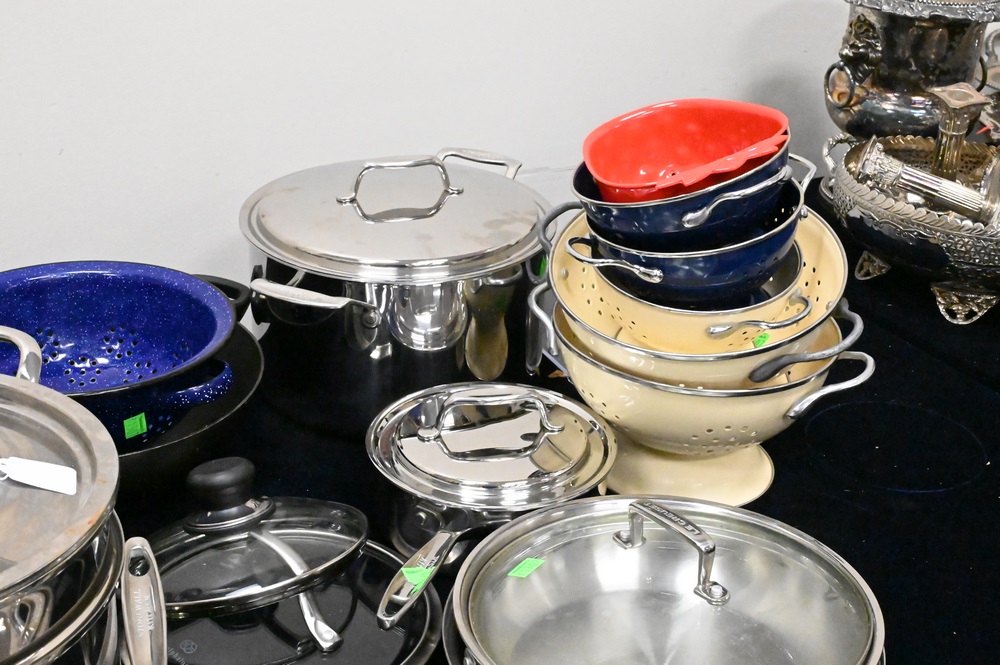 Large Group of Pots and Pans, (mostly pans), Williams Sonoma and Stonewall Kitchen stainless steel, enameled strainers, frying pans, etc.