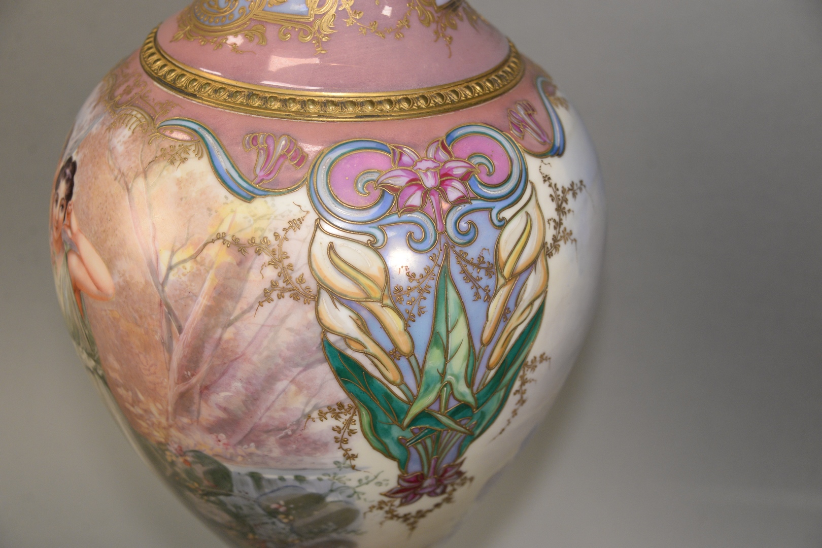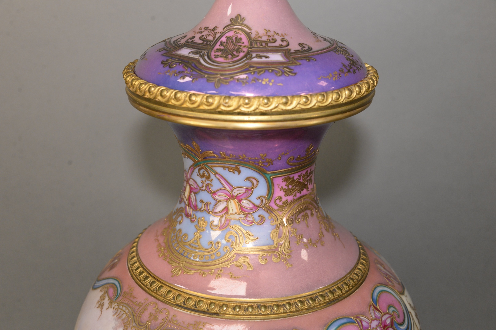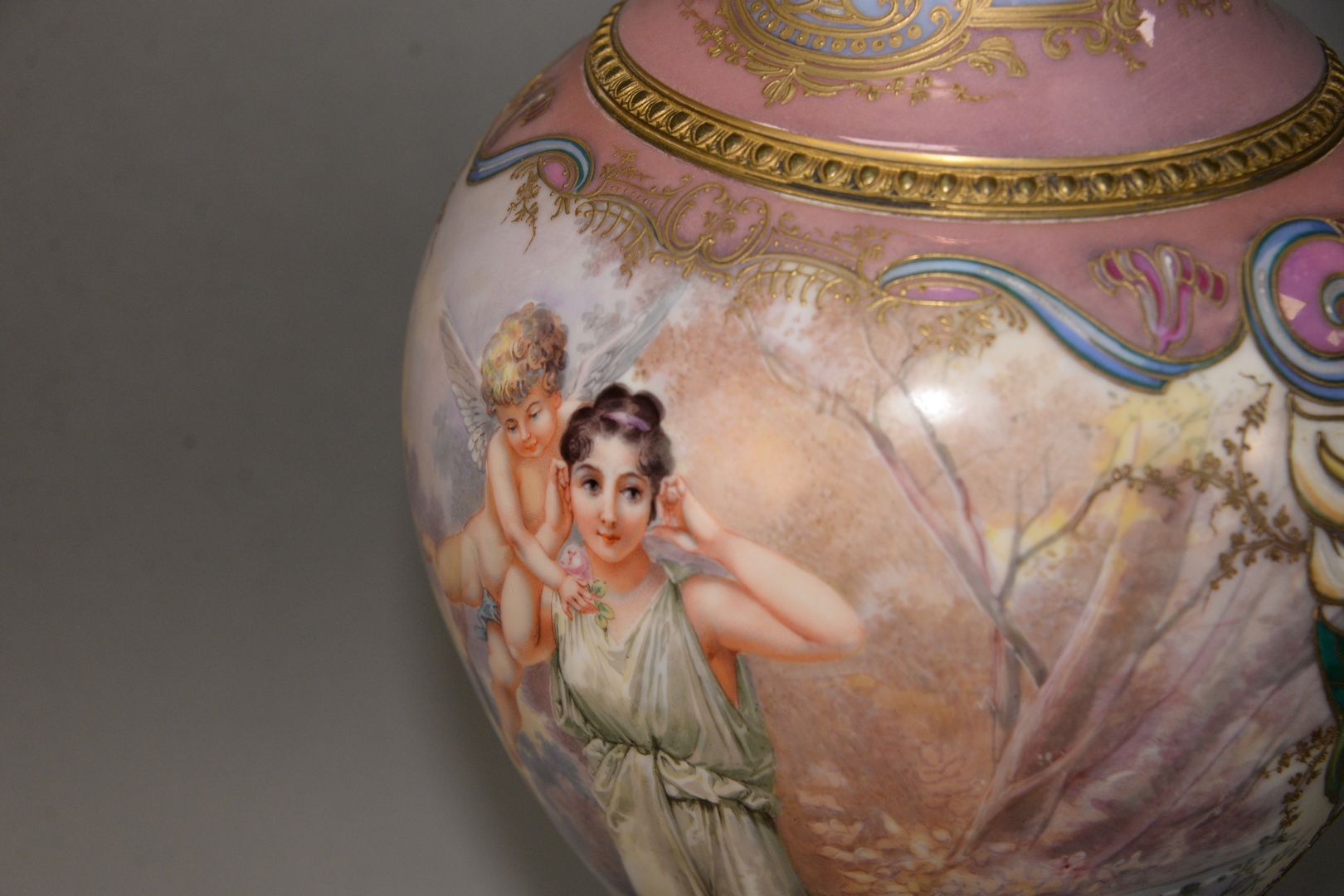 Lot 433: Monumental Sevres Gilt-bronze and Porcelain Urns having pink ground, hand-painted, young woman with Putti figure on one side and lan…