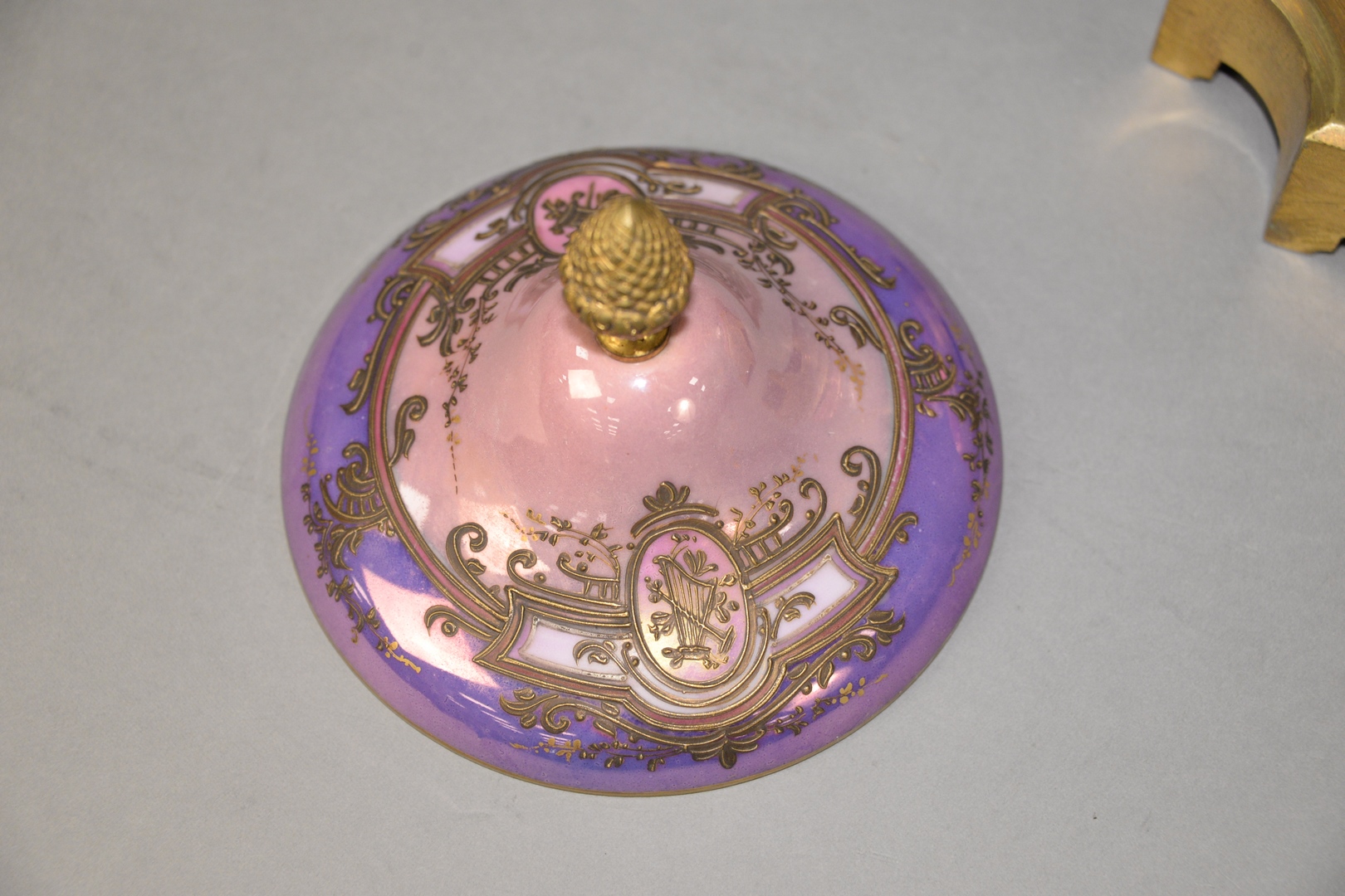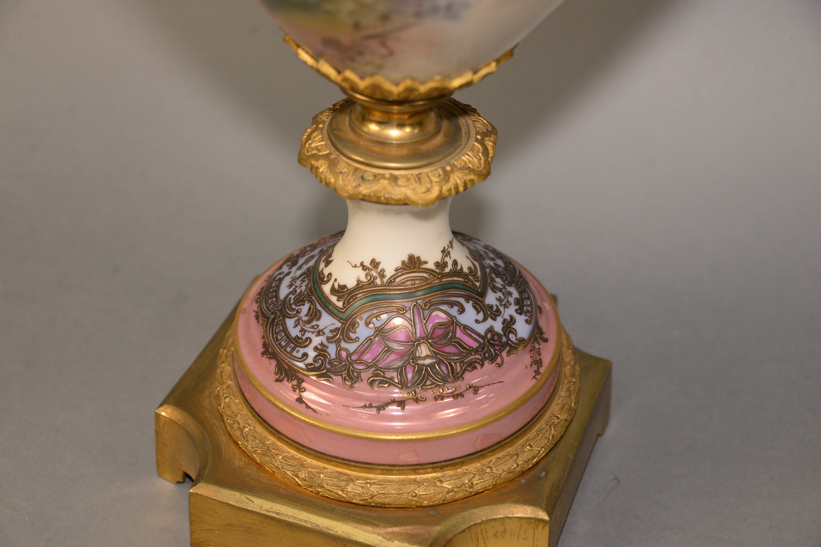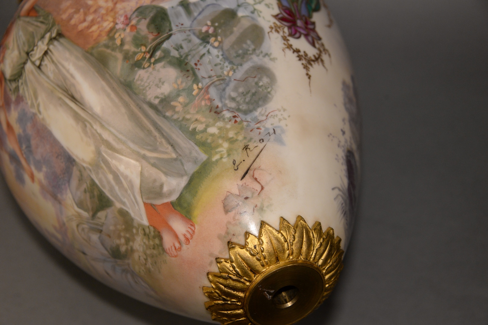 Lot 433: Monumental Sevres Gilt-bronze and Porcelain Urns having pink ground, hand-painted, young woman with Putti figure on one side and lan…