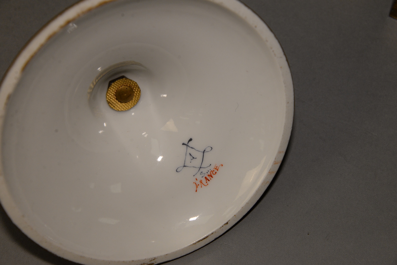 having pink ground, hand-painted, young woman with Putti figure on one side and landscape on opposite side