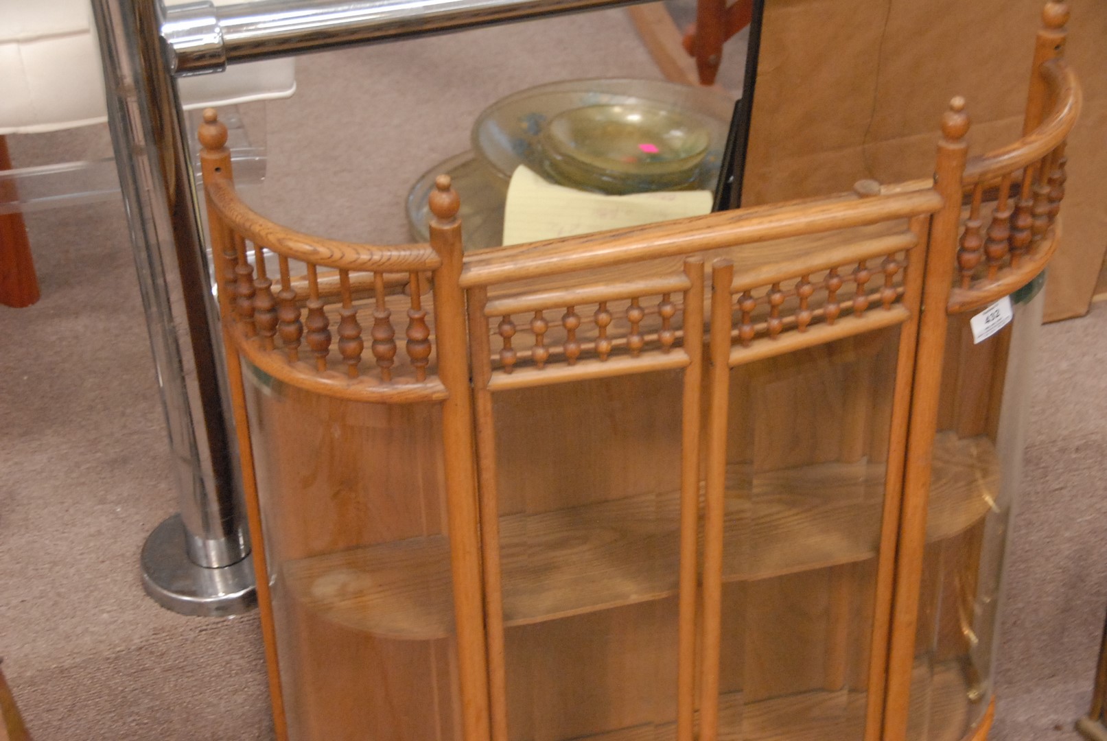 Oak Stick and Ball Victorian hanging cabinet with beveled bowed glass. wd. 44 in.