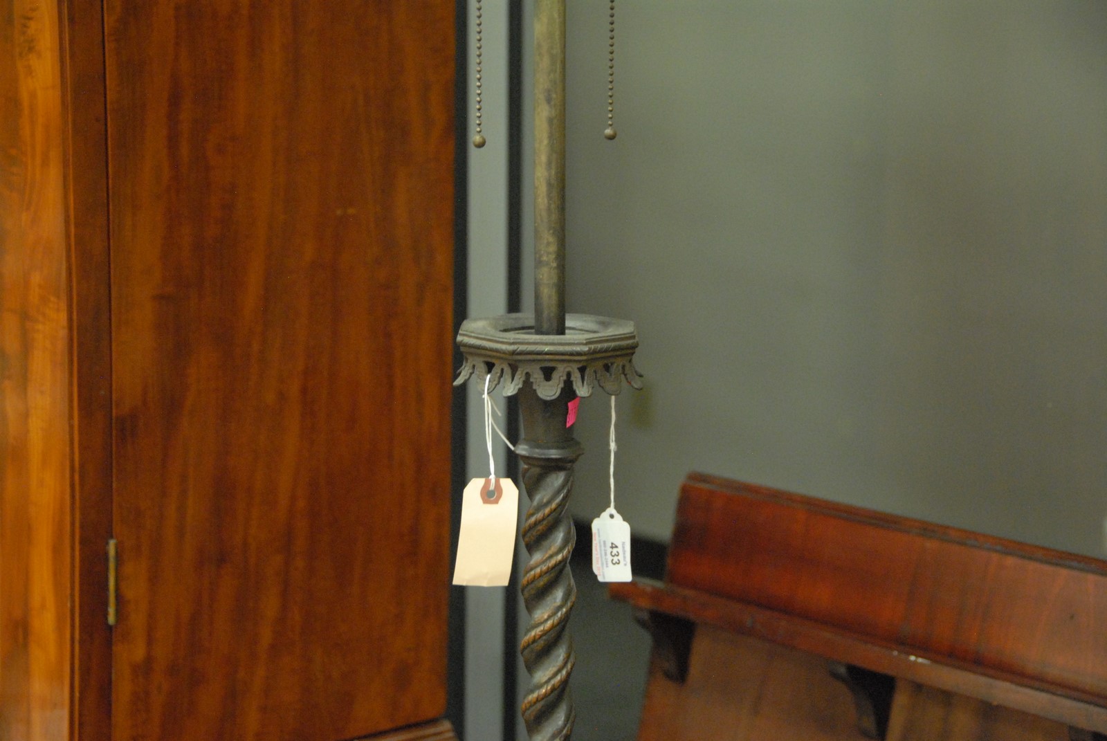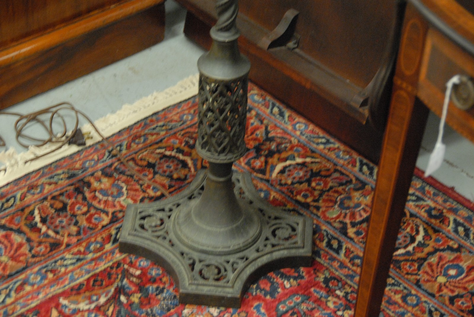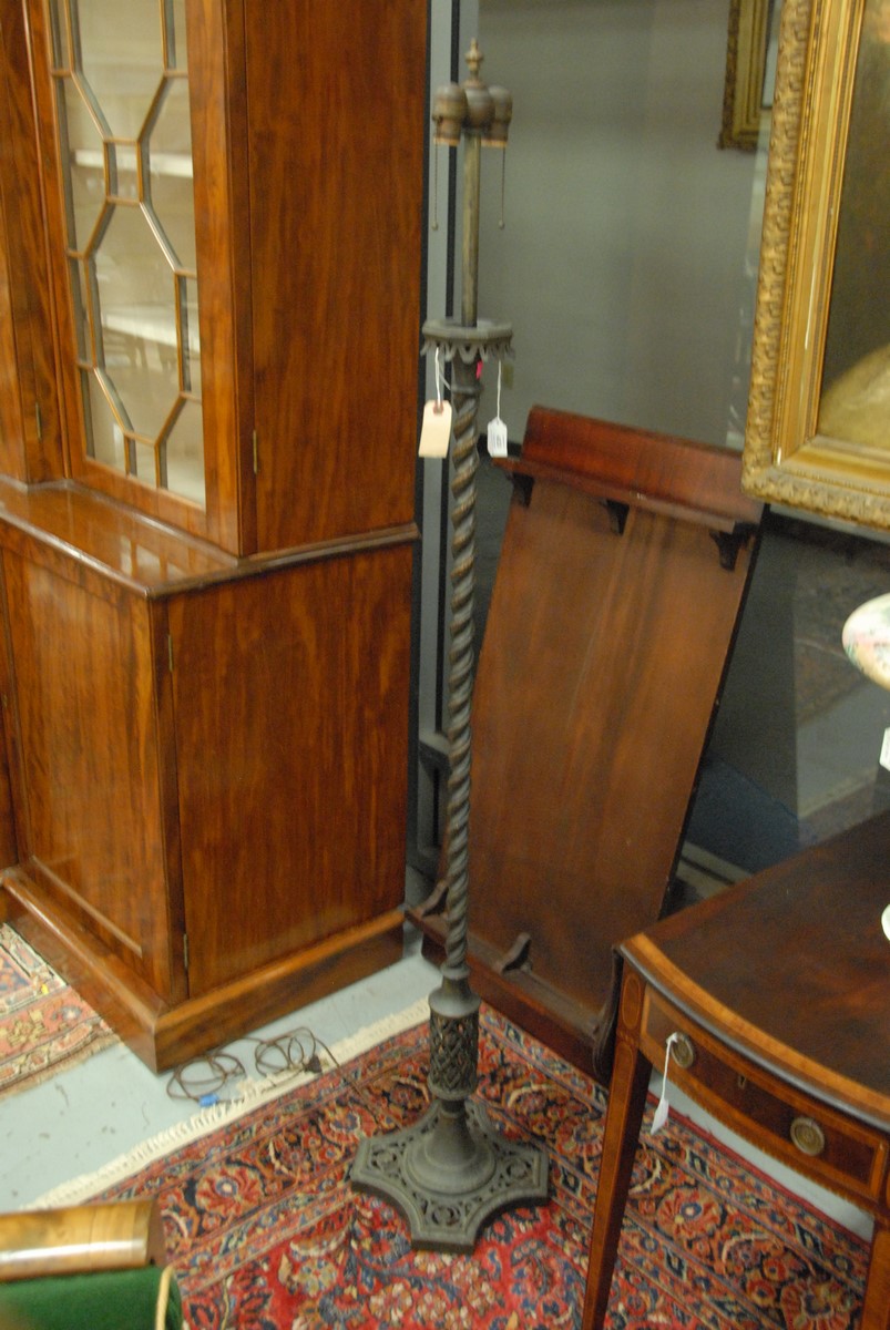 Lot 433: Oscar Bach bronze floor lamp with spiral shaft openwork bottom and four sided base, signed on bottom Oscar Bach. ht. 63 in.