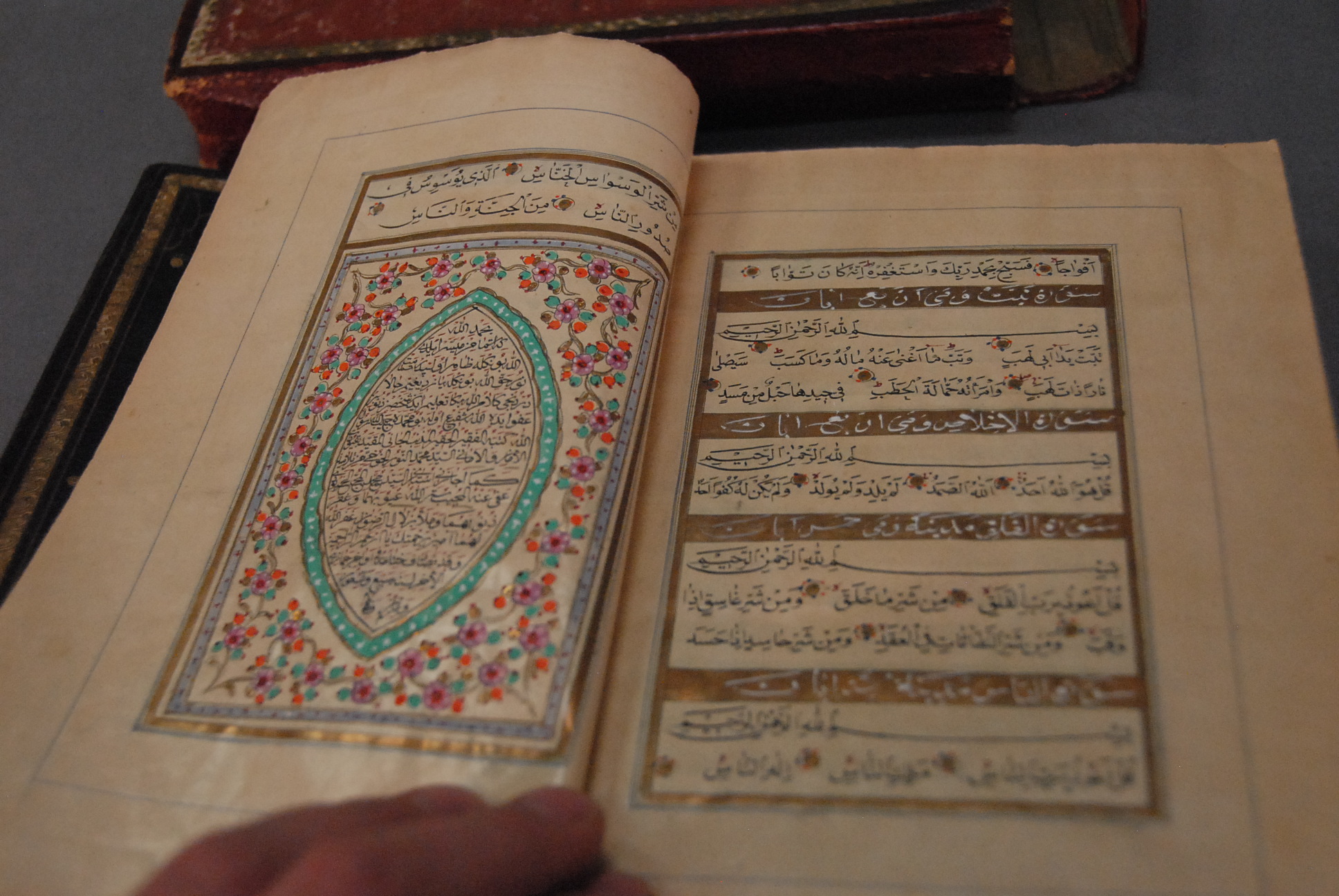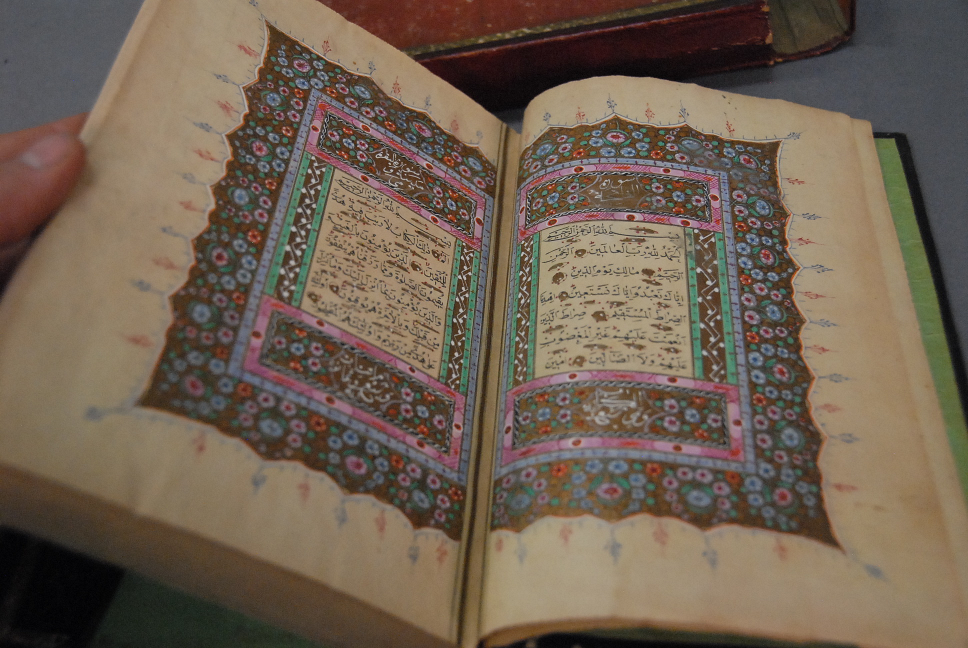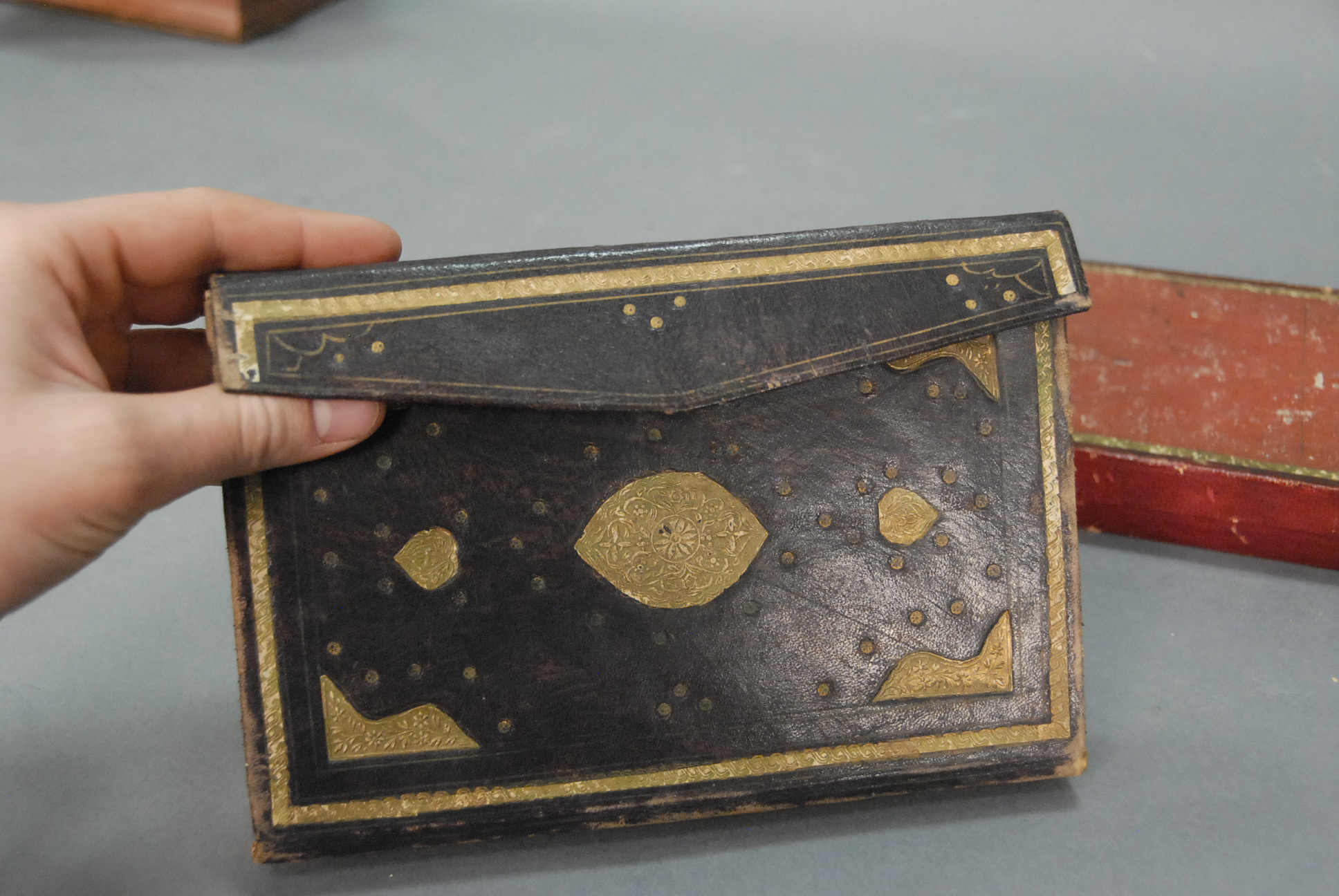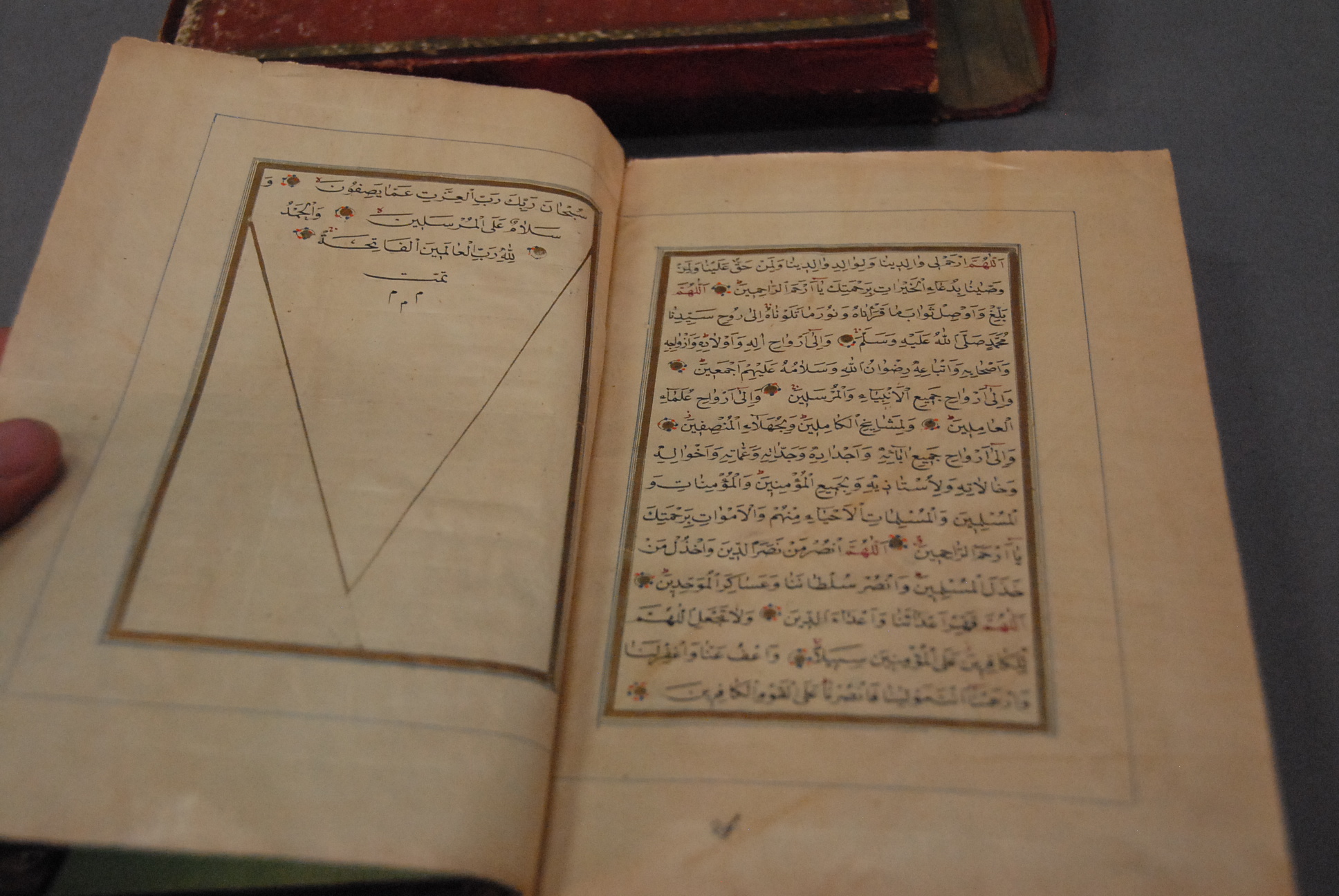 Lot 433: Persian Illuminated Manuscript 17th-18th century in leather binding with three hand painted plates, all writing bordered in gold, from the Lowell Palmer Library.