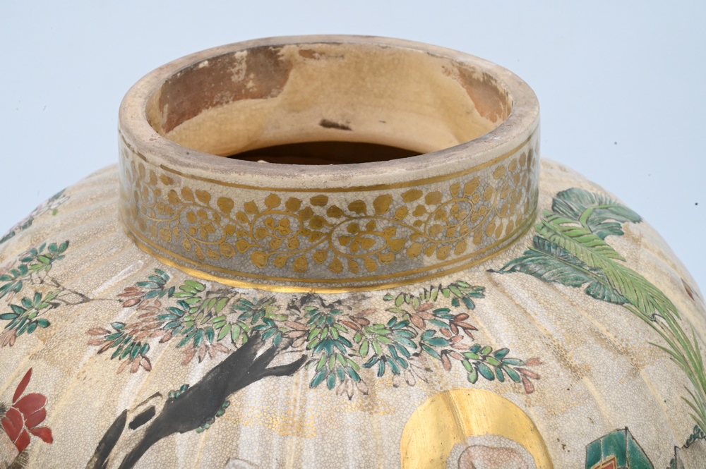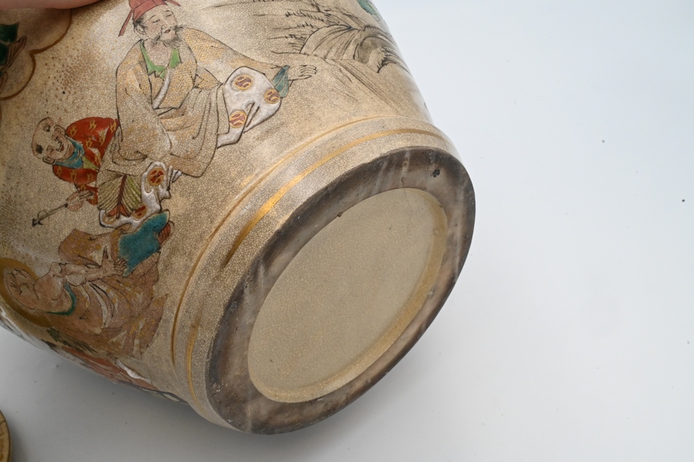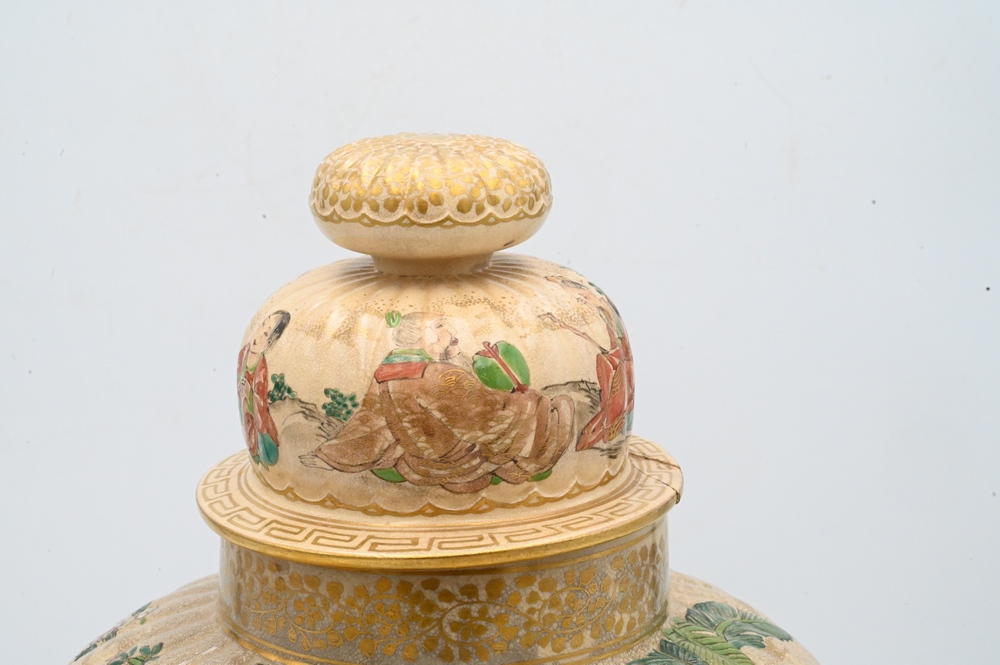 Satsuma Covered Urn, decorated with figures and landscape, (cover repaired), height 17 inches.