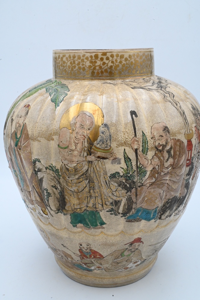 Lot 433: Satsuma Covered Urn, decorated with figures and landscape, (cover repaired), height 17 inches.