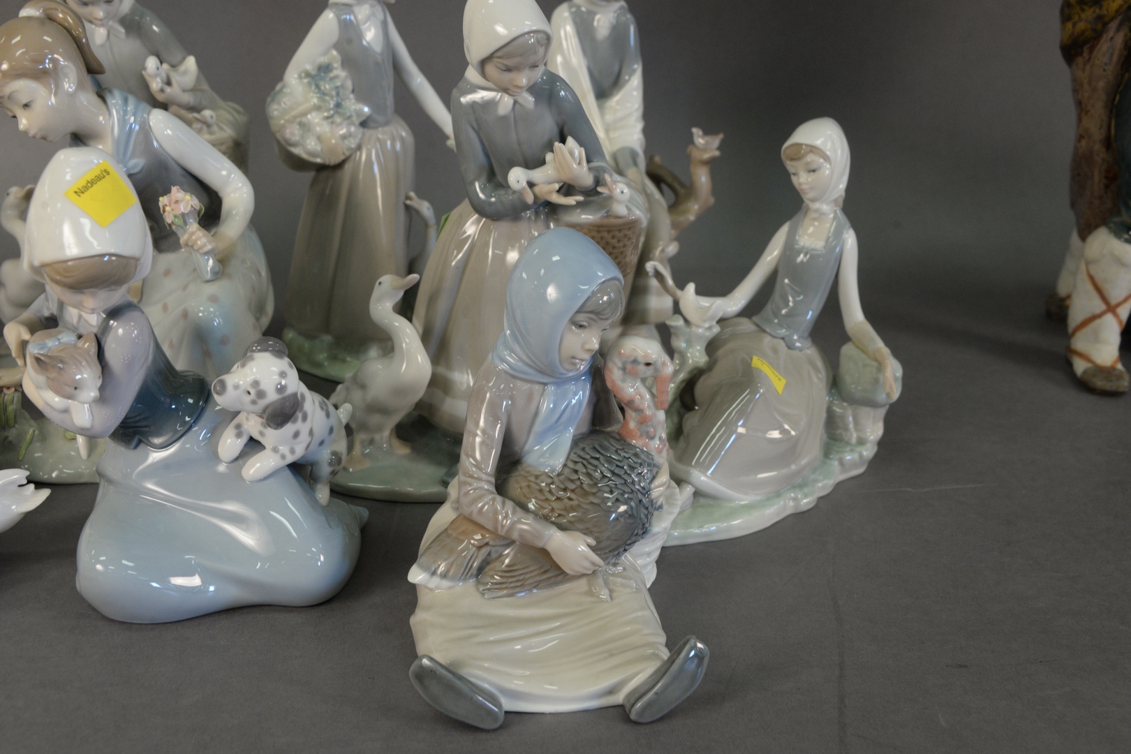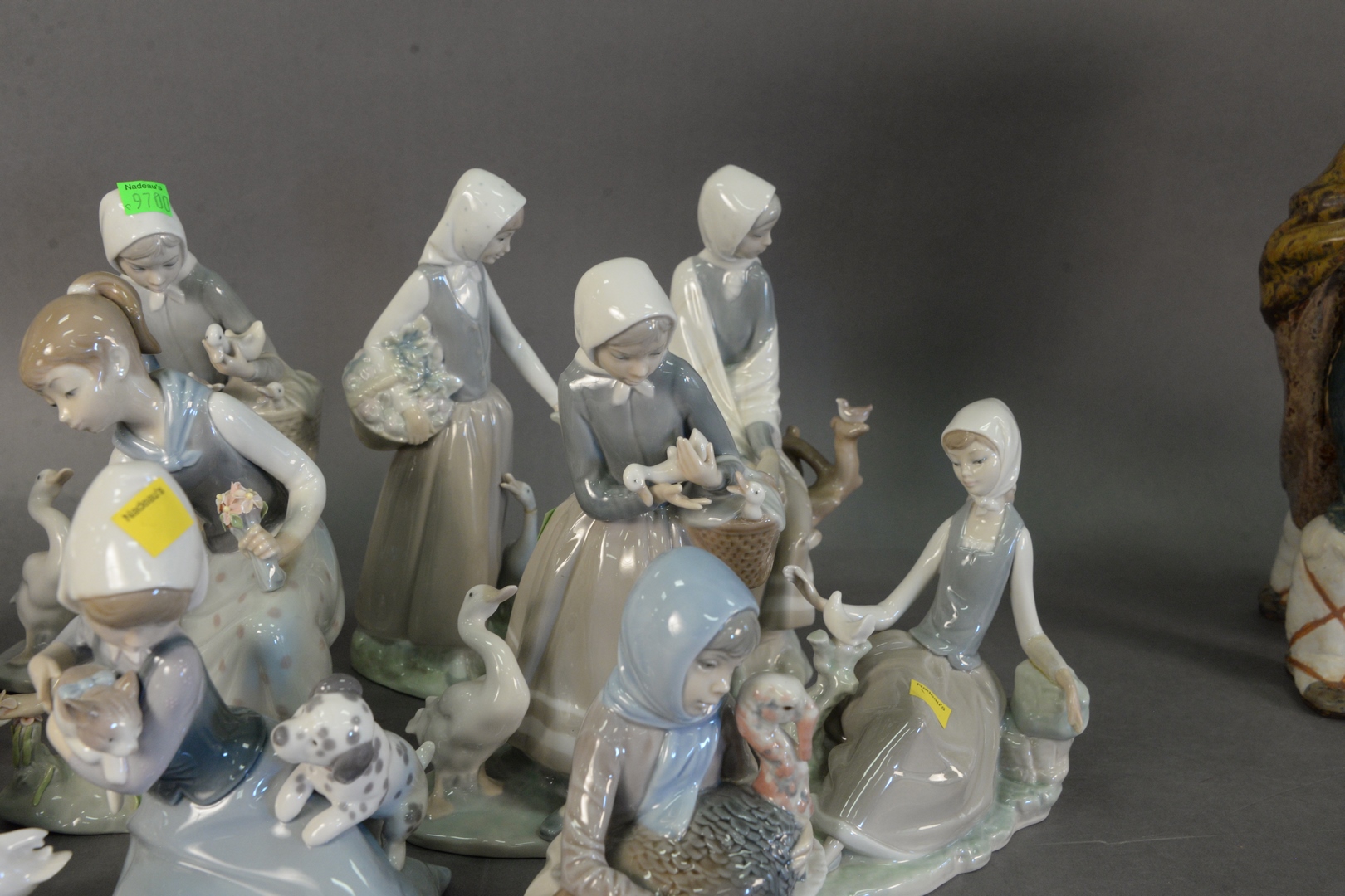 Ten Piece Group of Lladro Porcelain Figures, to include girls holding ducks, puppies, and a turkey; each marked to the underside, some having minor breaks and repairs, height of tallest 9 3/4 inches. Provenance: Estate of James Wadhams