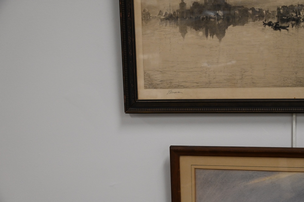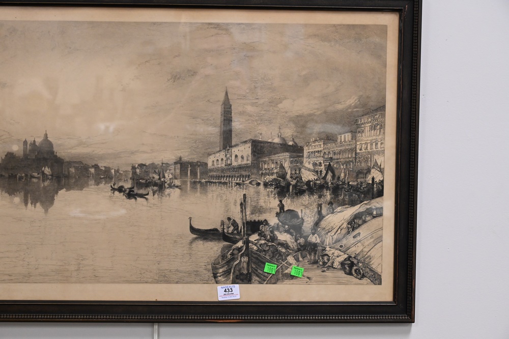 Lot 433: Two Framed Pieces, to include Thomas Moran (1837 – 1926), “Bacino di San Marco at Sunset”, canal engraving with drypoint, pencil signed lower left T. Moran; along with Abraham Lincoln 1891 photograph by M. P. Rice, Provenance: Estate of James Dana English of New Haven to benefit the New Haven Museum.