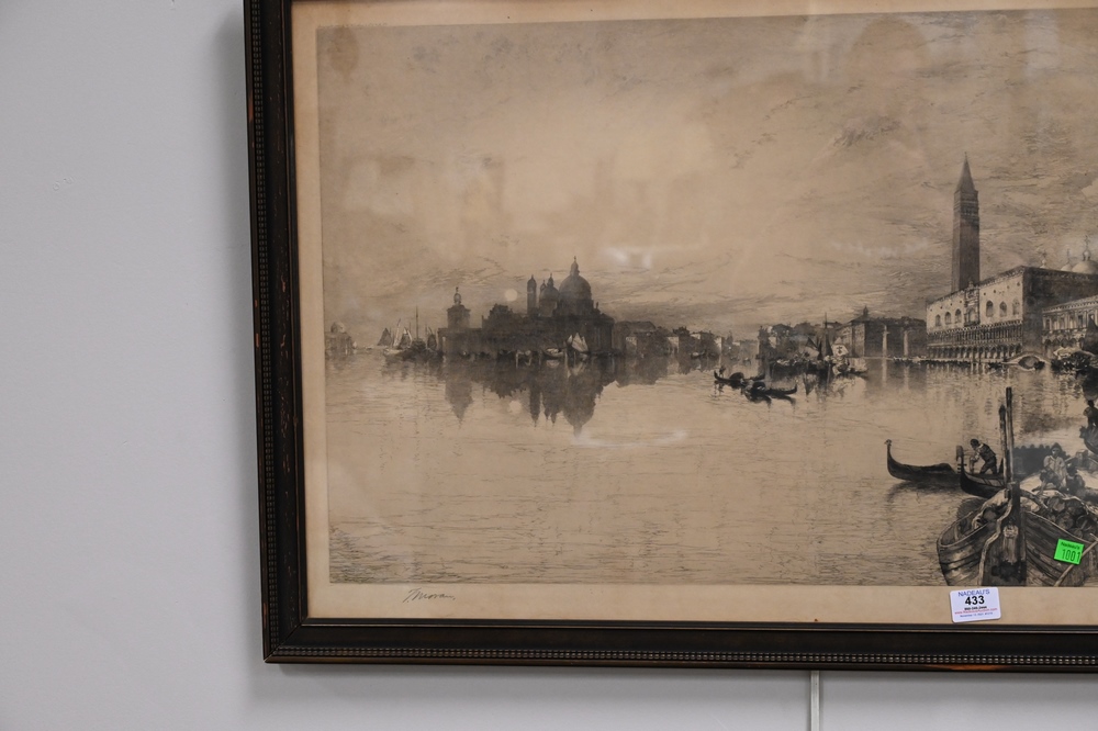Two Framed Pieces, to include Thomas Moran (1837 – 1926), “Bacino di San Marco at Sunset”, canal engraving with drypoint, pencil signed lower left T. Moran; along with Abraham Lincoln 1891 photograph by M. P. Rice, Provenance: Estate of James Dana English of New Haven to benefit the New Haven Museum.