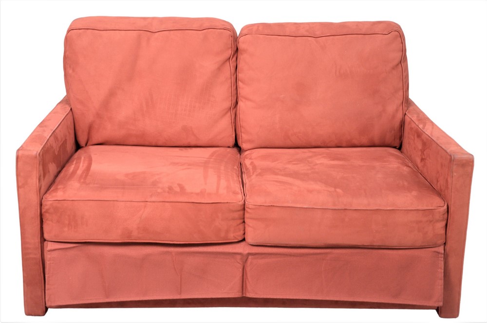 Upholstered Two Cushion Sleeper Sofa, height 38 inches, length 62 inches, depth 39 inches.