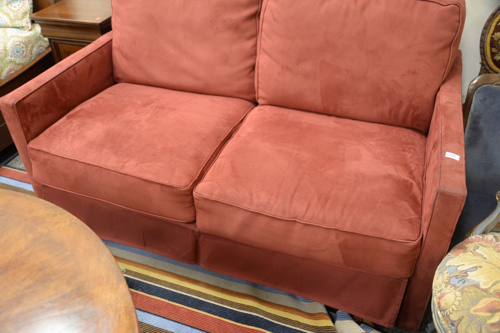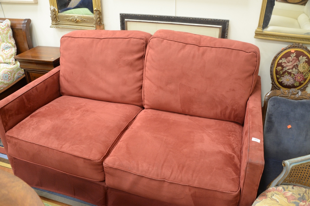 Lot 433: Upholstered Two Cushion Sleeper Sofa, height 38 inches, length 62 inches, depth 39 inches.
