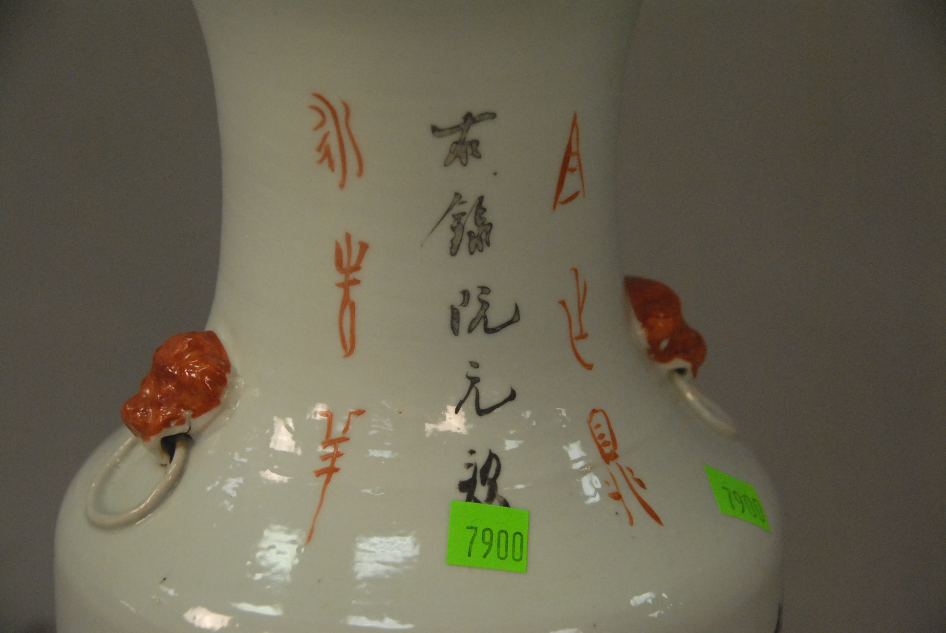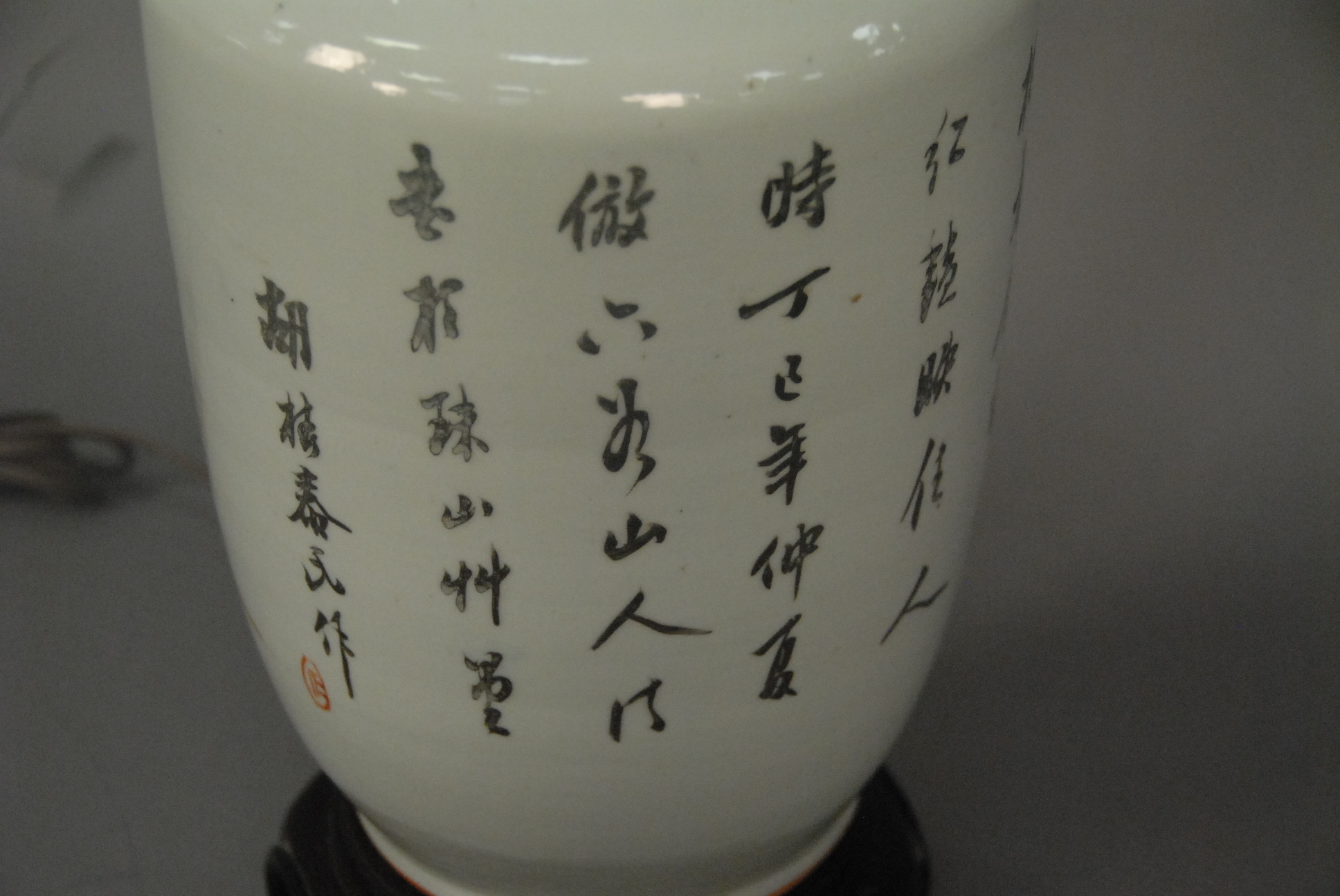 Lot 433B: Famille Rose porcelain baluster vase made into a lamp with molded foo dog handles, a painted scene on one side with Guanyin figure with children and charachter marks on the other, ht. 18 in. Provenance: Property from a Private Collection Sold