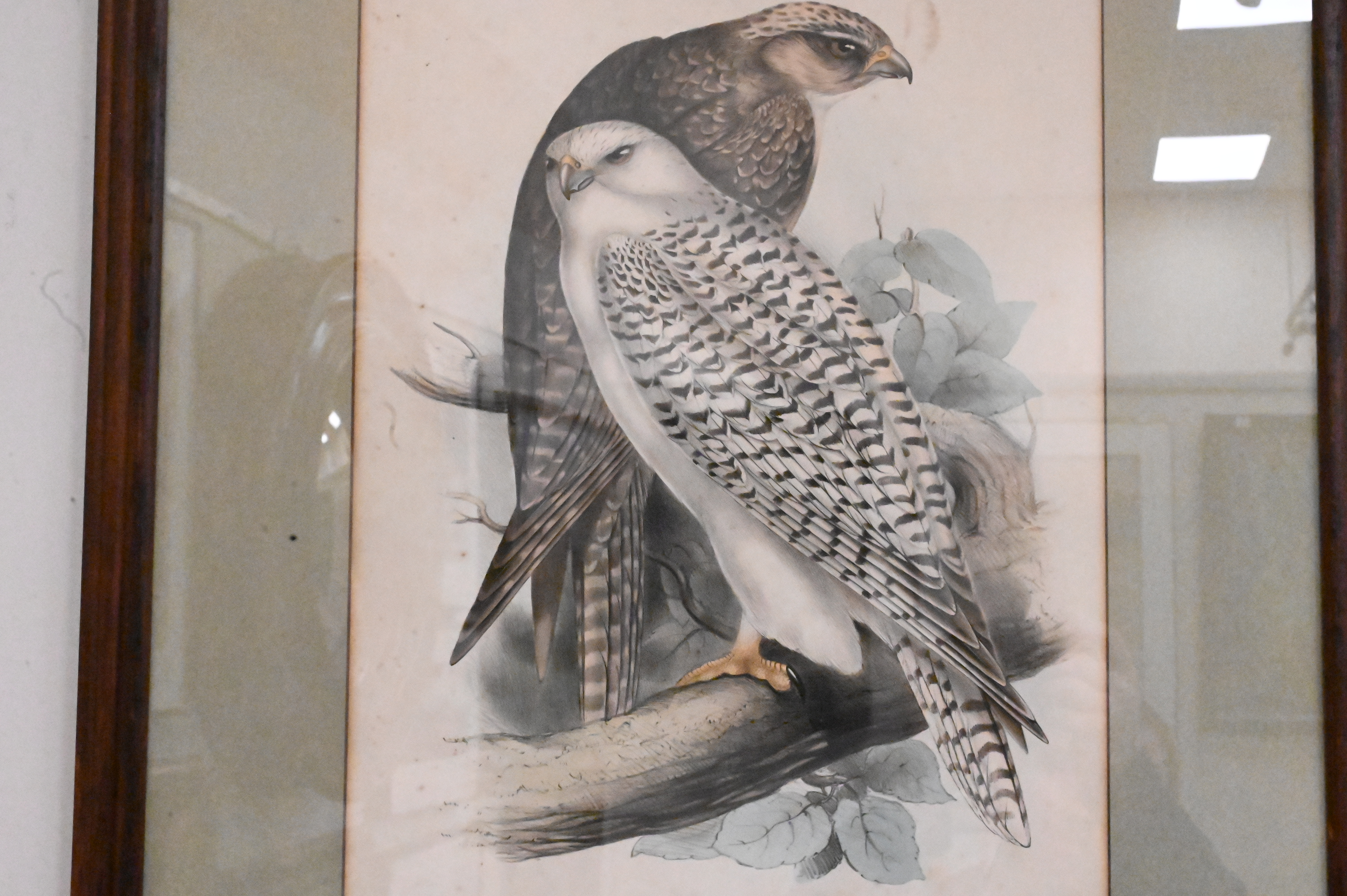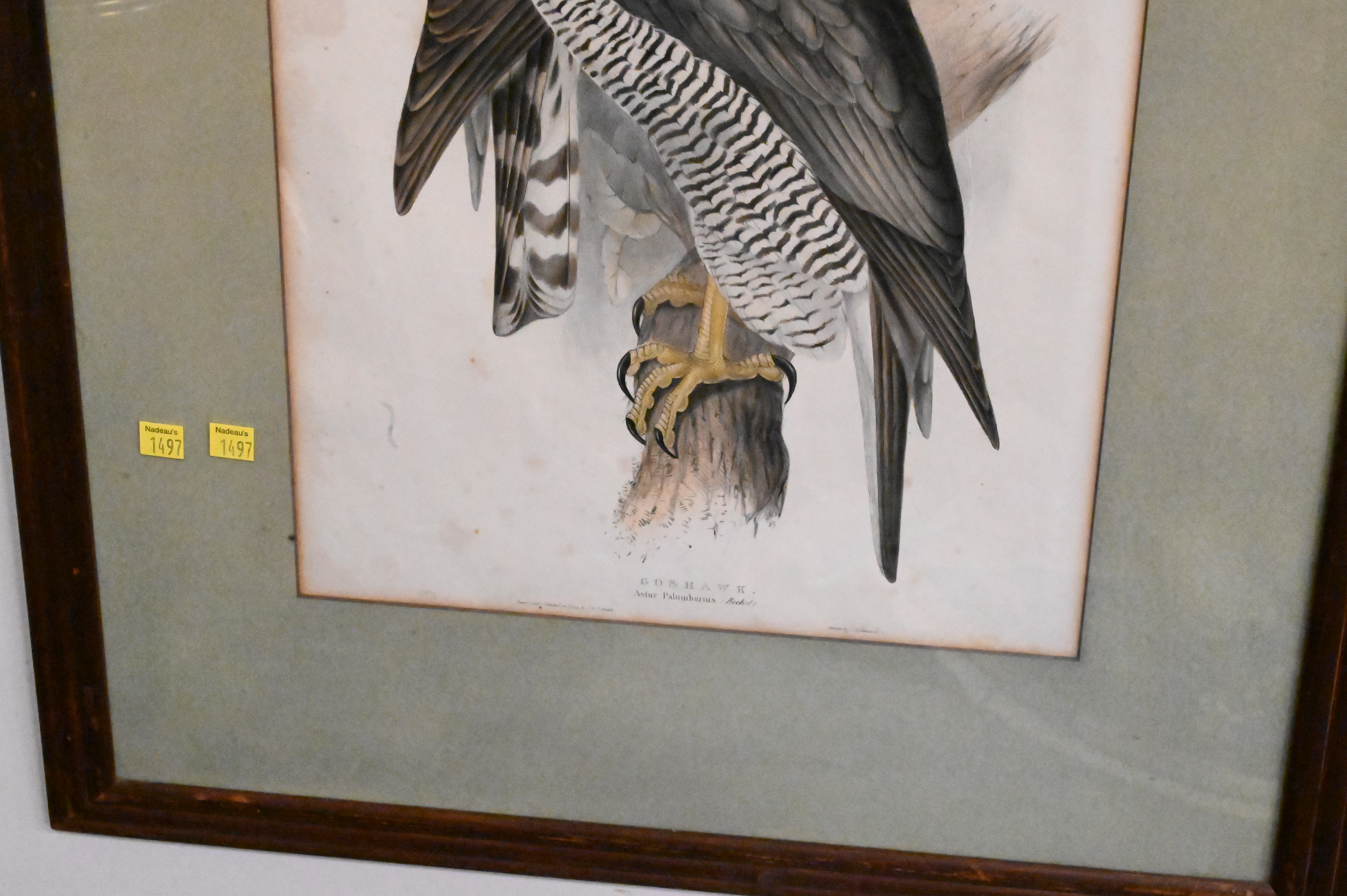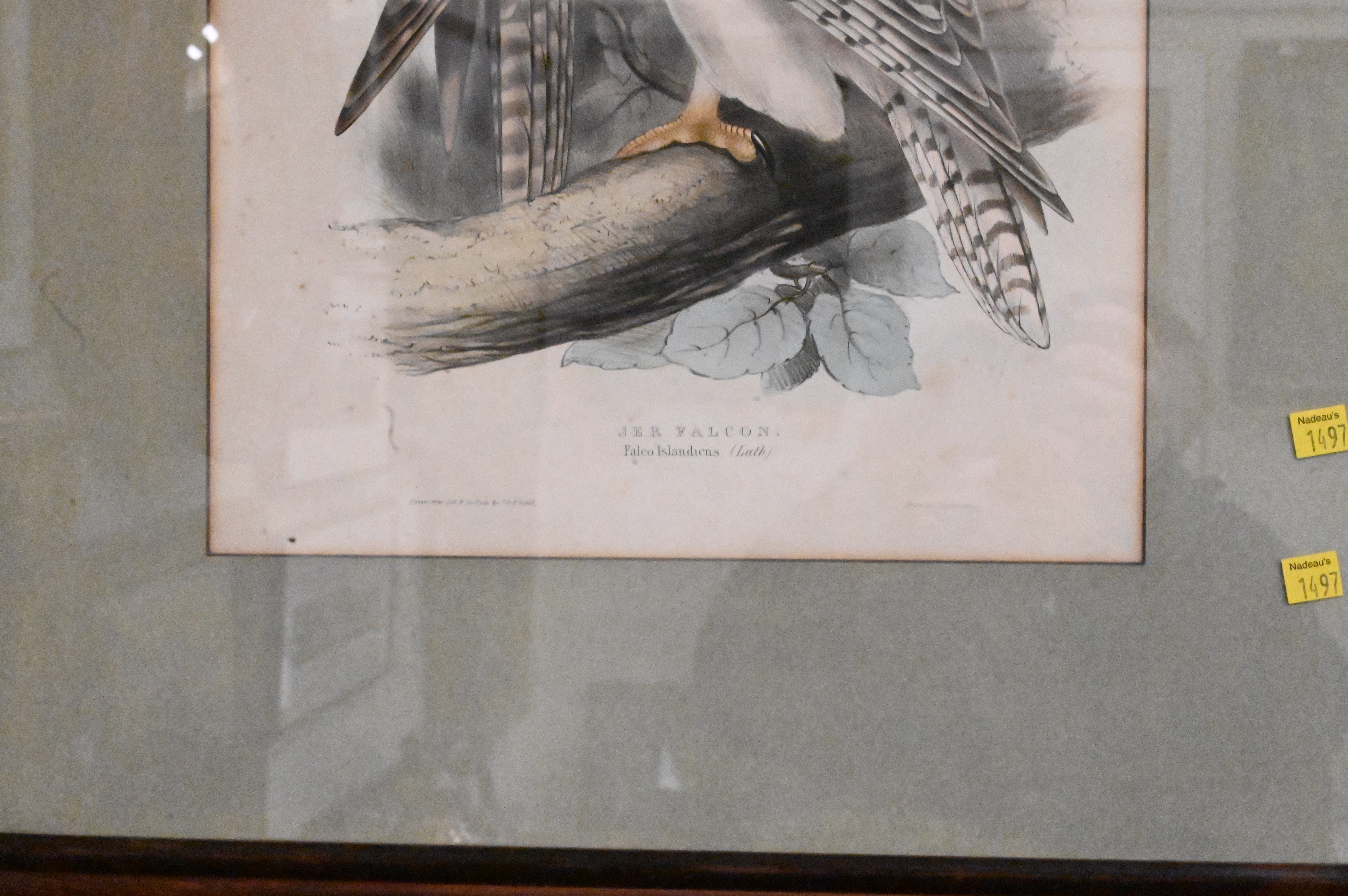 A Pair of John Gould Colored Lithographs, to include ‘Goshawk’, ‘Jer Falcon, Falco Islandicus’, drawn from life and on stone by J & E Gould, printed by Hullmandel, sight size 21″ x 13 3/4 “.