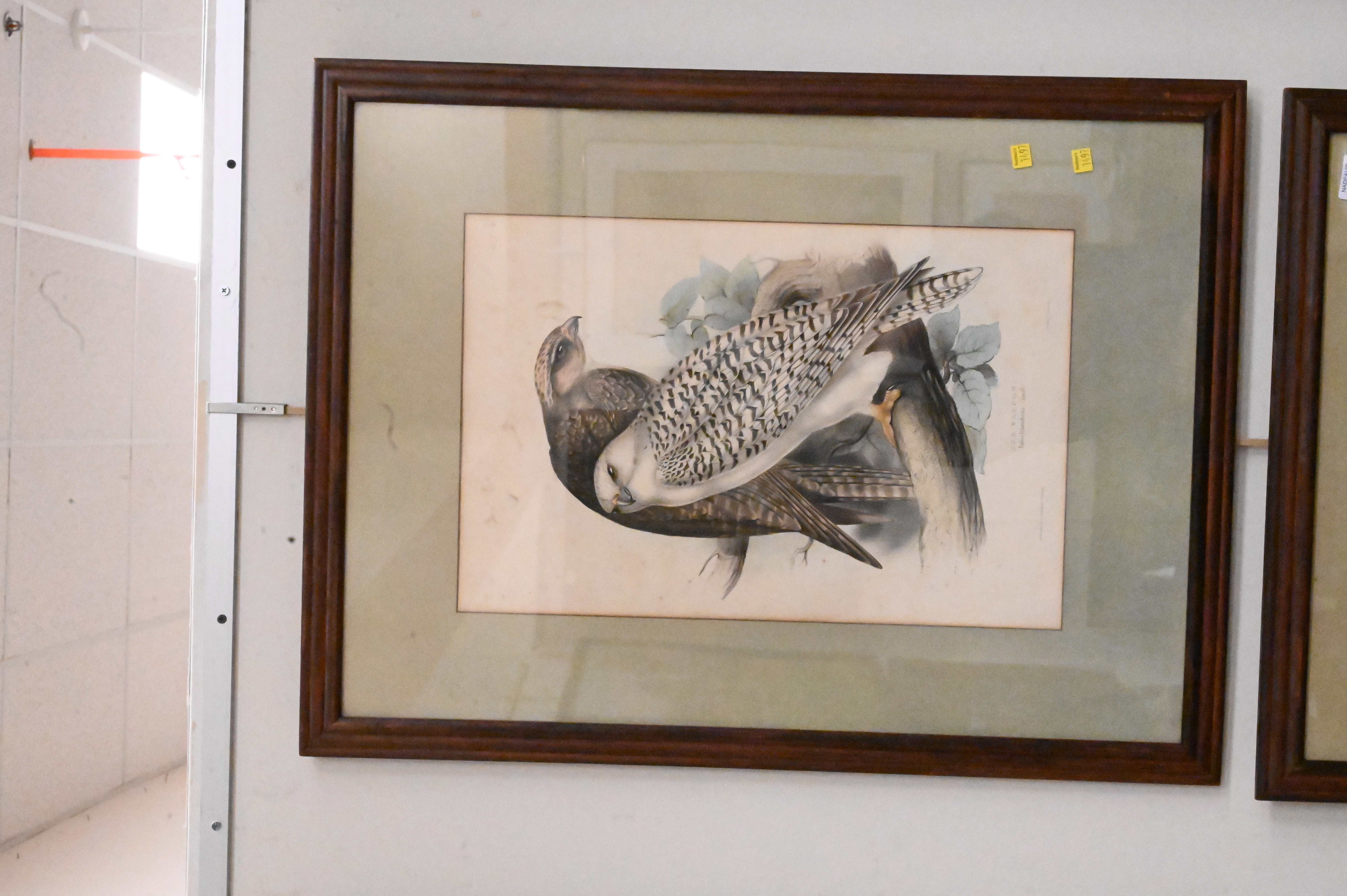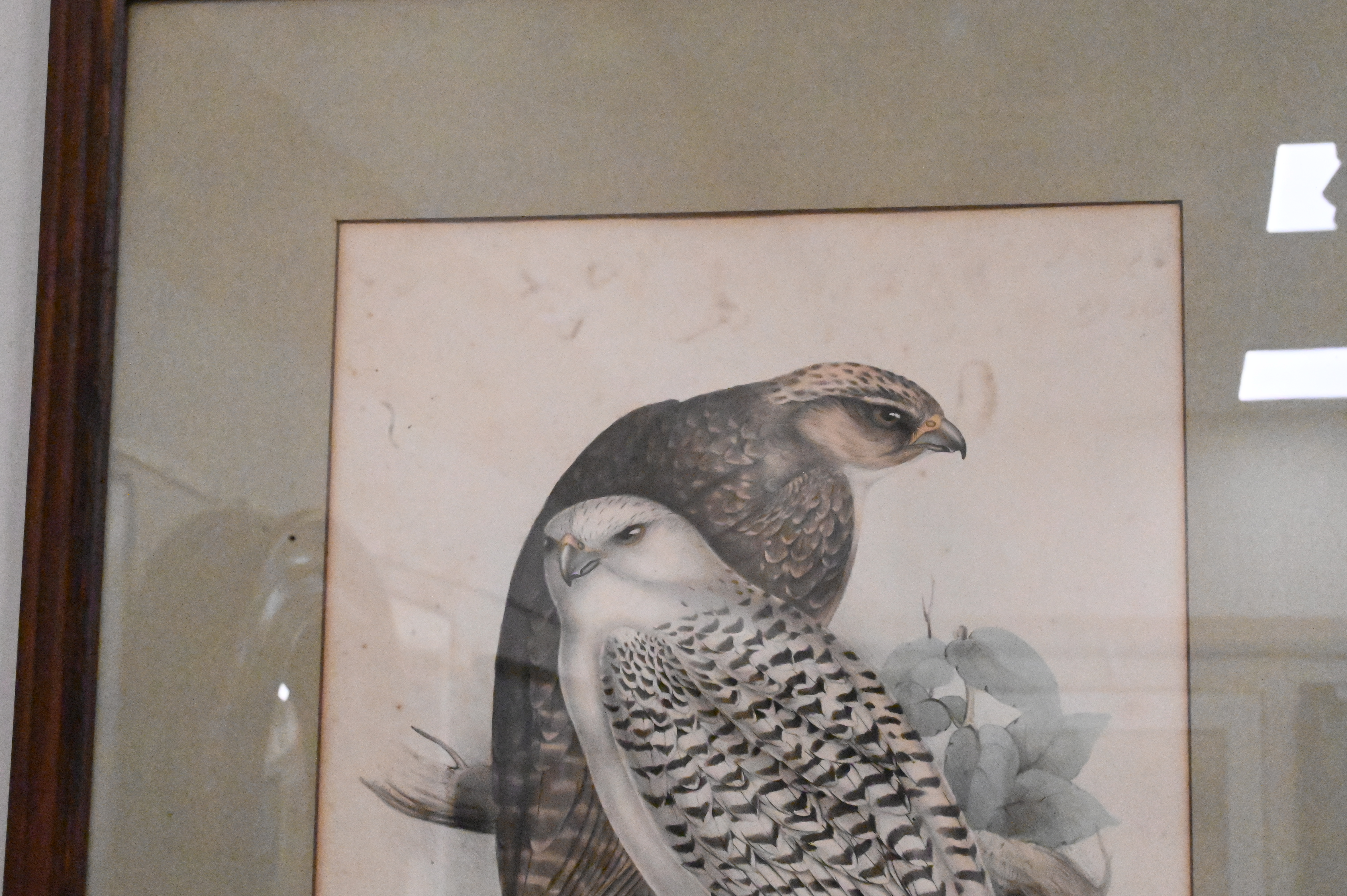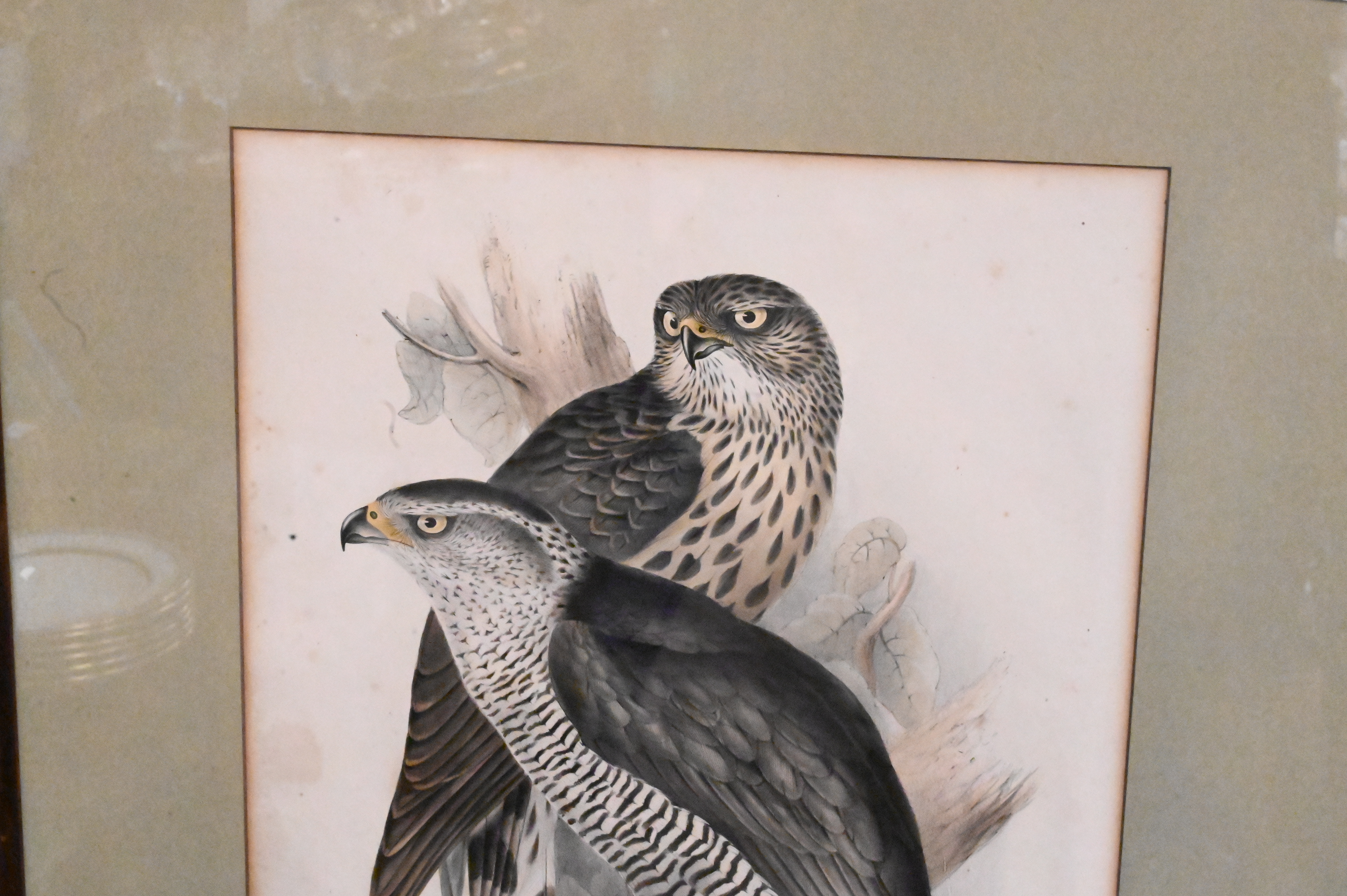 A Pair of John Gould Colored Lithographs, to include ‘Goshawk’, ‘Jer Falcon, Falco Islandicus’, drawn from life and on stone by J & E Gould, printed by Hullmandel, sight size 21″ x 13 3/4 “.
