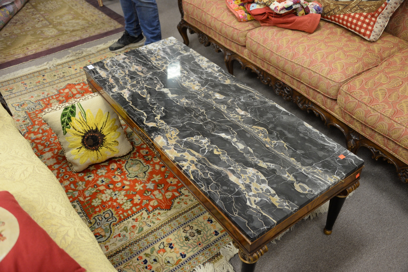 Lot 434: Continental Style Coffee Table, with gray marble top, height 17 inches, top 21 x 50. Provenance: Matthes-Theriault Collection, Woo…