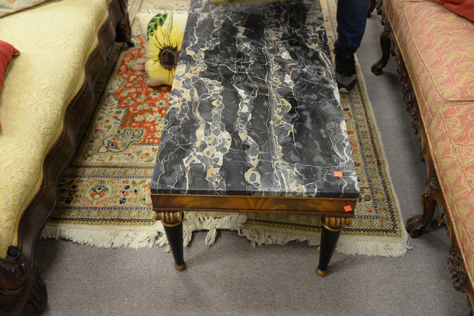Continental Style Coffee Table, with gray marble top, height 17 inches, top 21 x 50. Provenance: Matthes-Theriault Collection, Woodbridge, Connecticut.