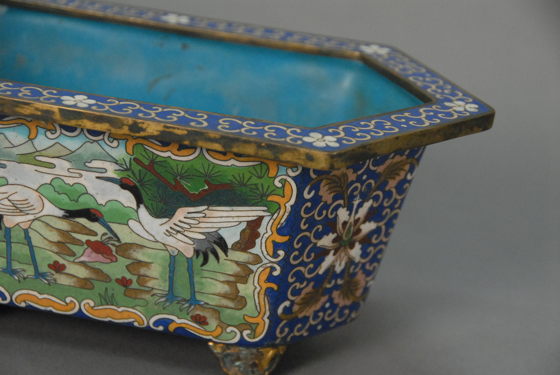 Four piece lot to include a group of three cloisonn vases with black ground, including a pair decorated with pink peonies, ht. 6in., and a single vase with orange chrysanthemums. ht. 9in. along with Hexagonal cloisonn footed planter decorated with cranes lg. 10in. wd. 5 3/4in., China 20th century.