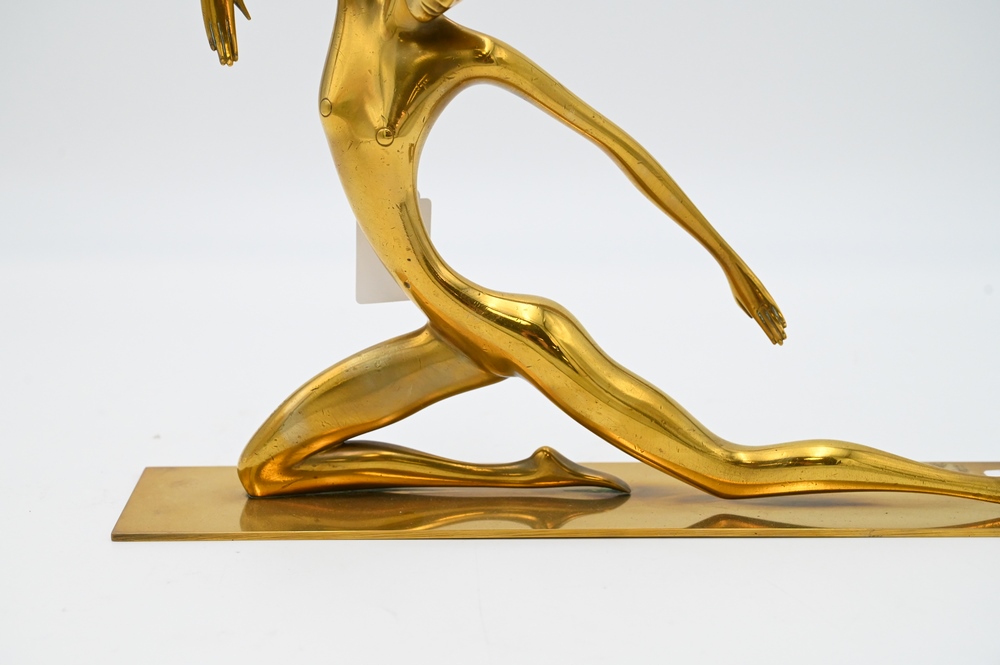 Franz Hagenauer (Austrian, 1906 – 1986), brass sculpture of a woman posing, dancing bookend, marked on base, height 9 3/4 inches, length 14 1/5 inches.