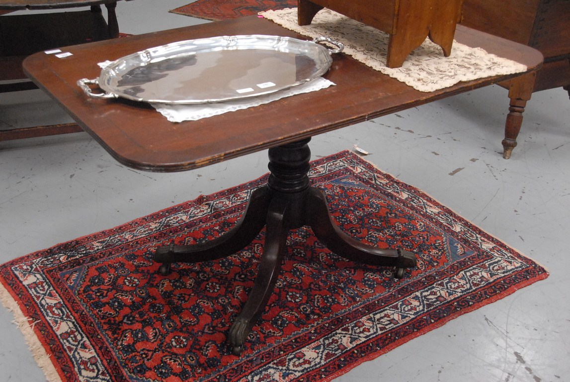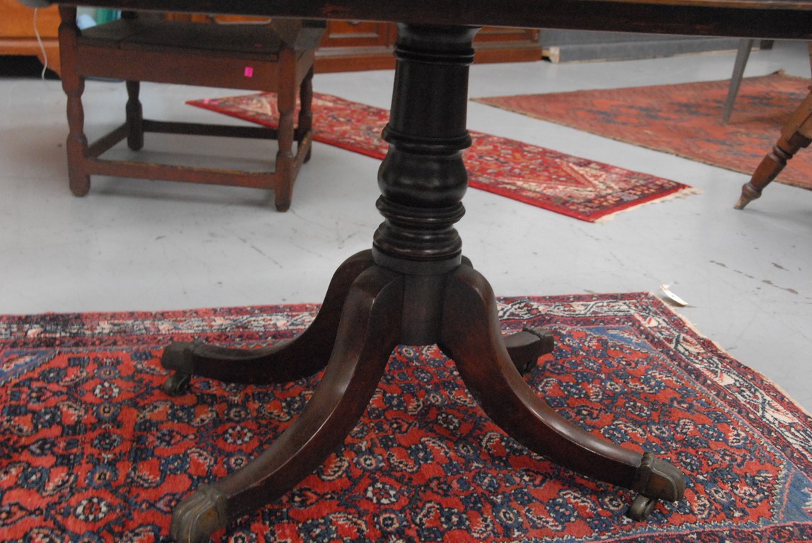 Lot 434: George IV mahogany breakfast tip table on turned shaft with tripod base ending in brass paw feet.