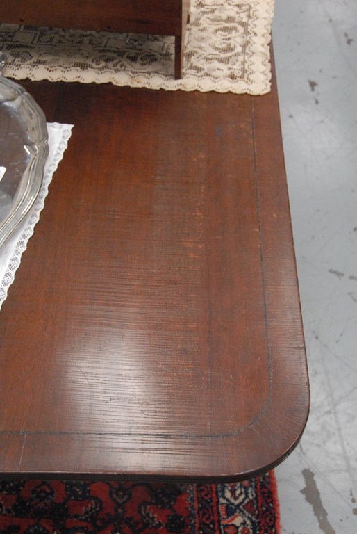 George IV mahogany breakfast tip table on turned shaft with tripod base ending in brass paw feet. ht. 27 1/2in. top: 31 x 48