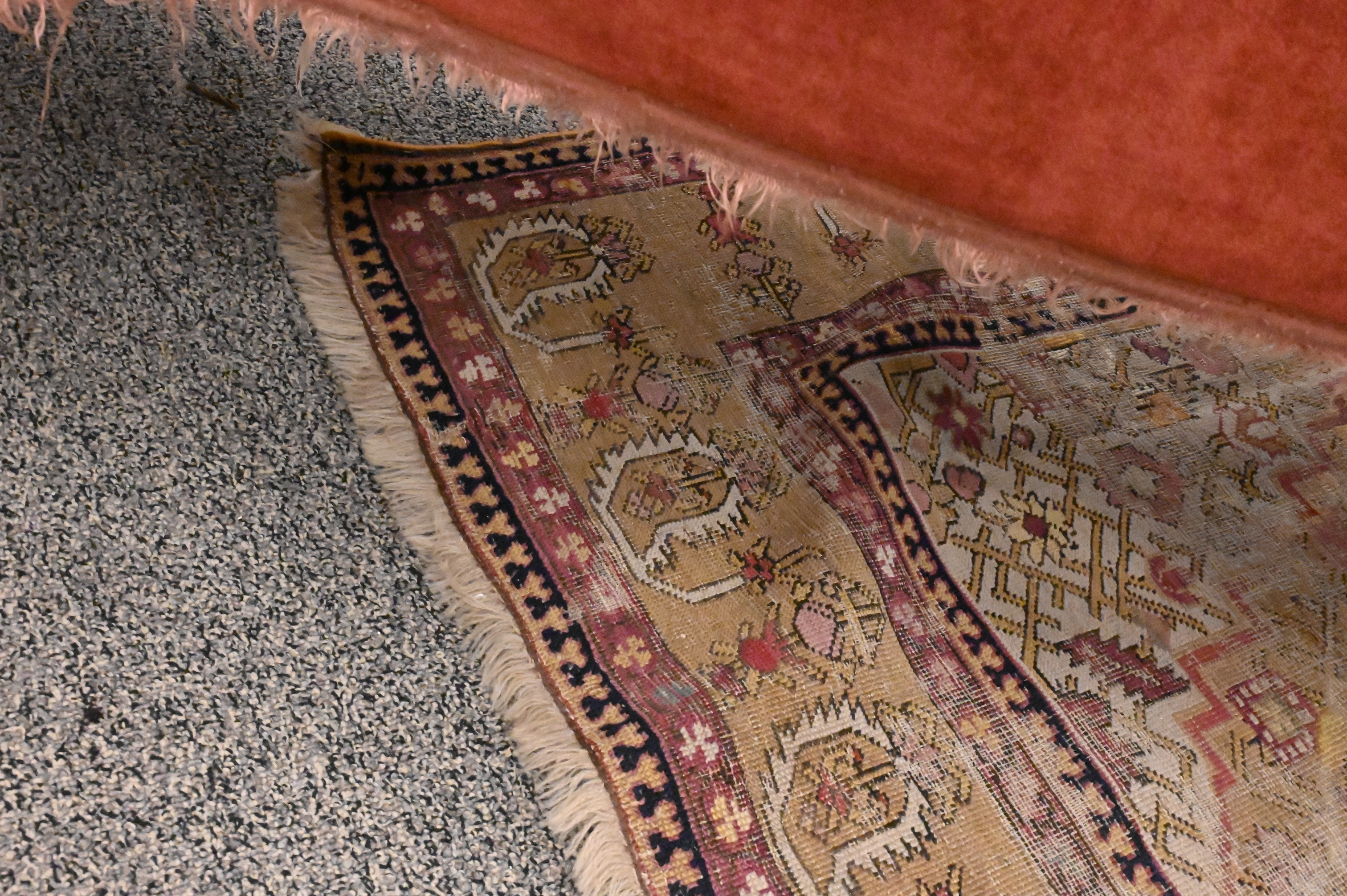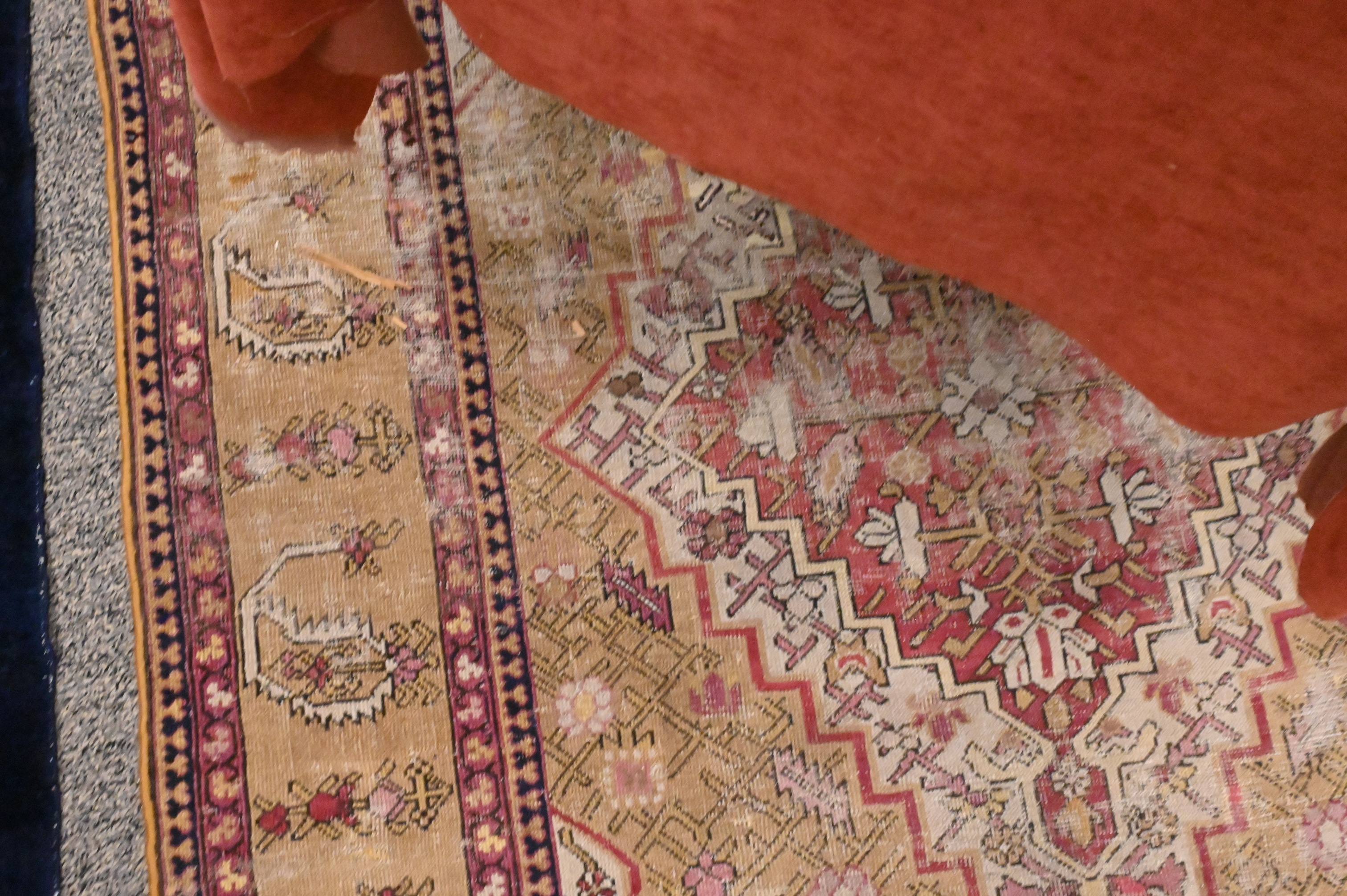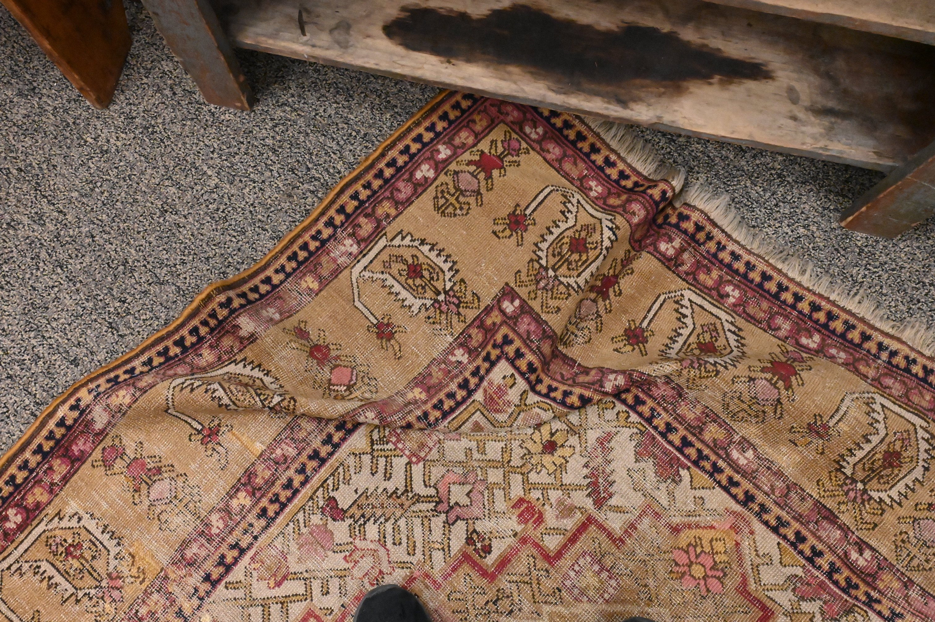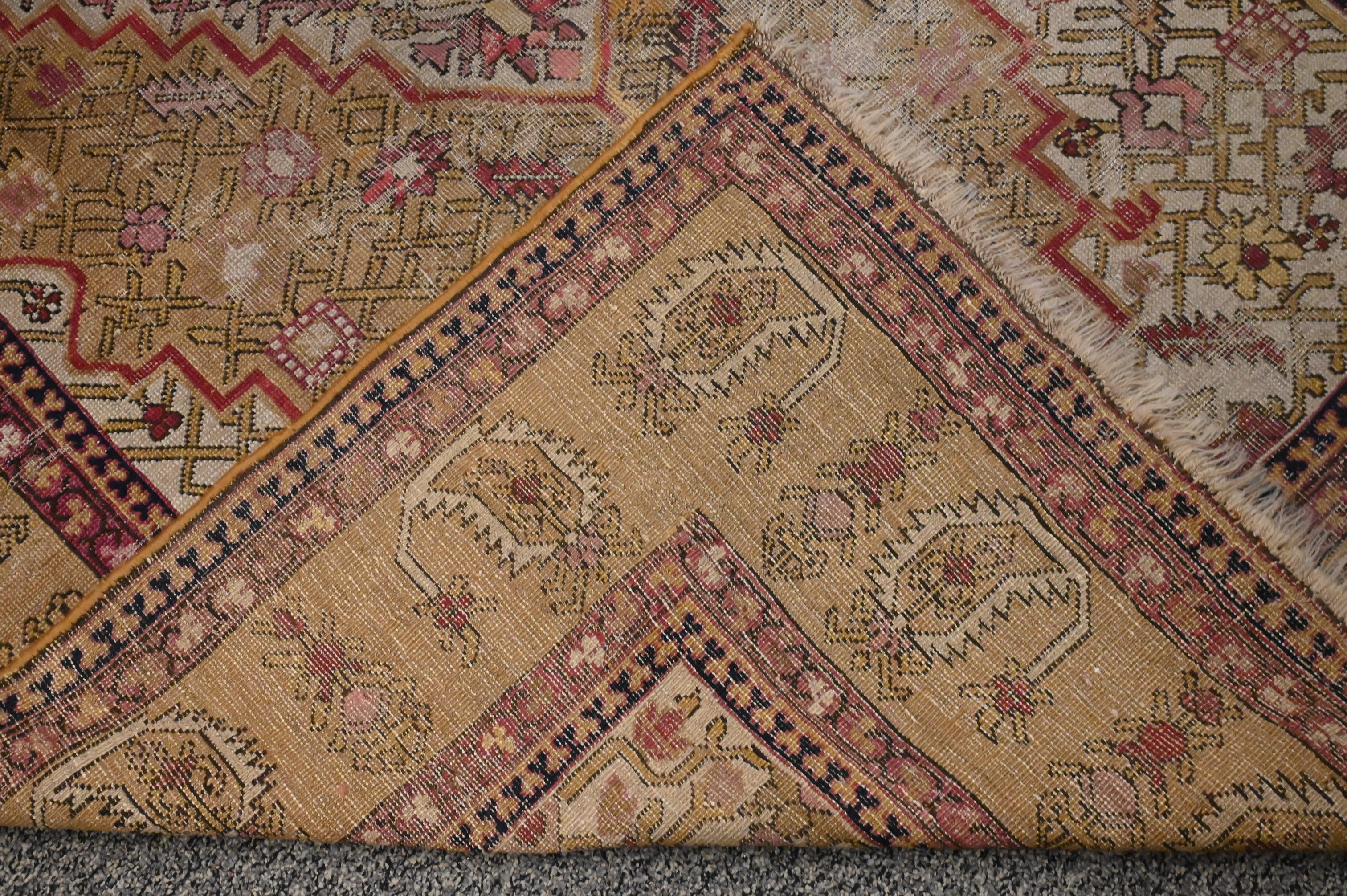pale gold ground with a central stepped diamond form lattice design surrounded by an outer border of stylized “botehs” and leaves, South Caucasus, late 19th Century