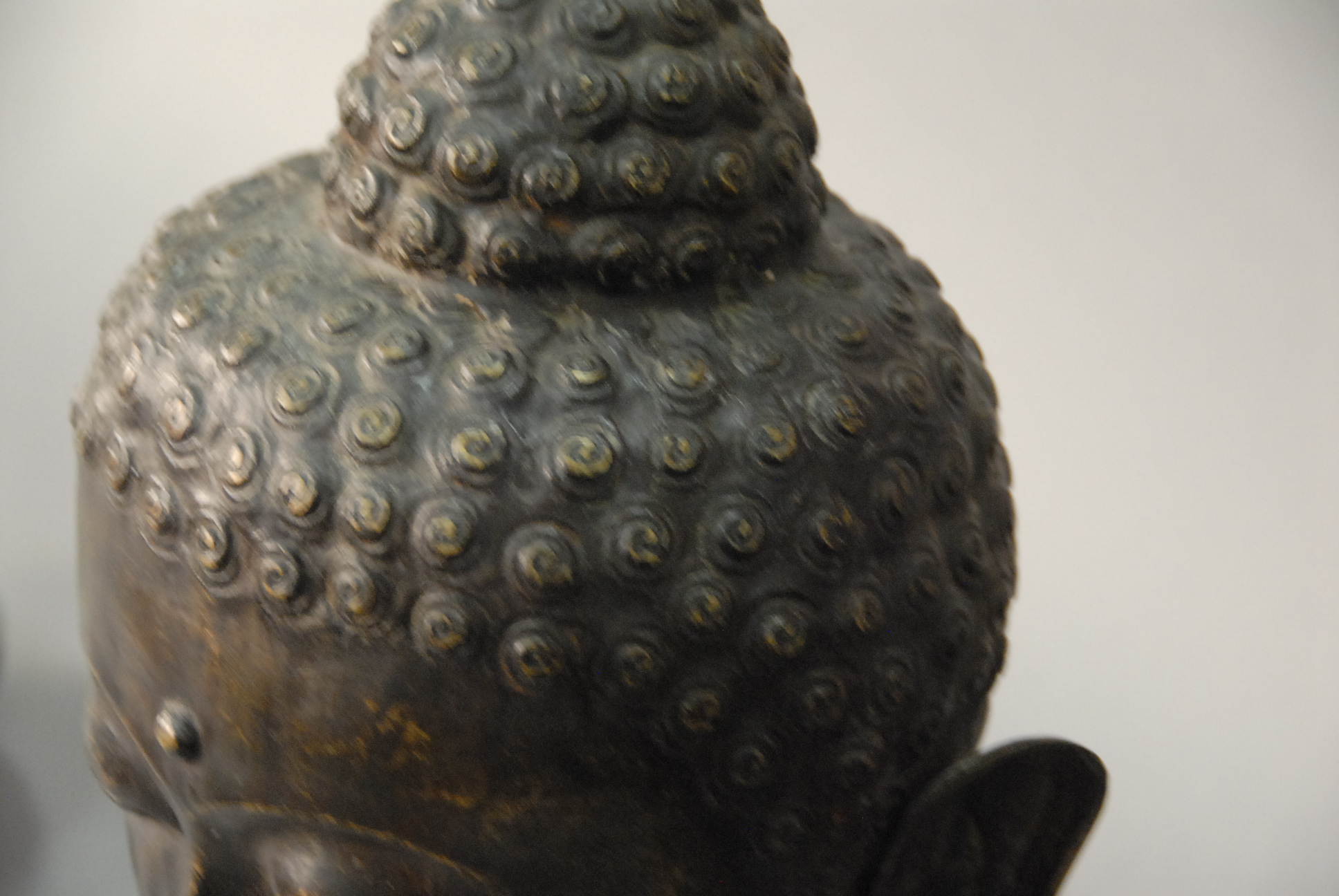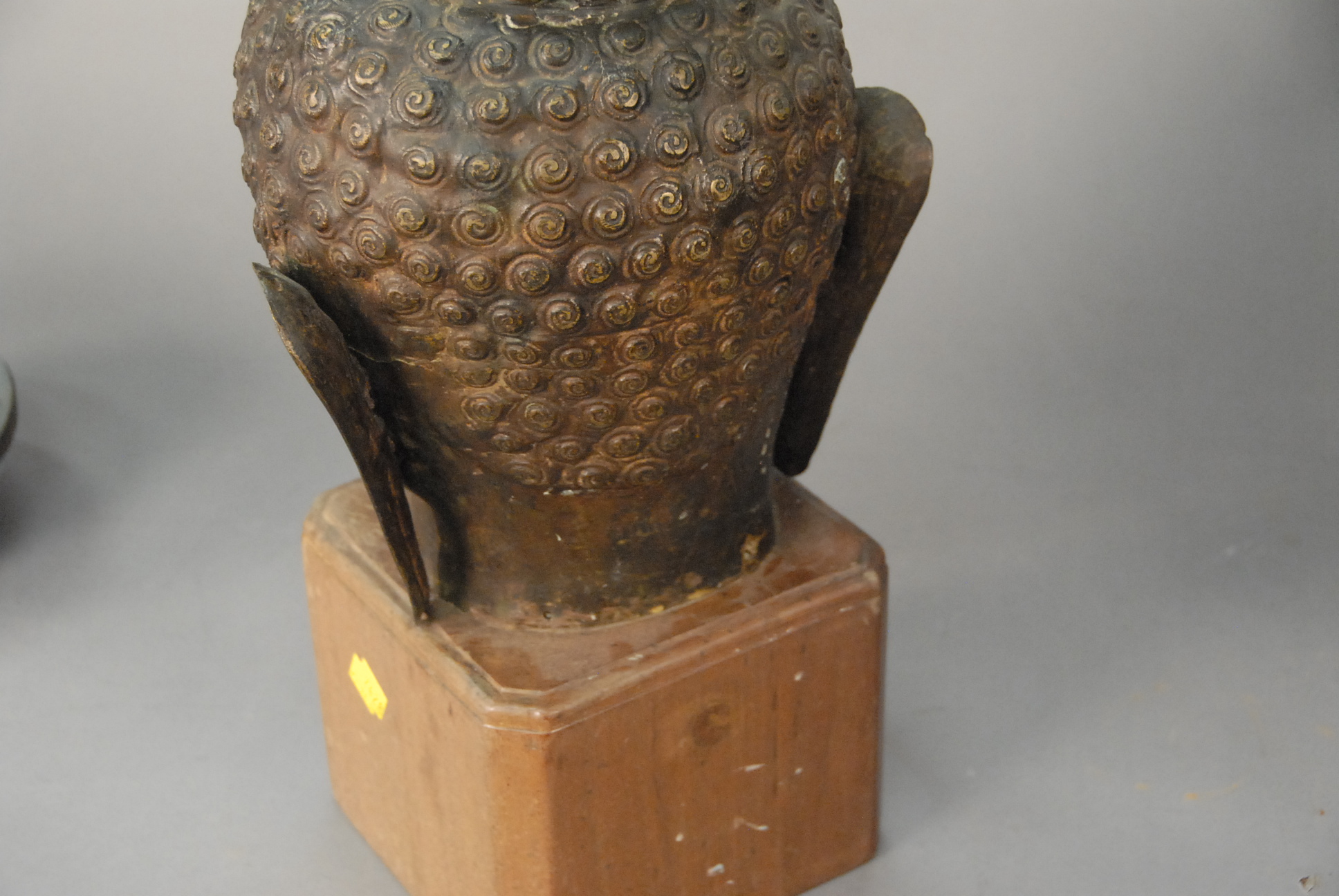 Large bronze head of a Buddha set on wood base.