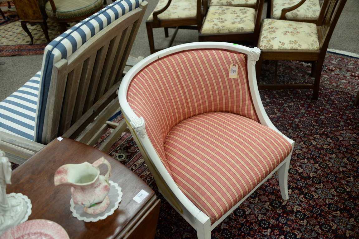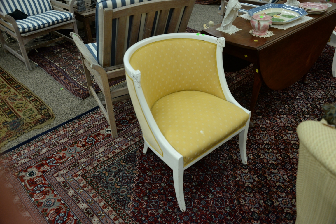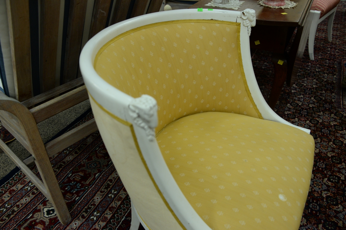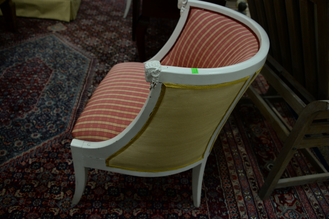 Pair of Continental style fauteuil with carved ram’s heads now painted white.