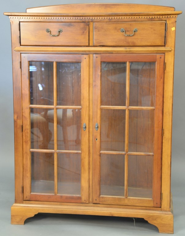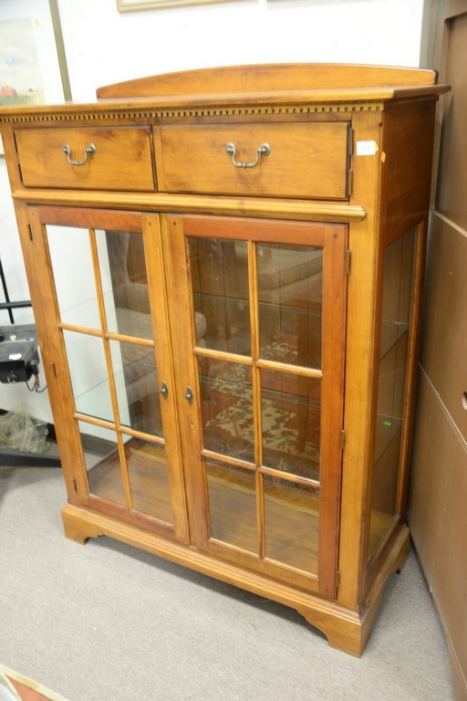 Pair of maple two door china cabinets with two door top and glass shelves, ht. 63 in. wd. 47 in. dp. 19 in.