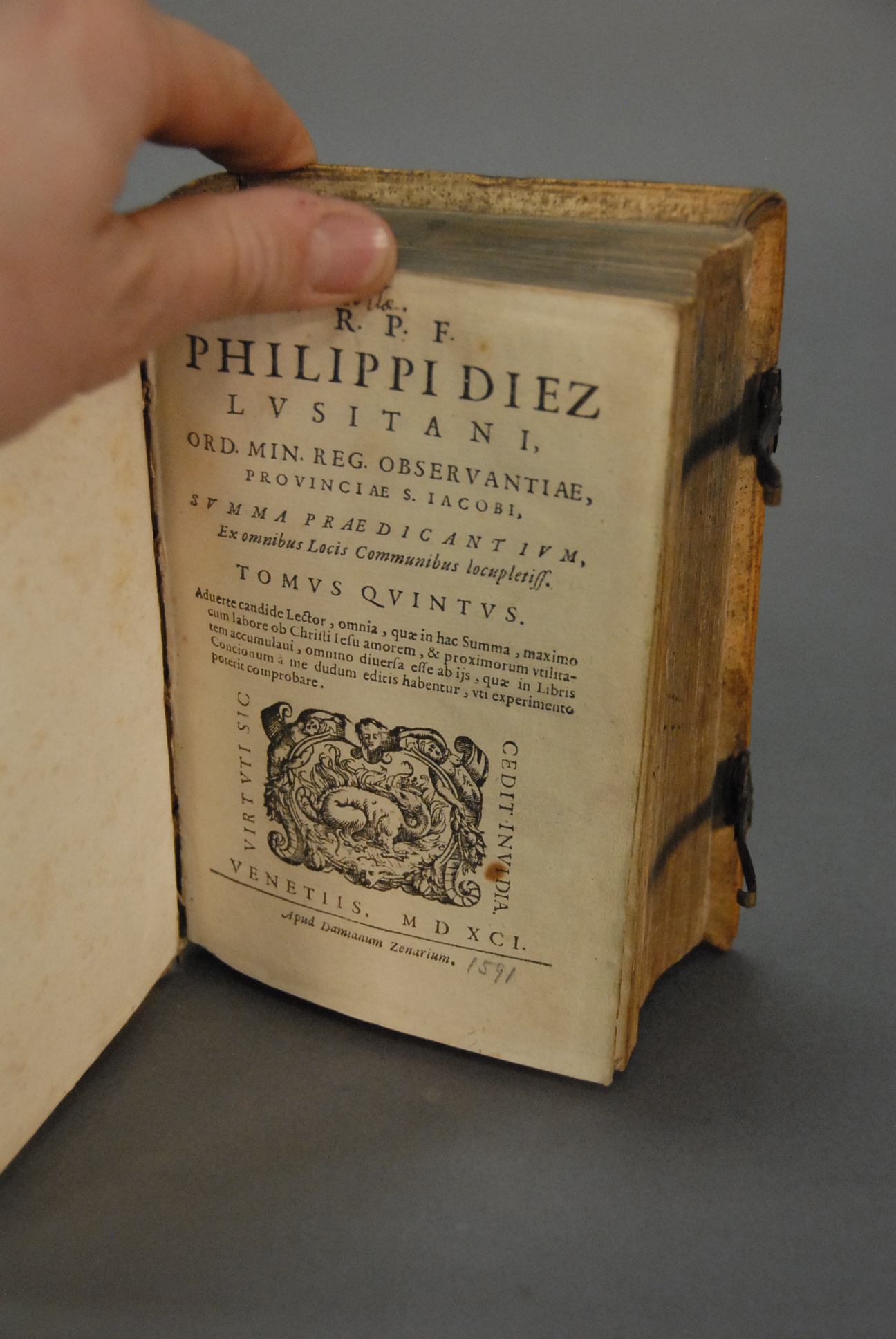 R.P.F. Philippi Diez CA 1550-1601 Ord. Min Reg Observantiae in Latin, Venice 1591, 678 pages, from the library of Theodore Weicker.