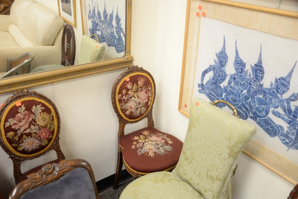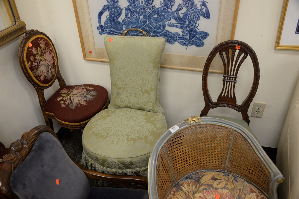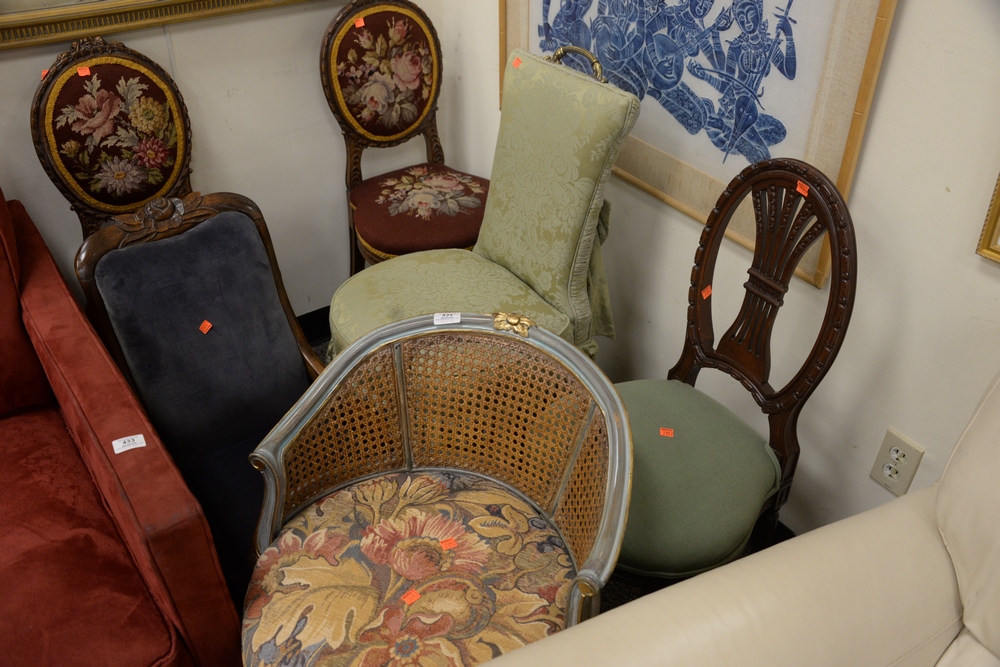 Lot 434: Six Piece Children’s Chair Lot, to include pair of needlepoint upholstered chairs, a rocker, a caned back swivel chair, etc.; talles…