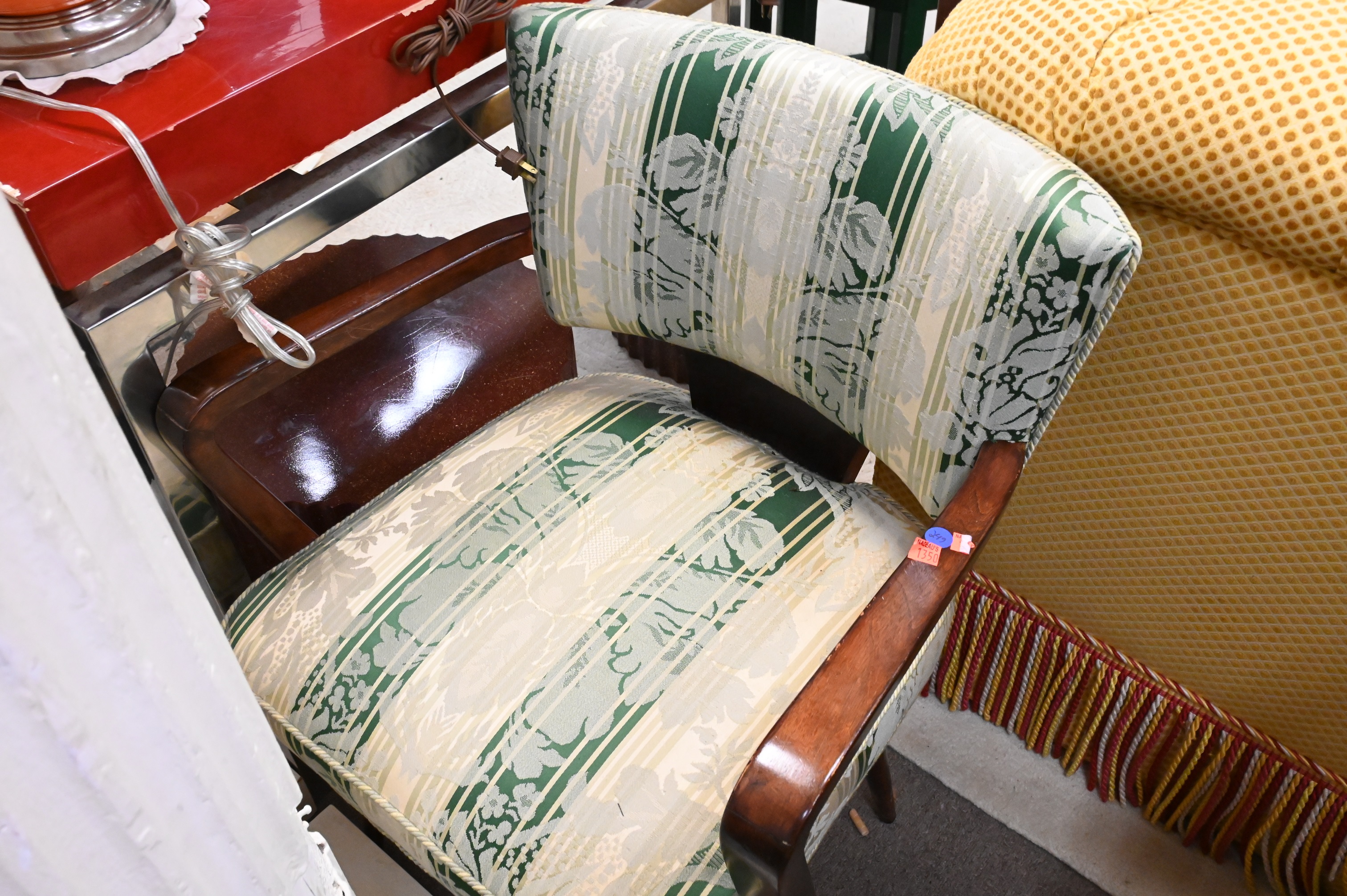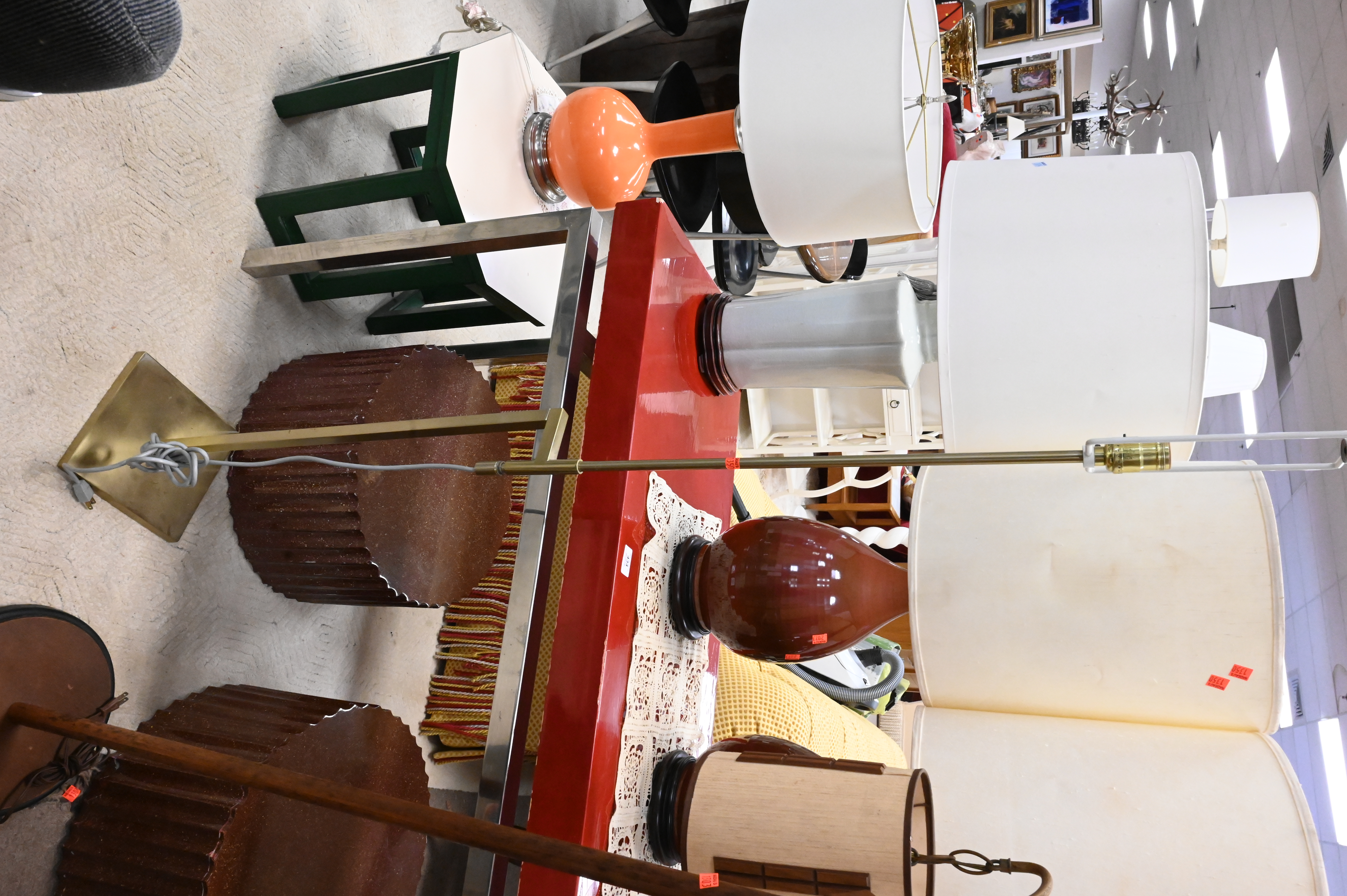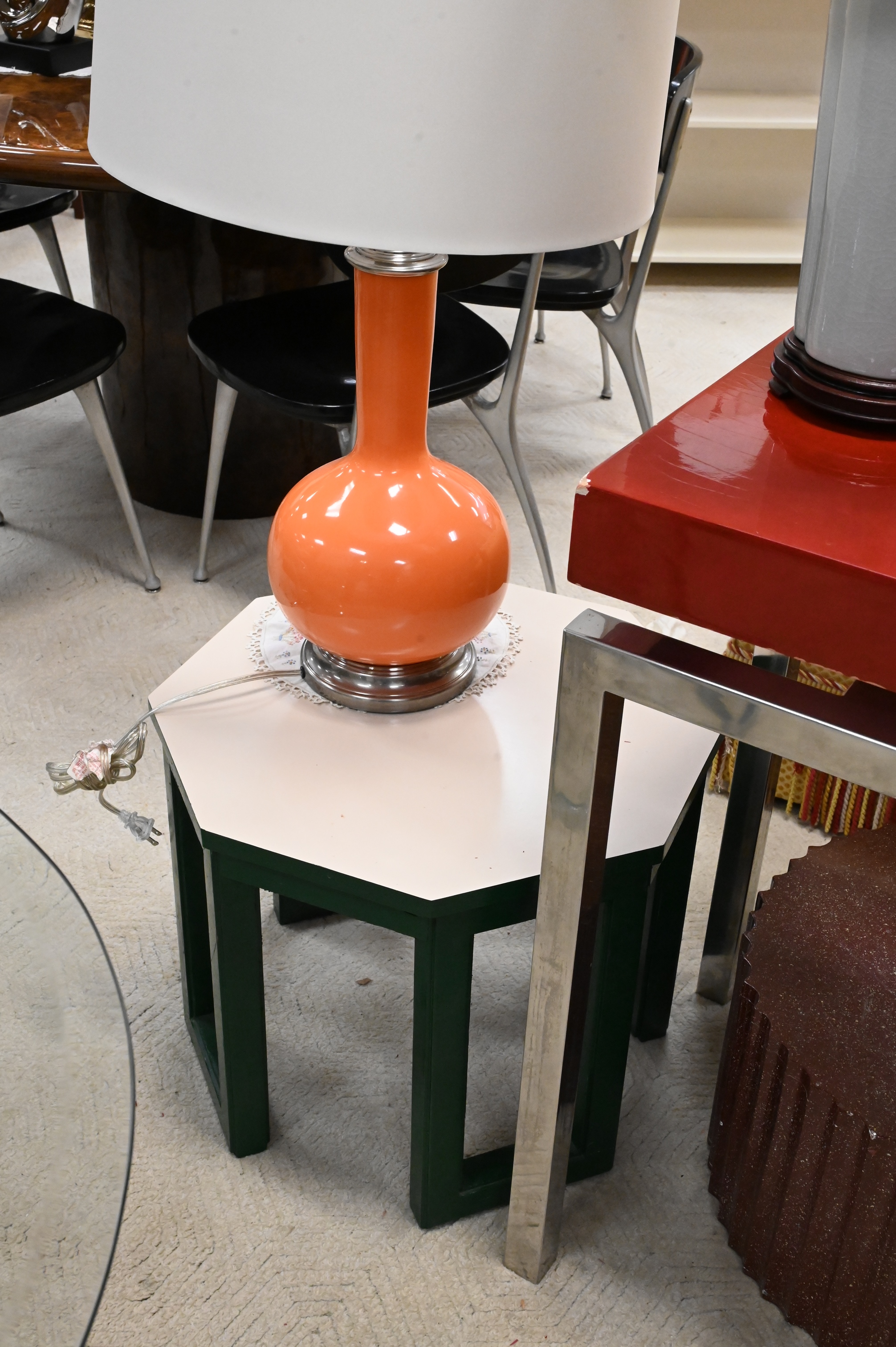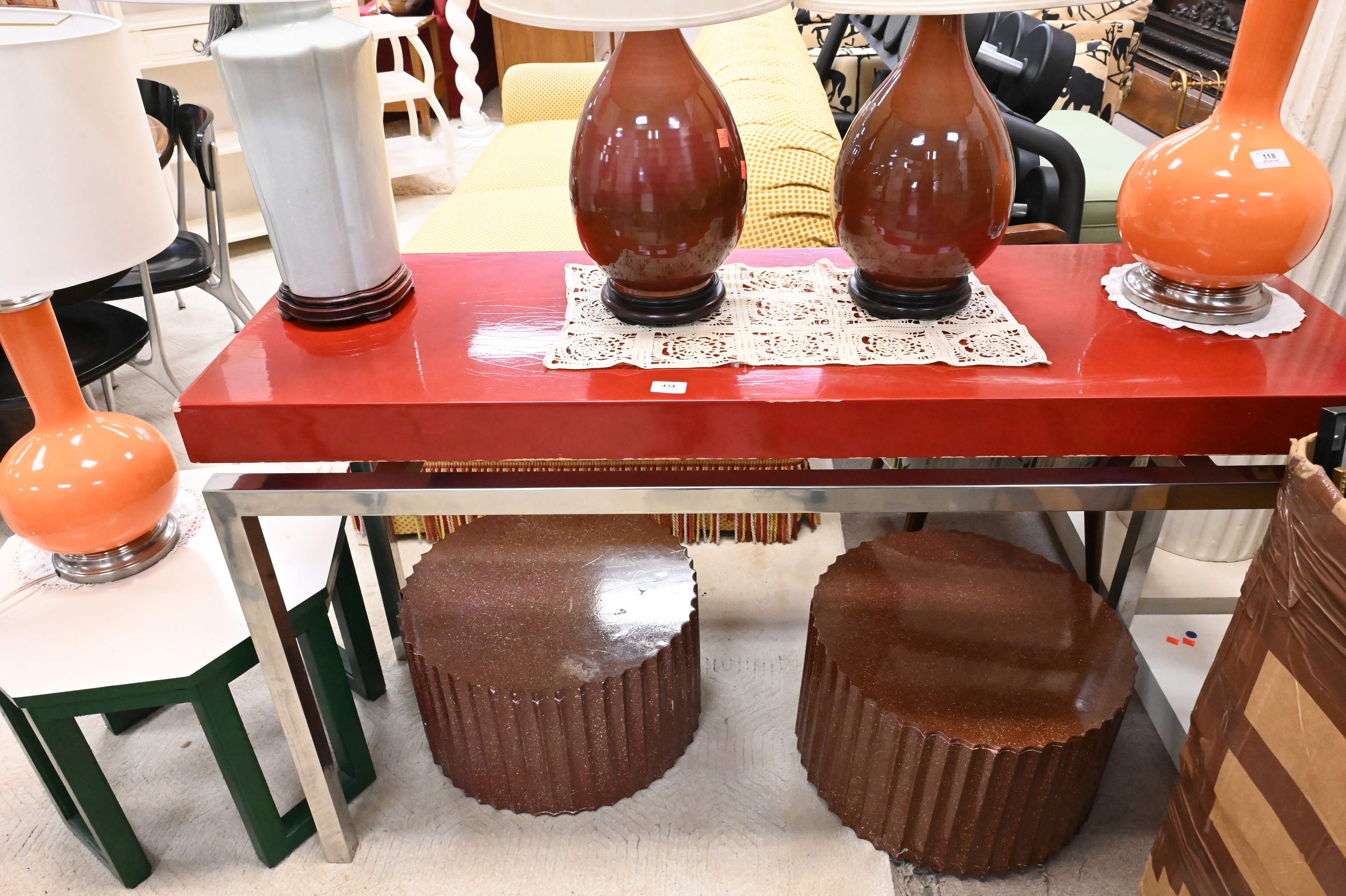 Six Piece Mid Century Modern Grouping, to include a red lacquered console table having chrome base, an upholstered armchair, a pair of round coffee table bases, an octagonal side table, height 32 inches, table top 18″ x 54″, along with a mid century modern brushed nickel floor lamp (no shade). Provenance: Property from a private New York collection sold to benefit charitable foundations.
