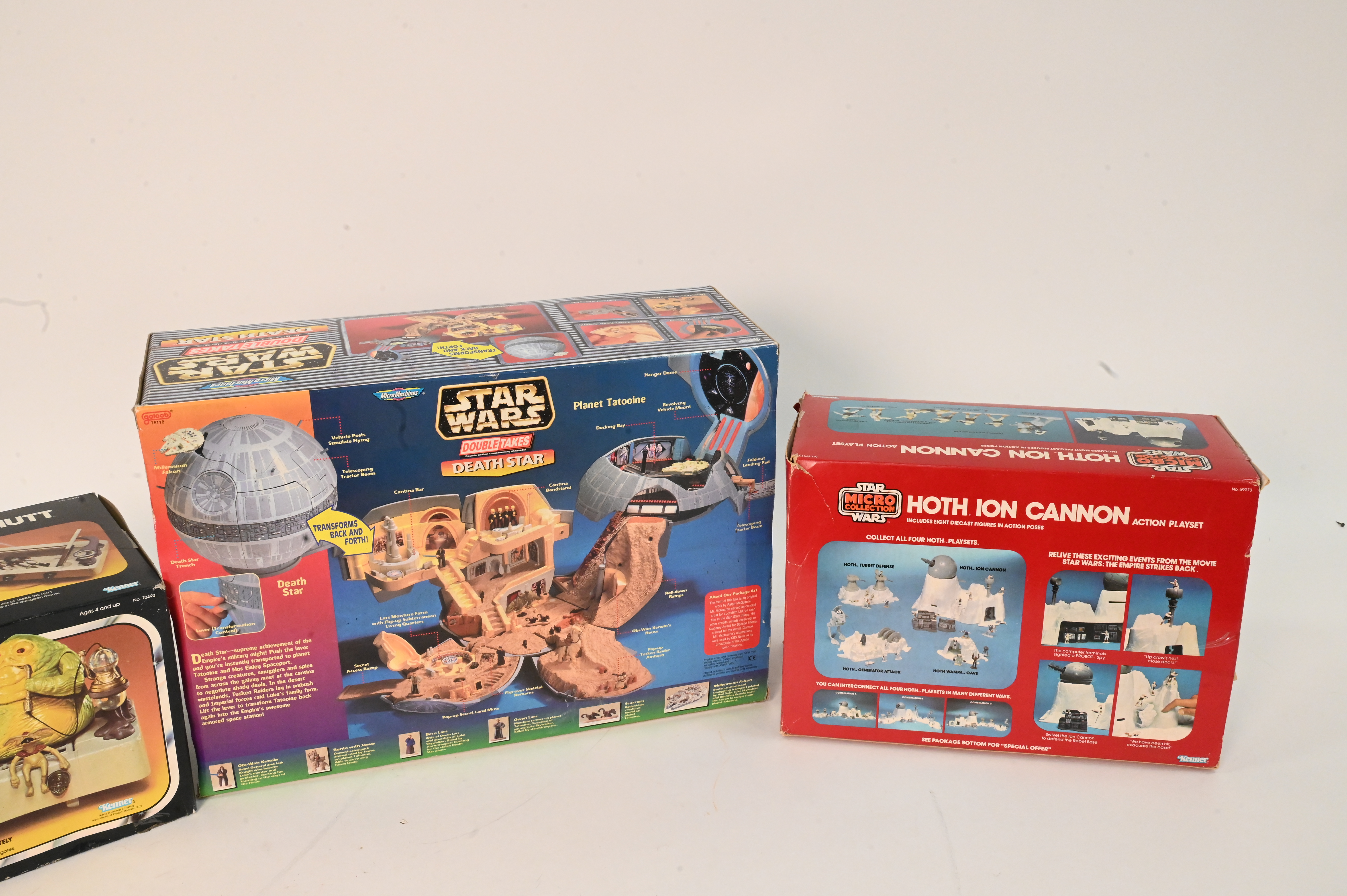 Three Piece Lot of Star Wars Memorabilia, to include Kenner 1983 Jabba the Hutt action playset, Kenner 1982 Hoth Ion Cannon action playset, along with Micro Machines 1997, all in original packaging, (as is).