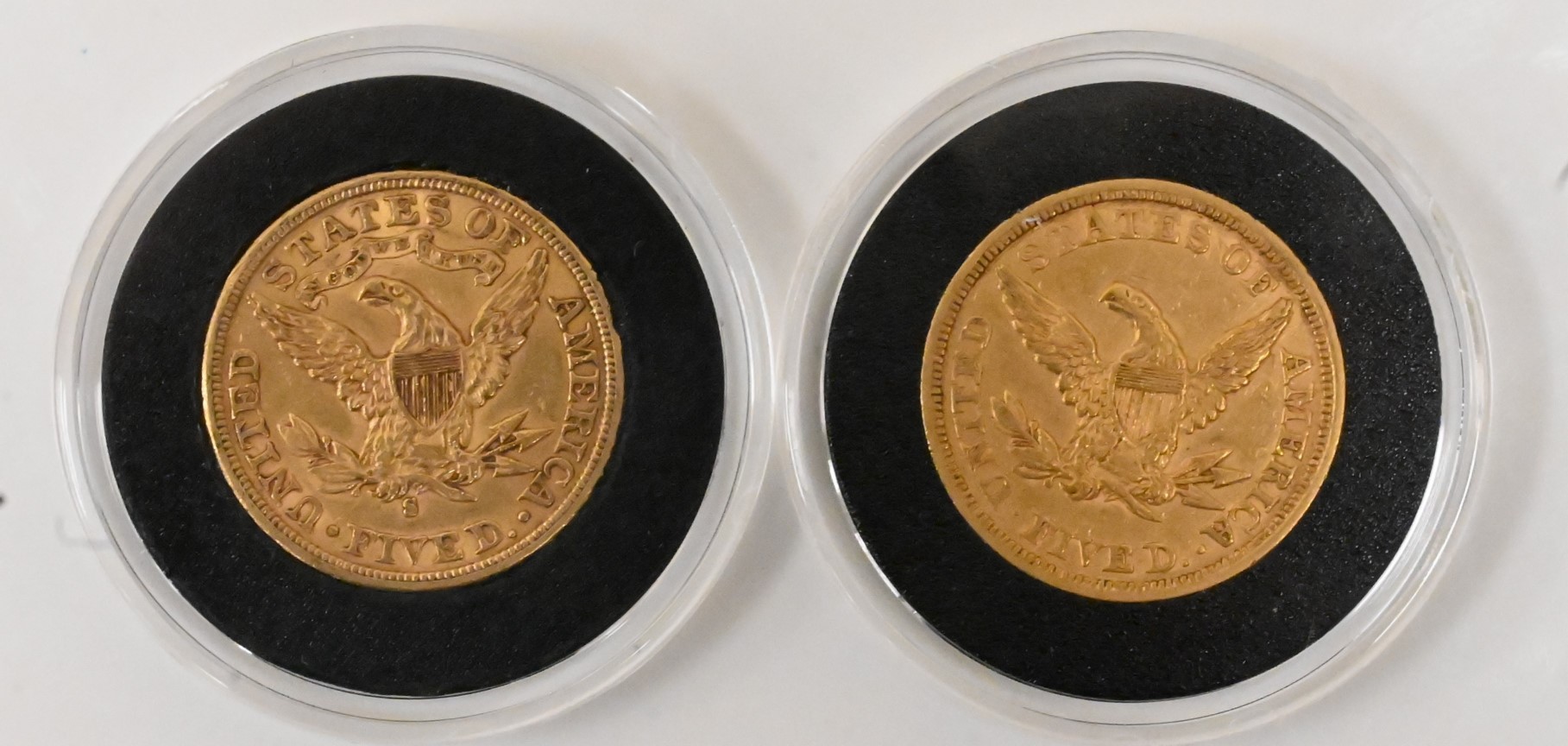 Two Five Dollar Gold Liberty Coins, to include 1853 five dollar gold Liberty XF, 1885-S five dollar gold Liberty XF