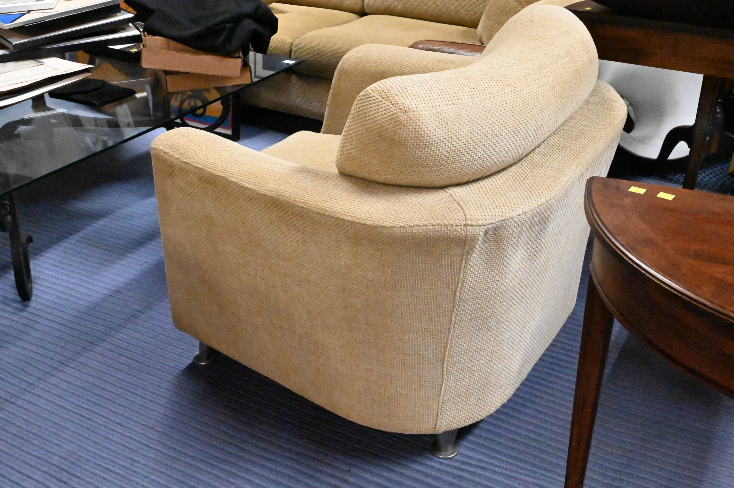 Two Piece Mid Century Modern Living Room Set, to include upholstered sofa set on short chrome legs, along with a matching club chair, sofa height 32 inches, length 82 inches.