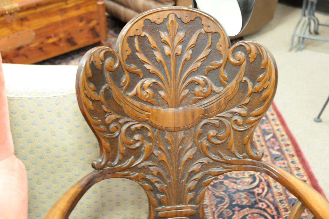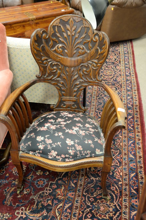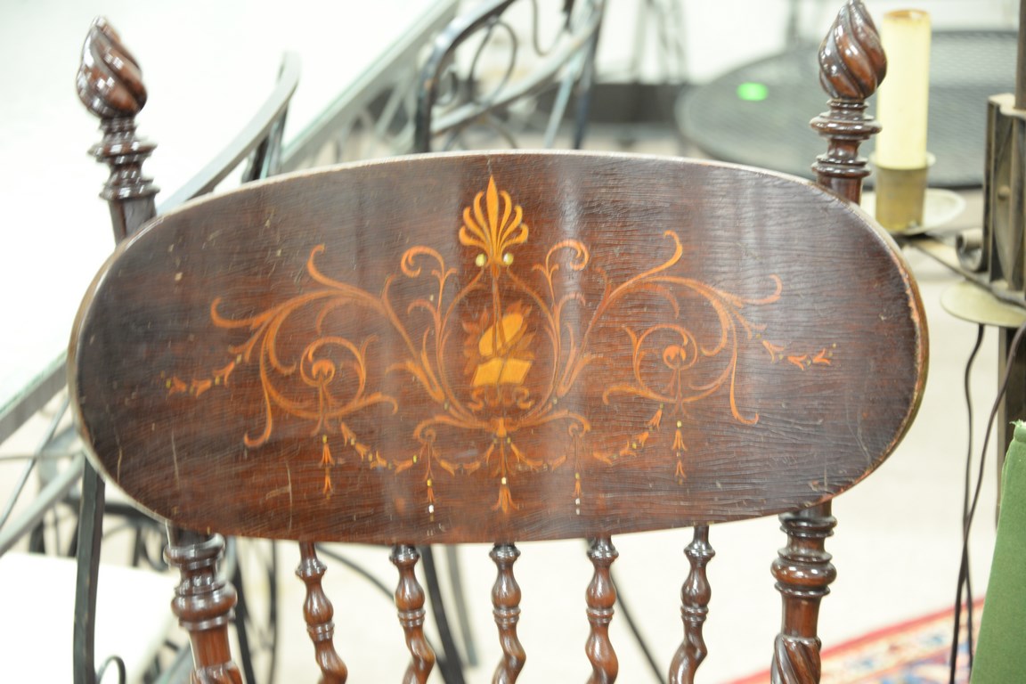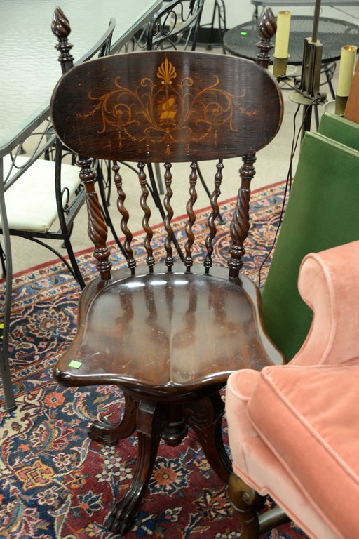 Lot 434: Two Victorian chairs including an inlaid mahogany piano stool with twist turned spindles and a carved mahogany armchair.