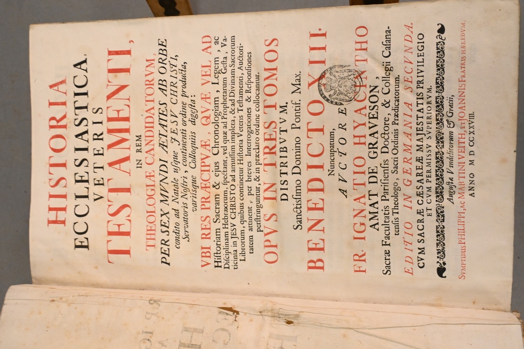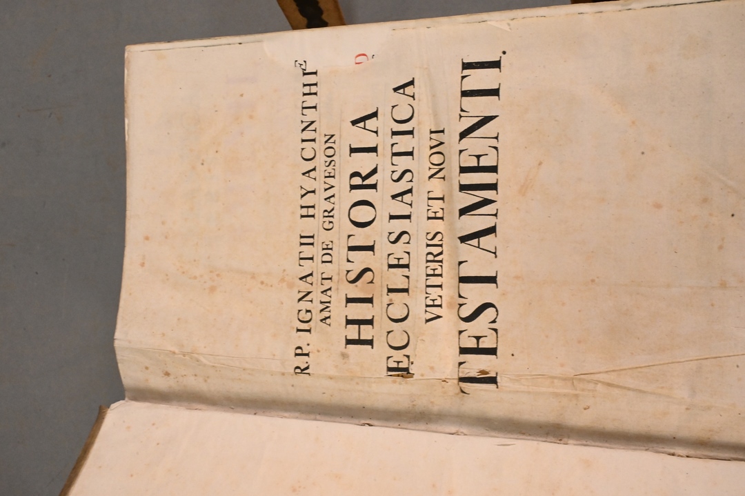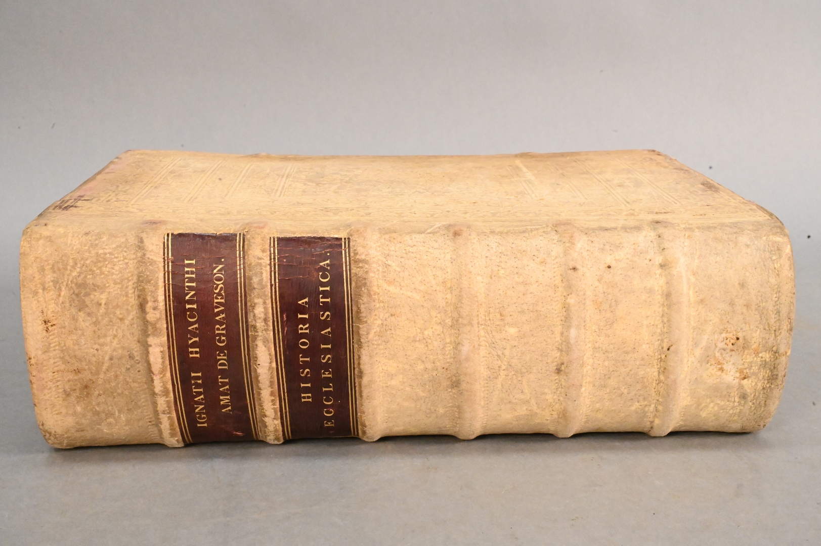 1728 Leatherbound Copy of Ignatii Ityacinthi Amat De Graveson, Historia Ecclesiastica, along with purchase receipt from 1981.