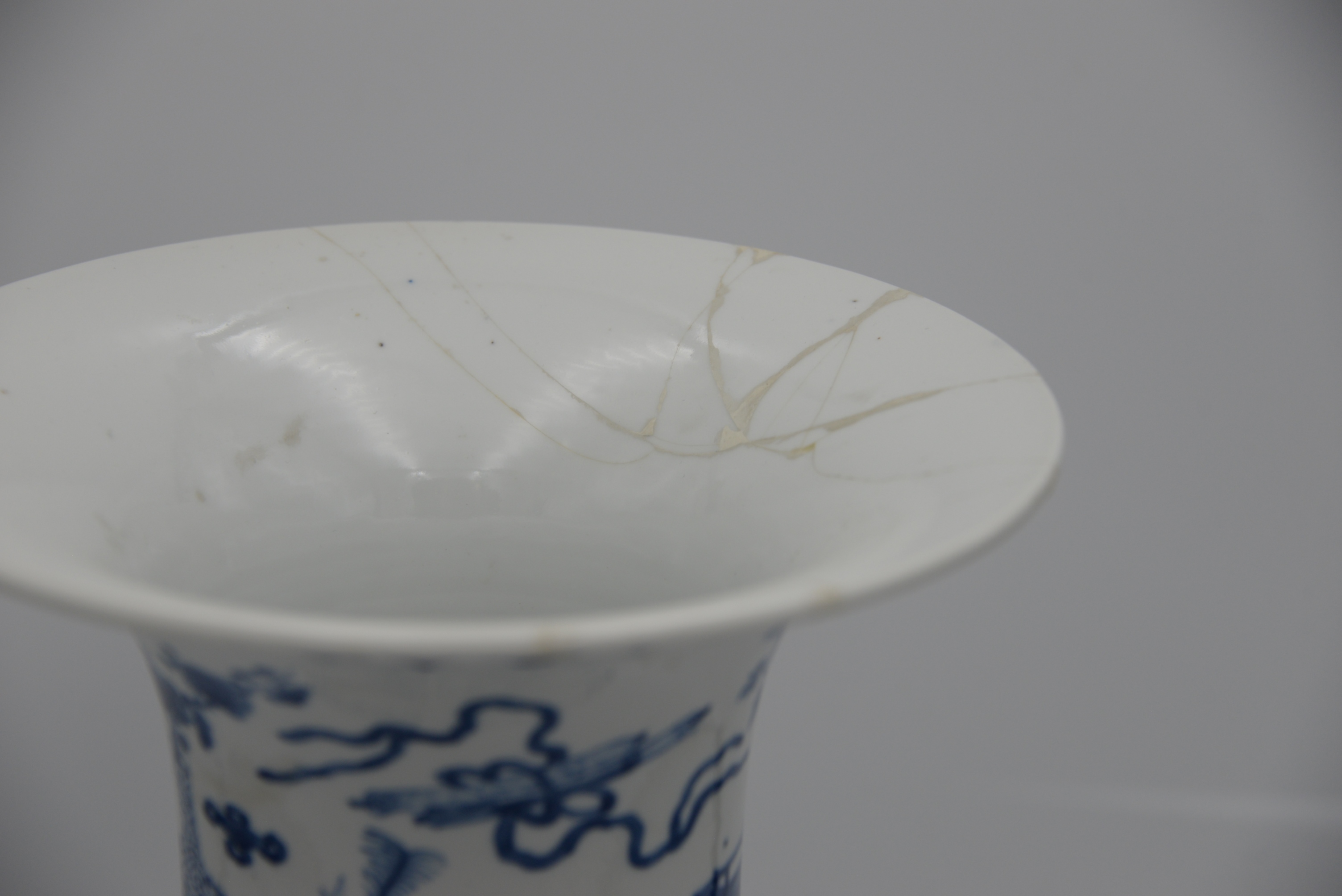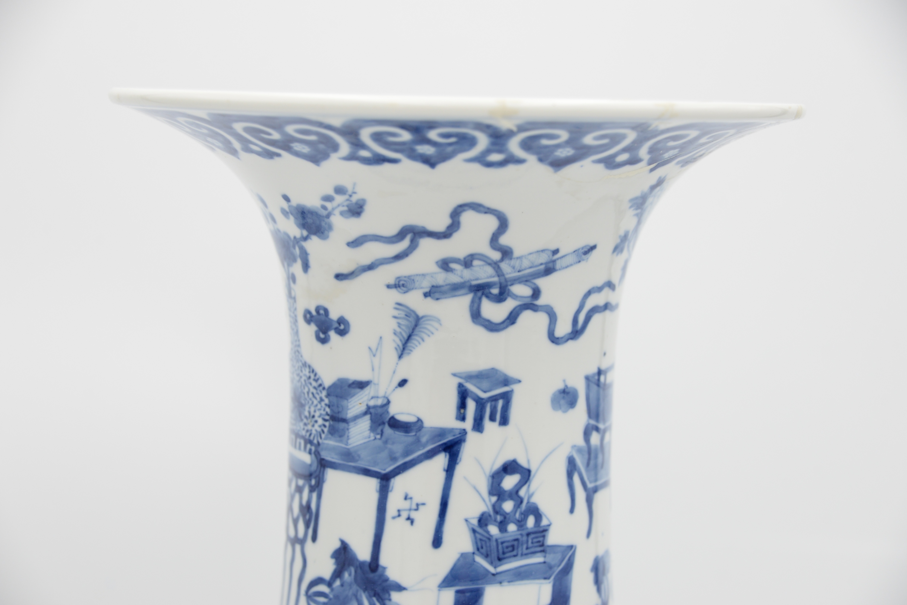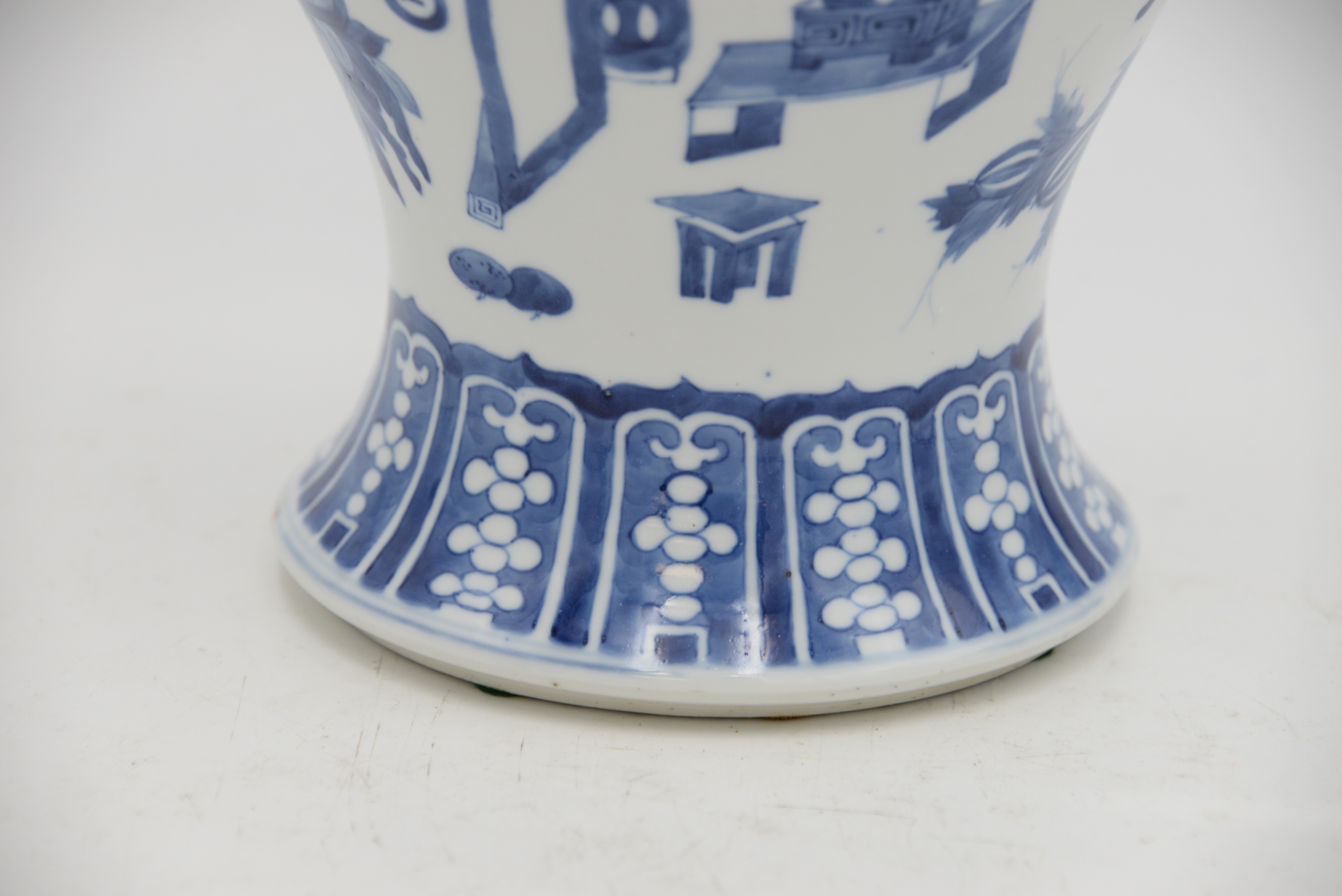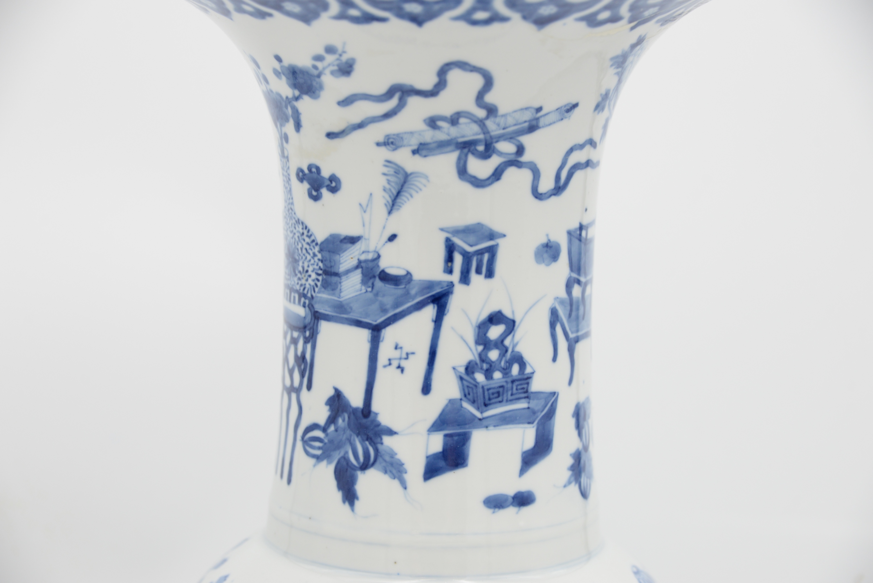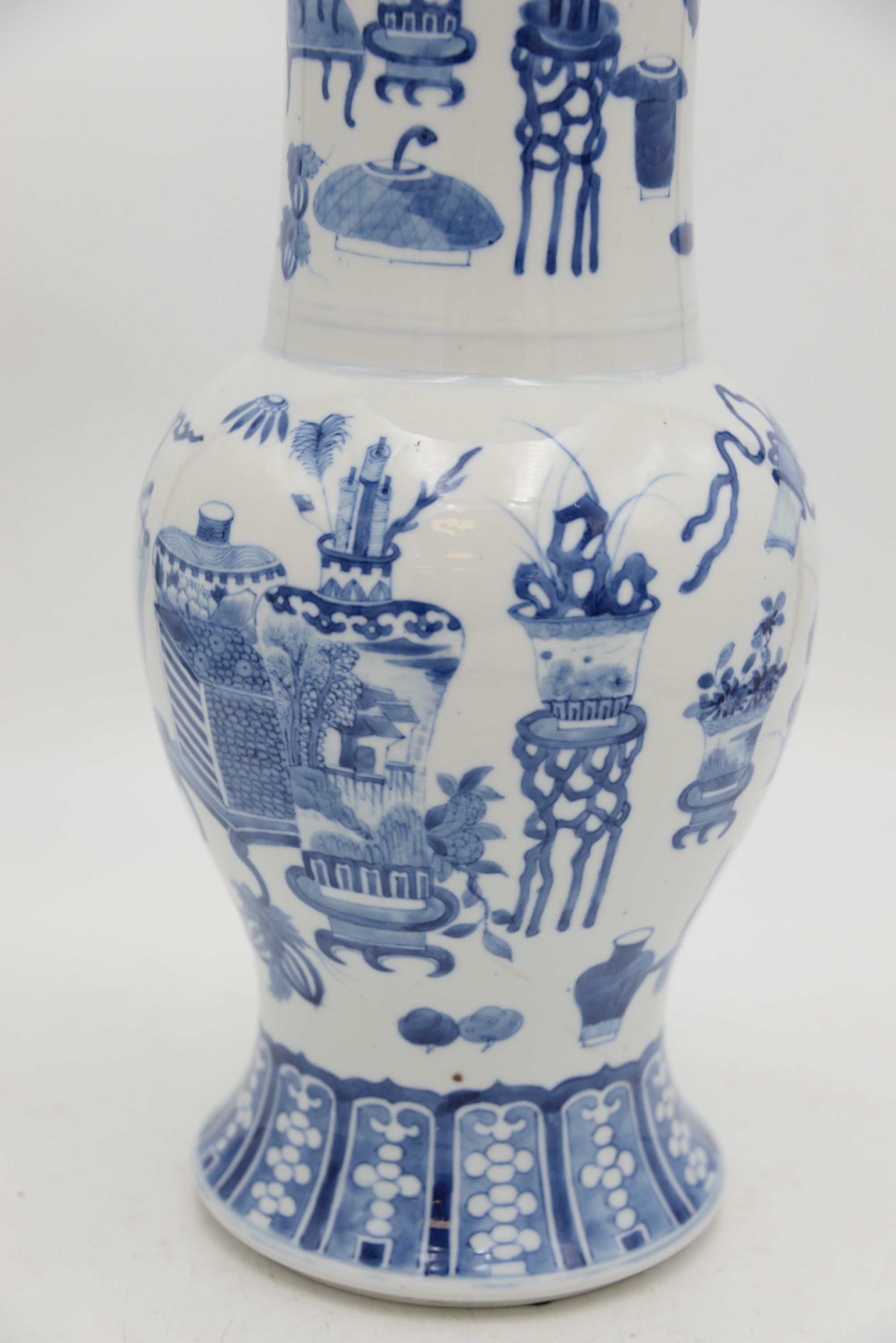 Chinese Blue and White Porcelain Vase, having flared neck with Kangxi style border, painted with precious objects and scholar’s articles and flowers above a bulbous body, six character mark within double circle, (rim repaired), height 17 3/4 inches.
