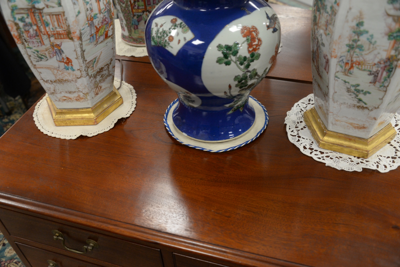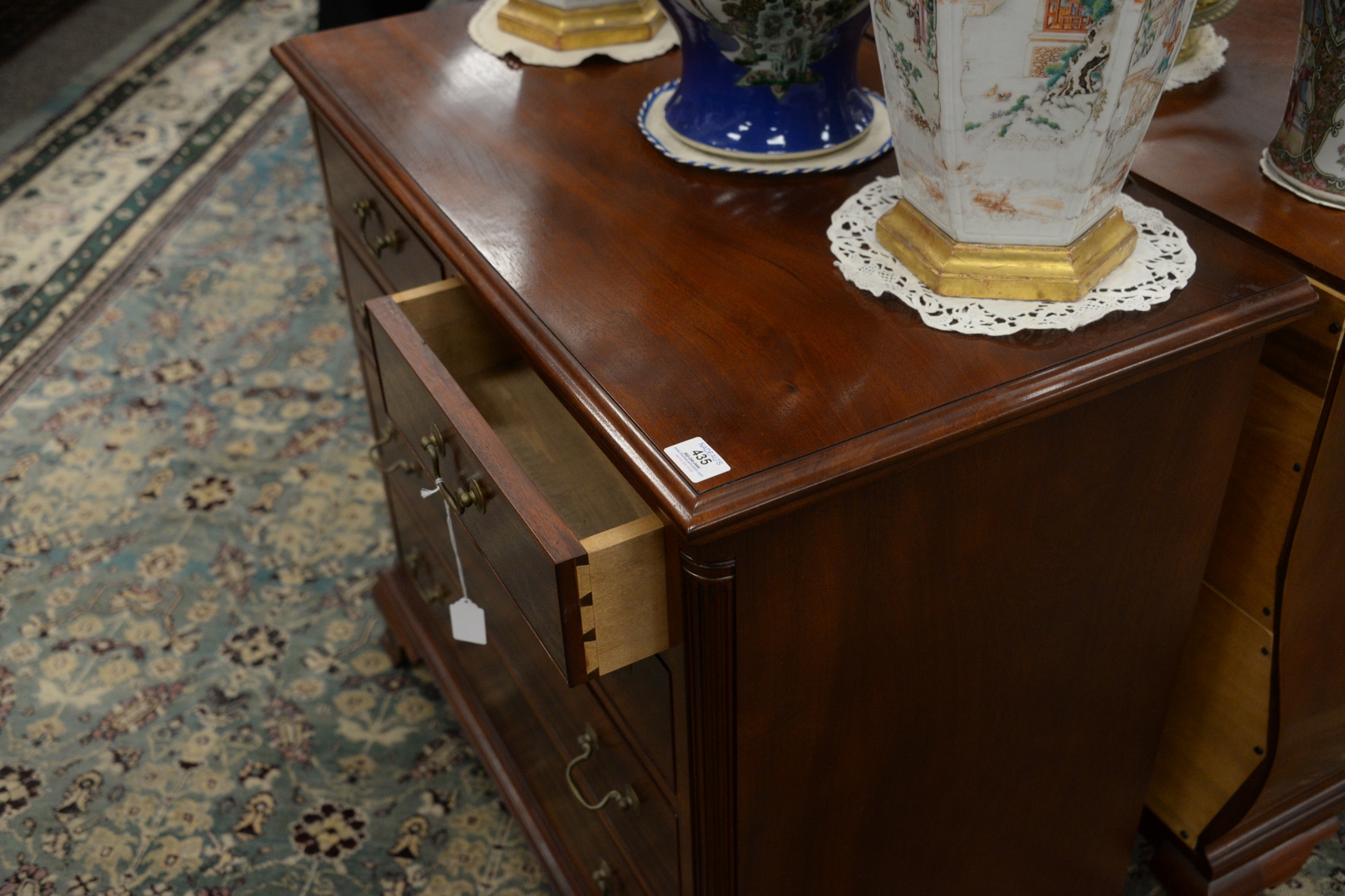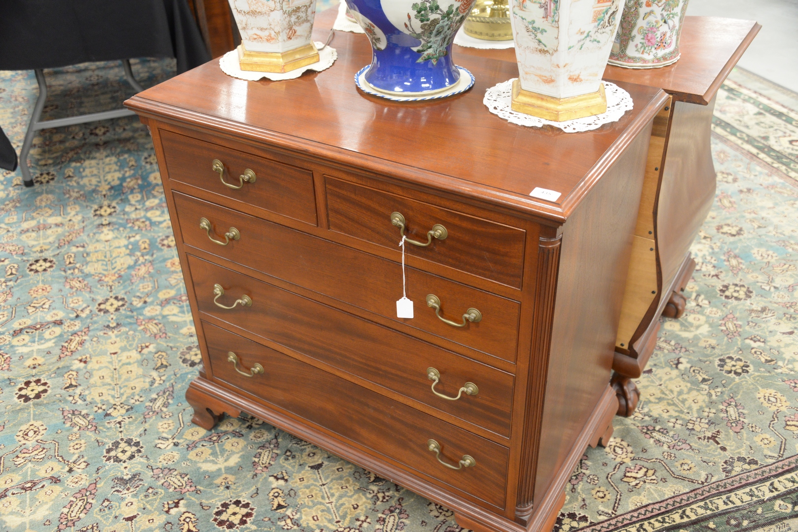 Lot 435: Chippendale Style Mahogany Chest having two over four drawers on ogee feet, signed Irion Furniture Company, height 33 1/2 inches, width 33 inches, top 19 1/2 x 34.
