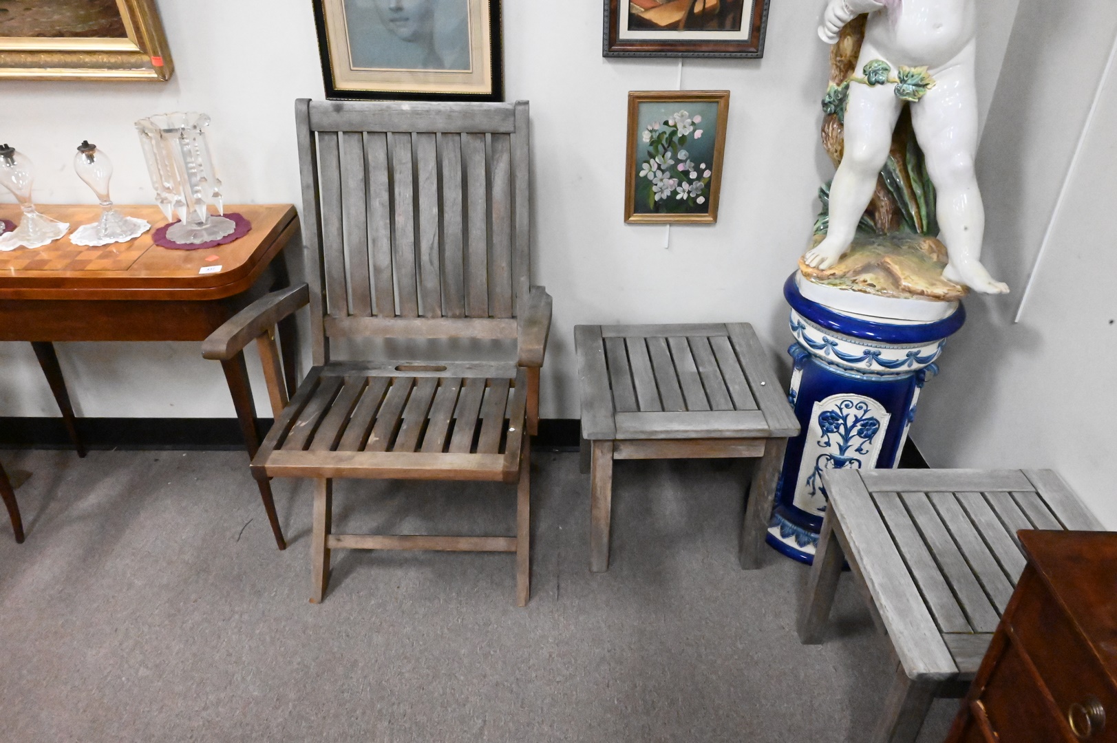 Eight Piece Outdoor Teak Patio Set, to include square dining table having two 14 inch built in leaves, along with five folding chairs (three side chairs and two armchairs), height 30 inches, top 47″ x 51″, top open 47″ x 75″; along with a pair of teak side tables.