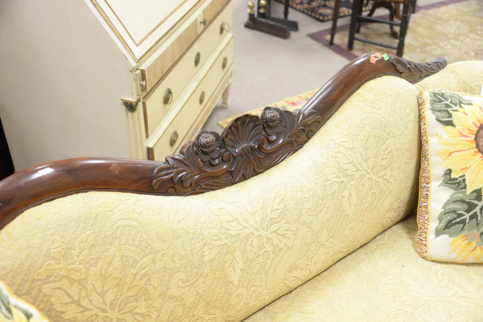 Lot 435: Empire Mahogany Carved Sofa, with custom upholstery, circa 1840, height 34 1/2 inches, length 83 inches. Provenance: Matthes-Theriau…