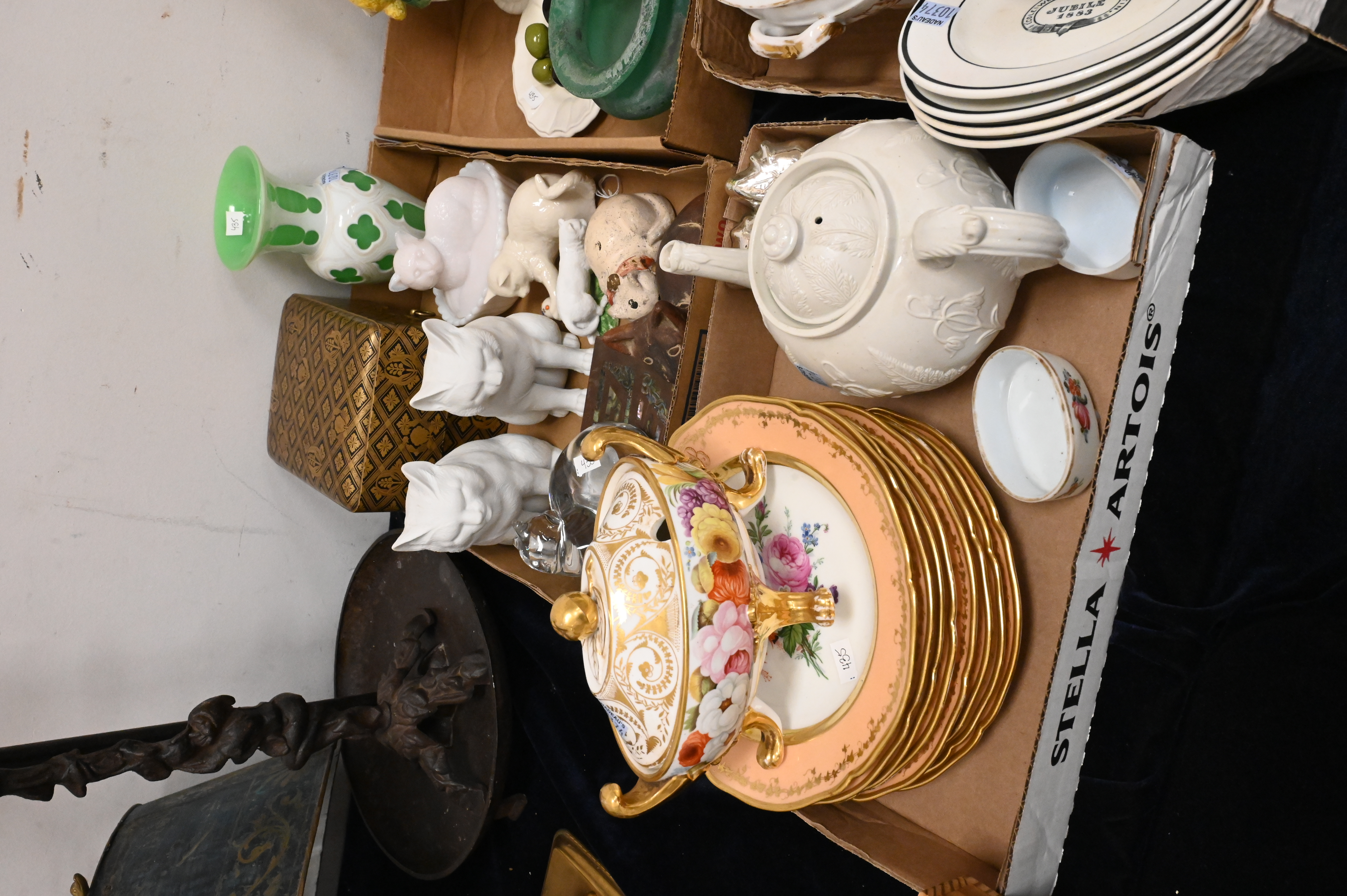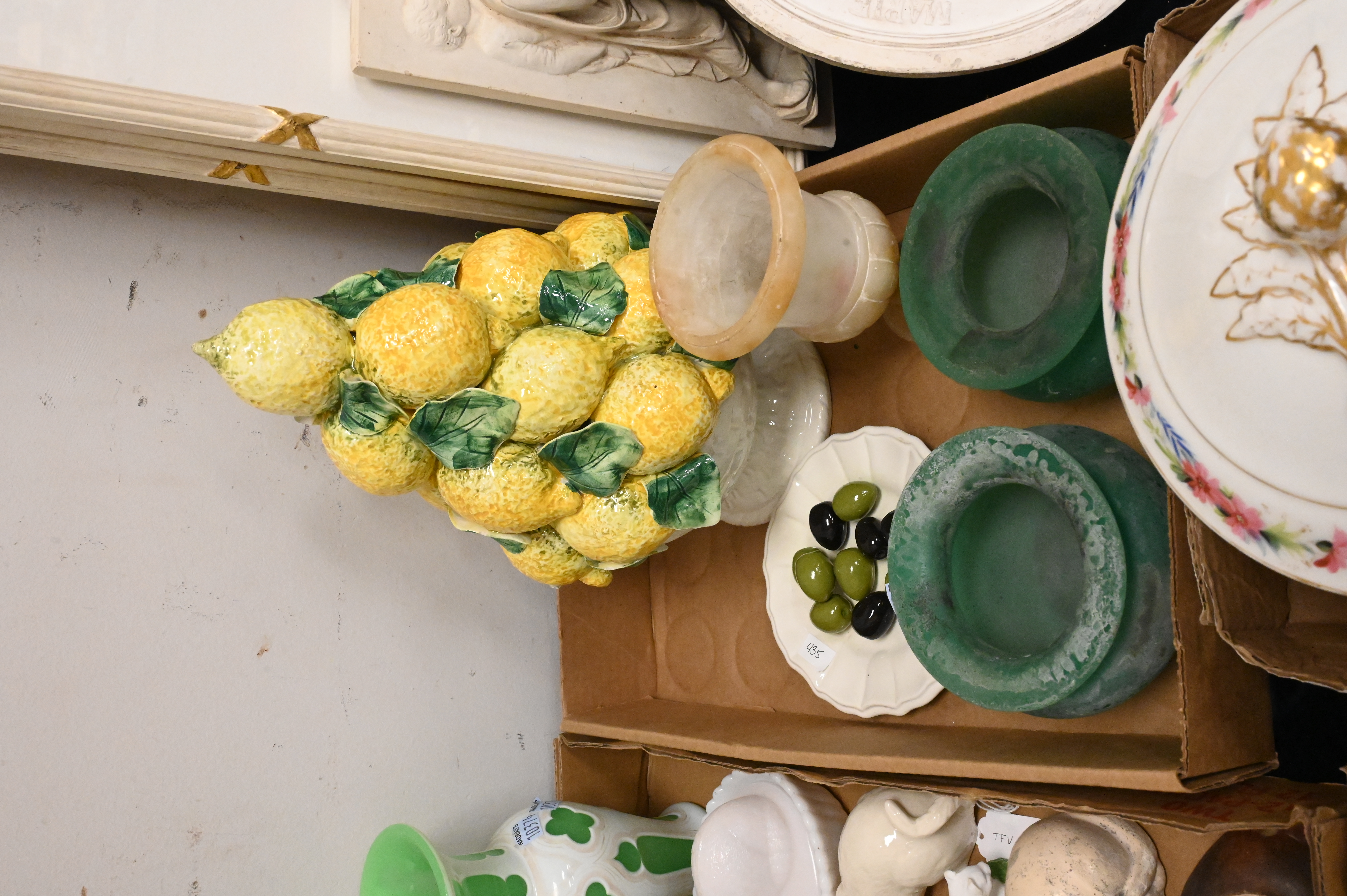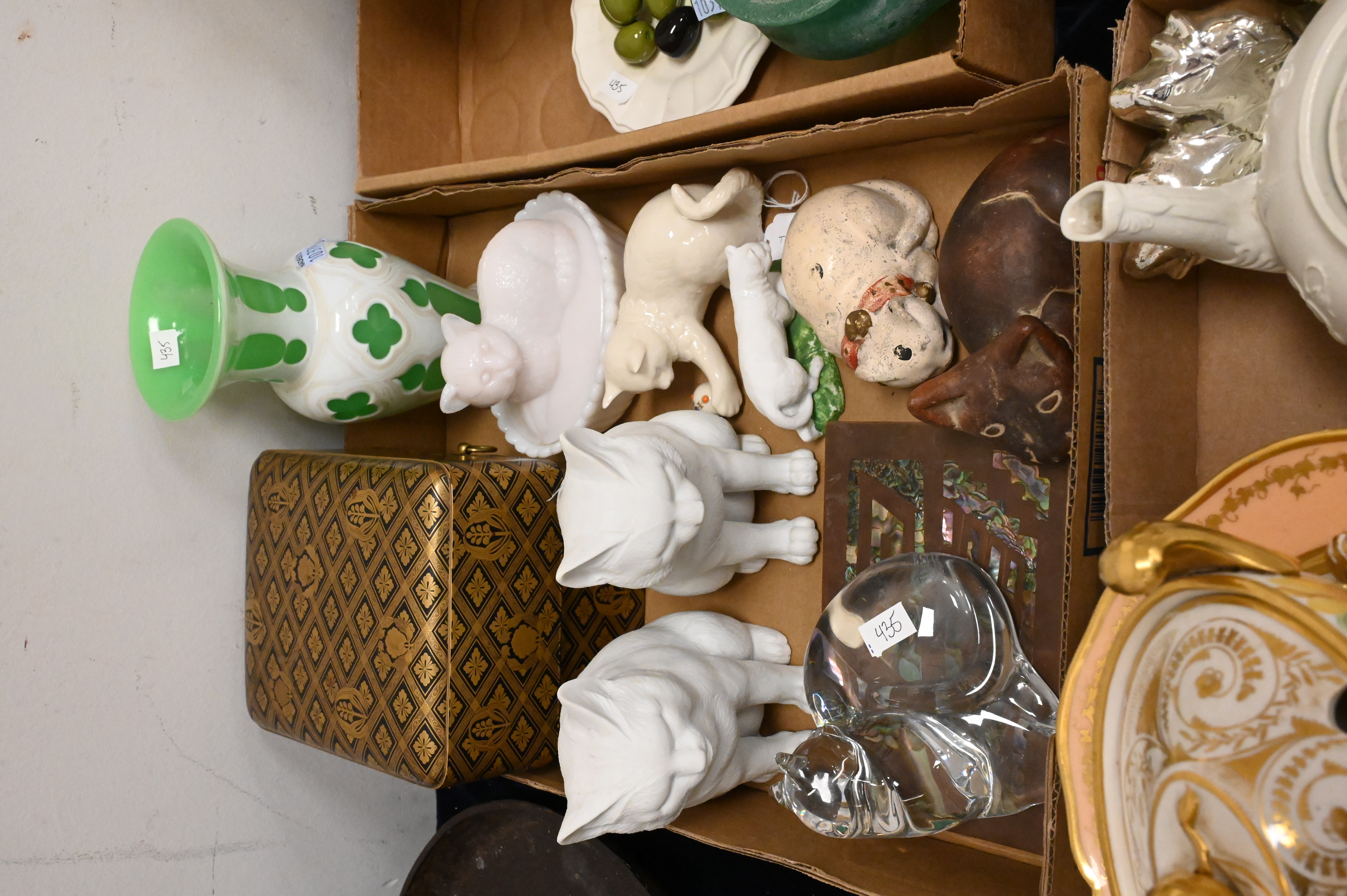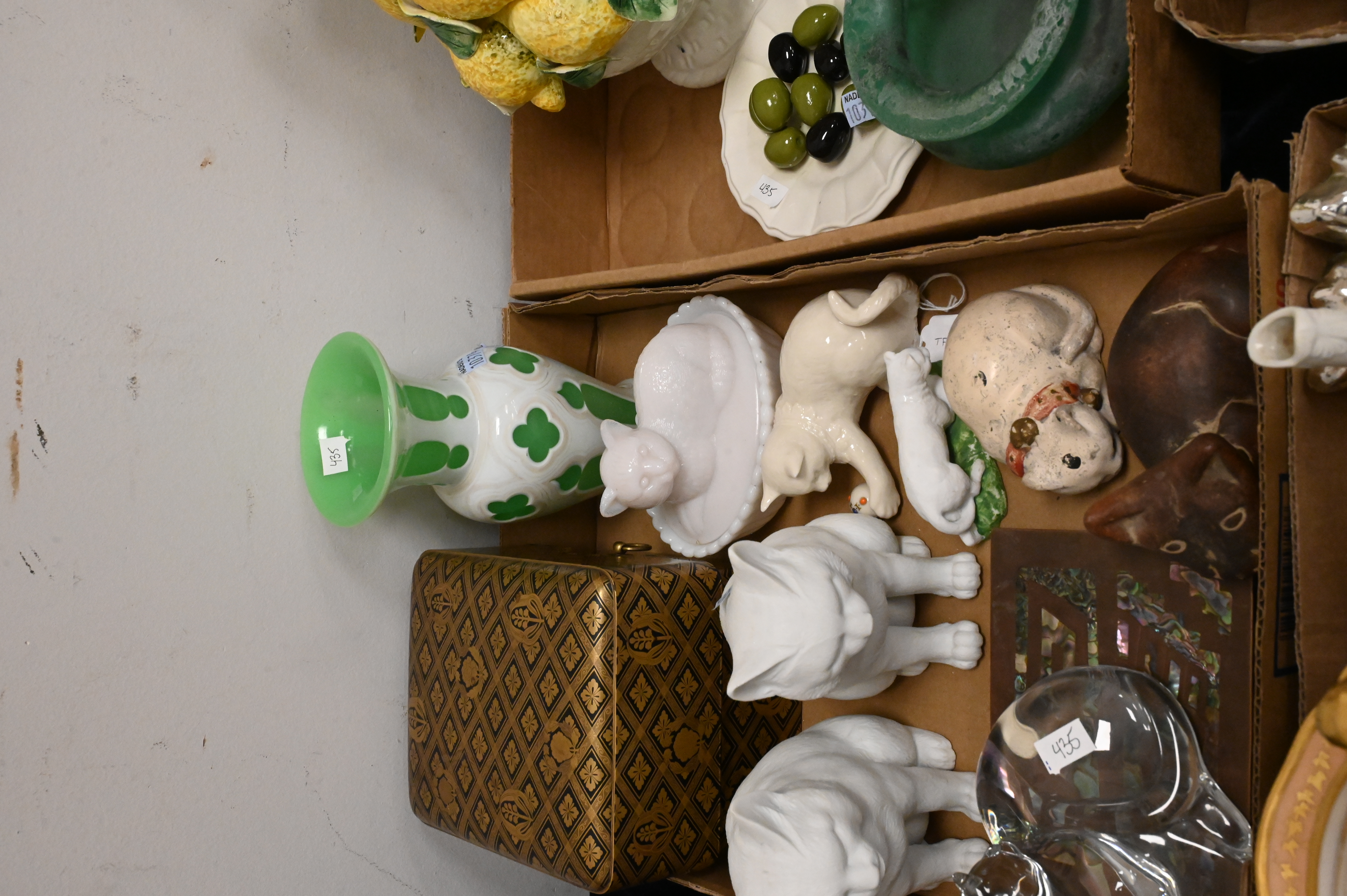 to include ceramic cats, Baccarat crystal cat, teapot, 8KPM floral and gilt porcelain dessert plates, alabaster urn, Majolica lemon centerpiece marked Italy, faux olive plate Este Majolica, coalport tureen, gothic revival opaque overlay vase, etcetera