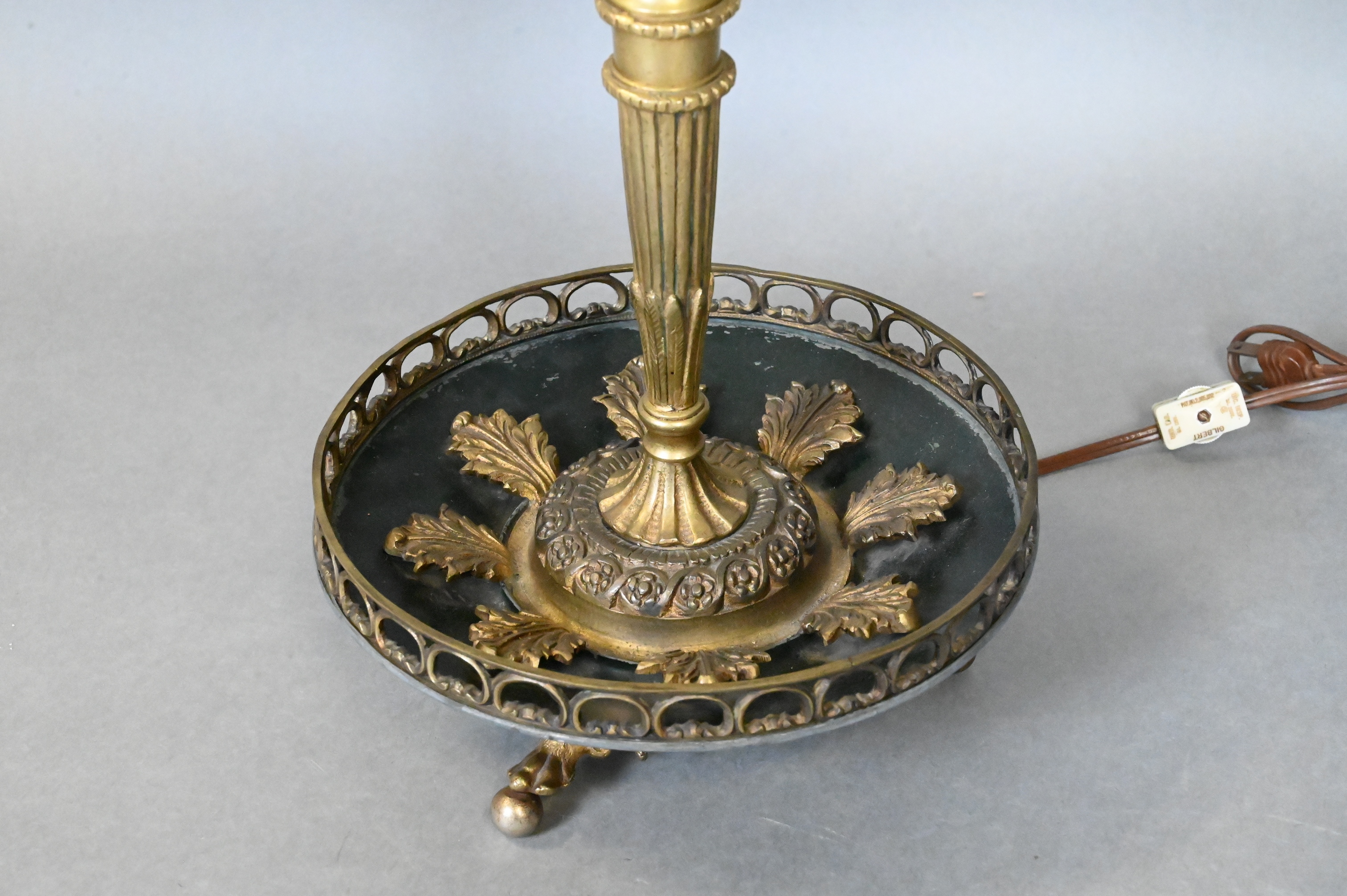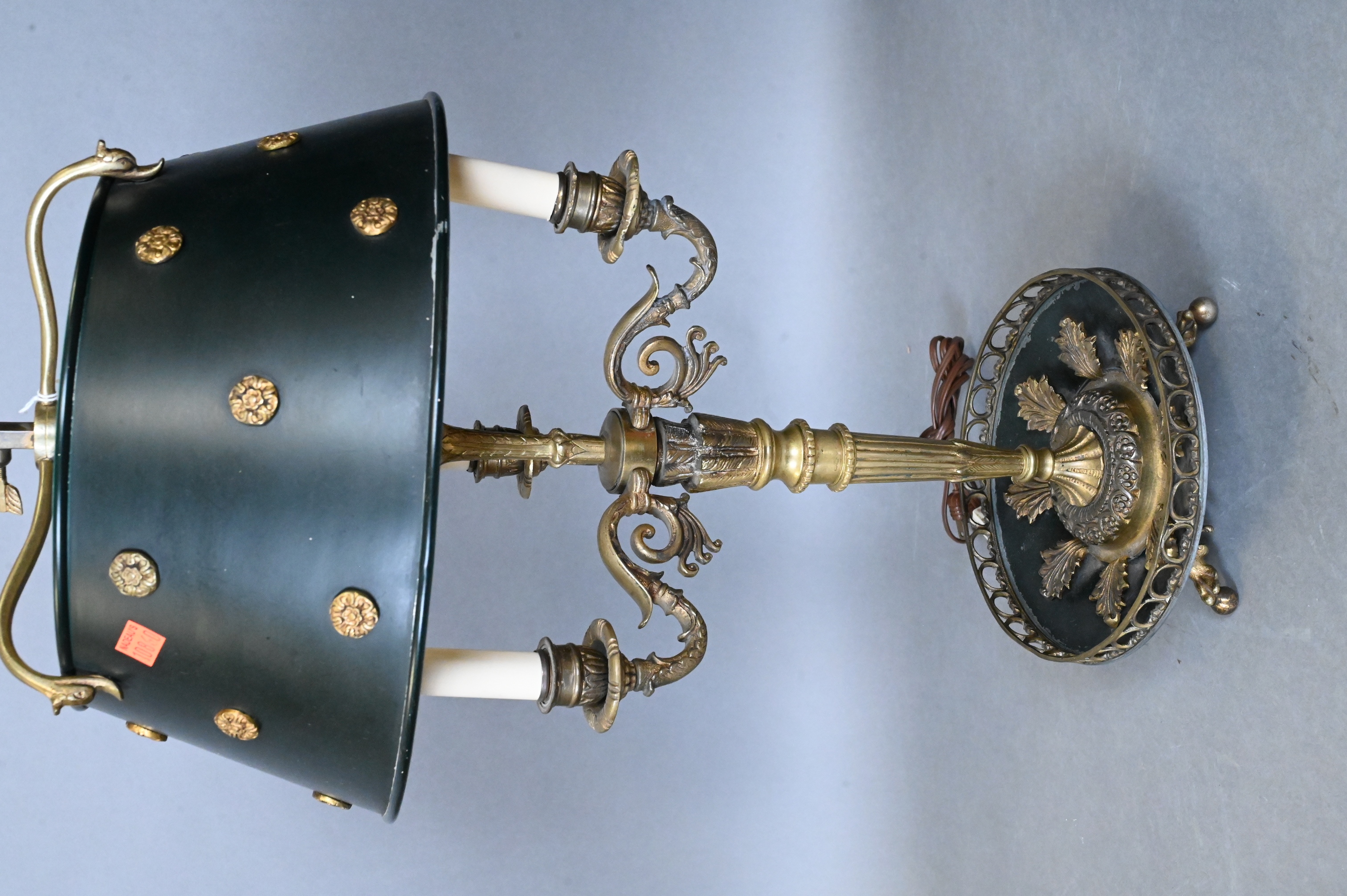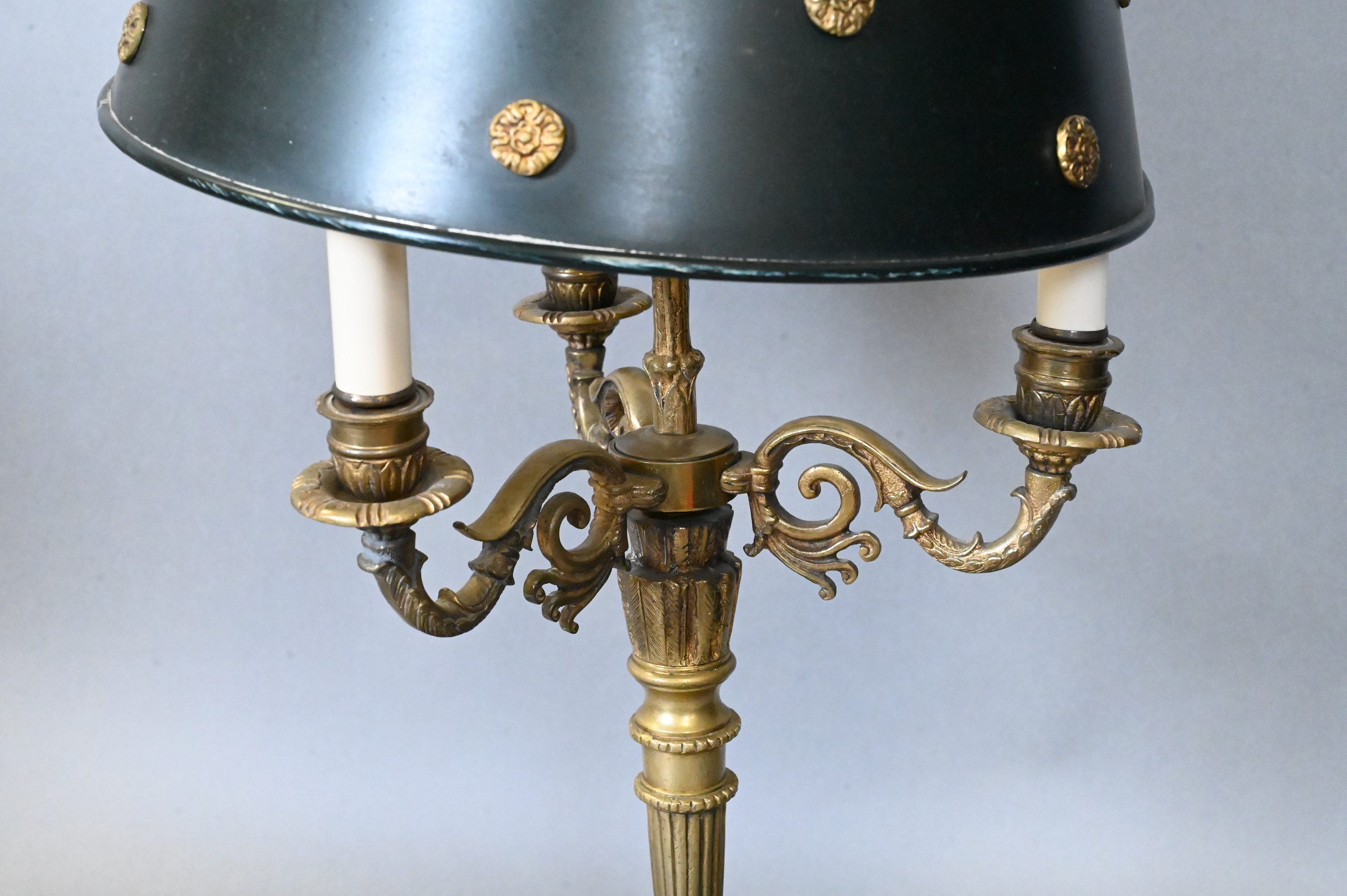 classical gilt-bronze bouillotte lamp with an adjustable green tole shade decorated with applied gilt rosettes, three-light candelabra-form standard with scrolling arms, fluted column, and foliate circular base on paw-from feet, gilt bronze and tole, electrified