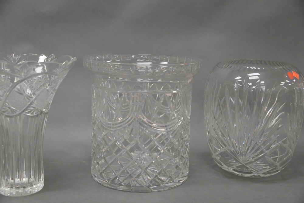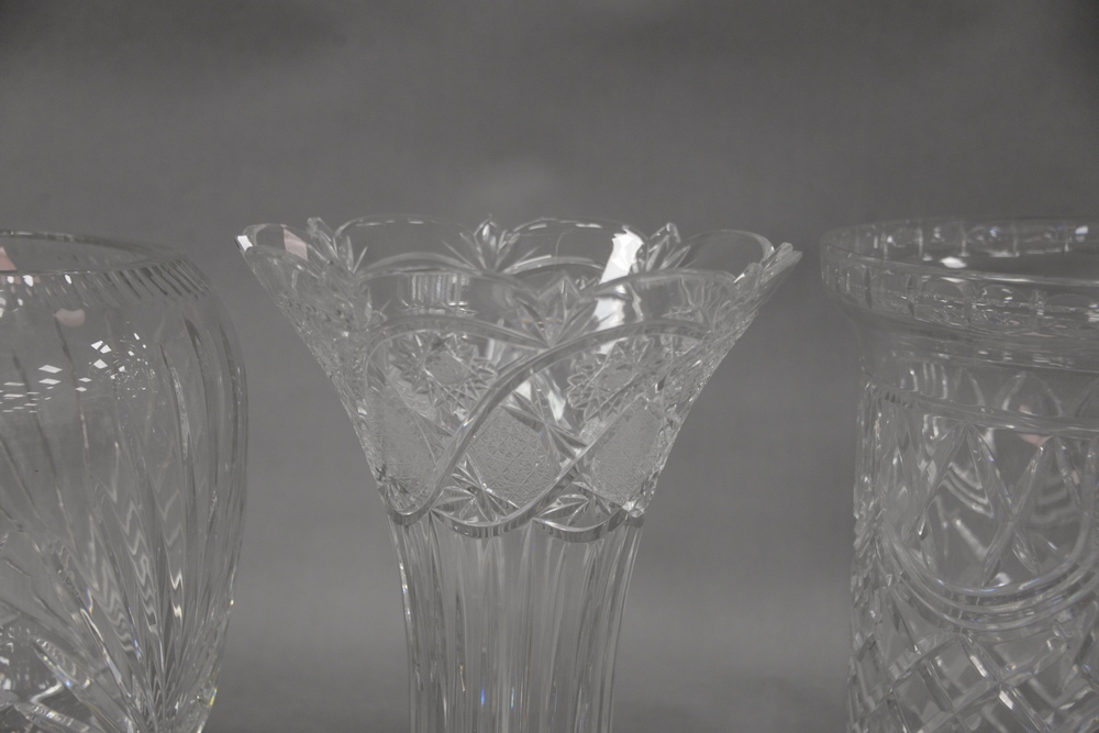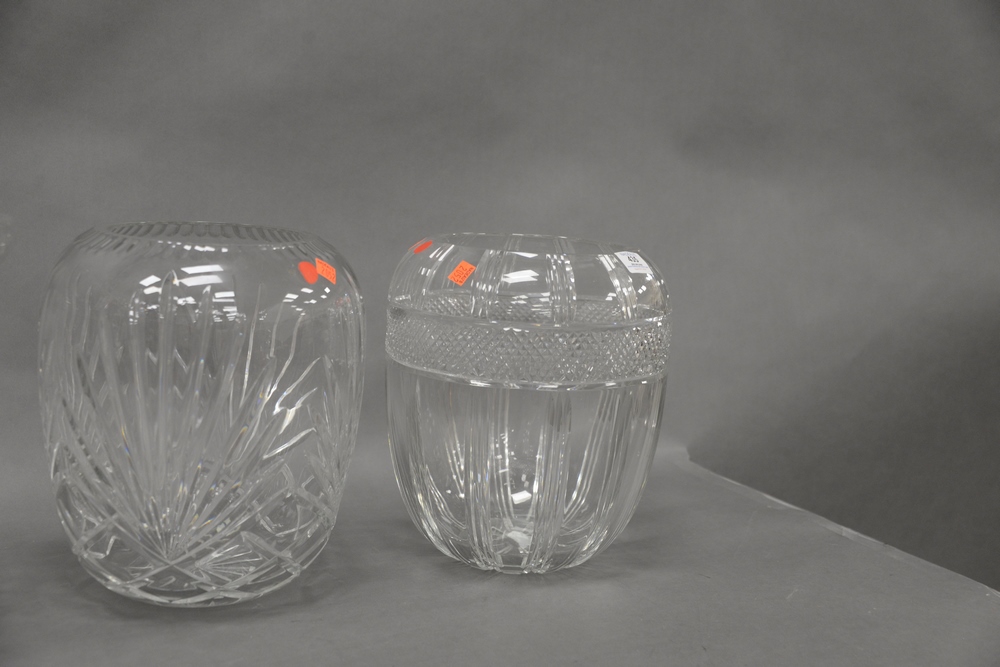 Lot 435: Group of Five Large Glass Pieces, to include a pair of vases, oversized urn, along with two vases, tallest height 12 1/4 inches.