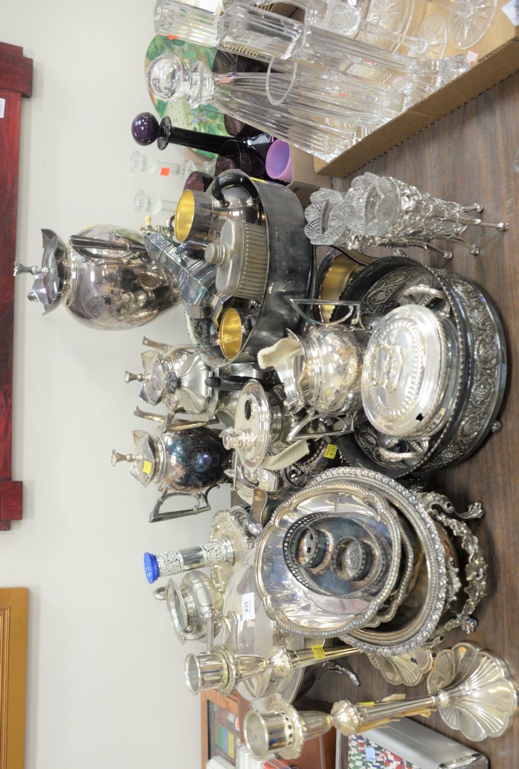 Lot 435: Large Lot of Silver Plate, to include tea and coffee set, candlesticks, vegetable dishes, etc., coffee pot height 18 1/2 inches.