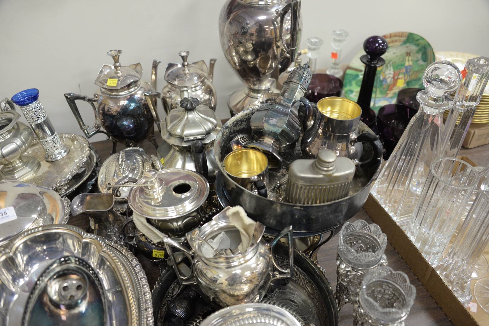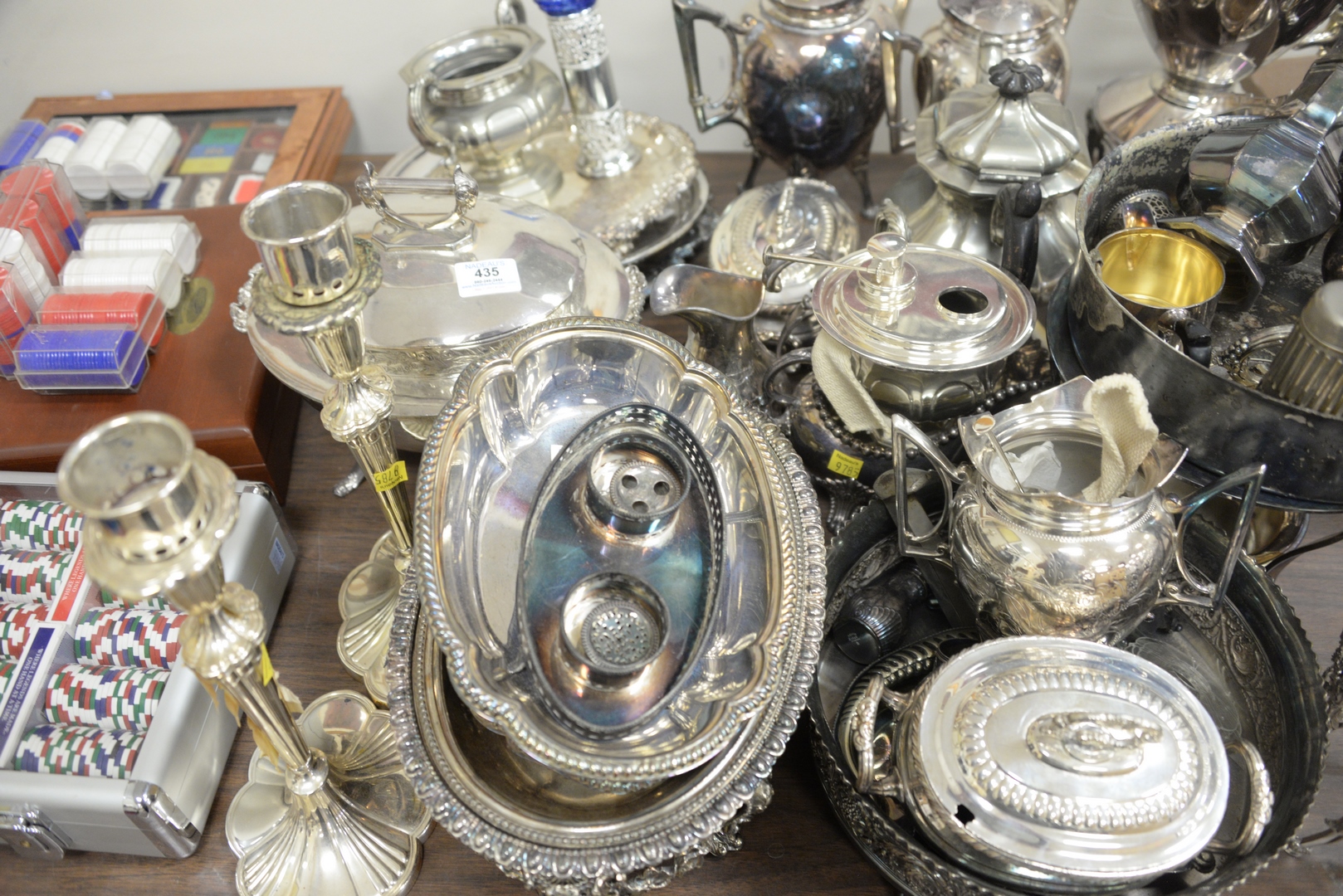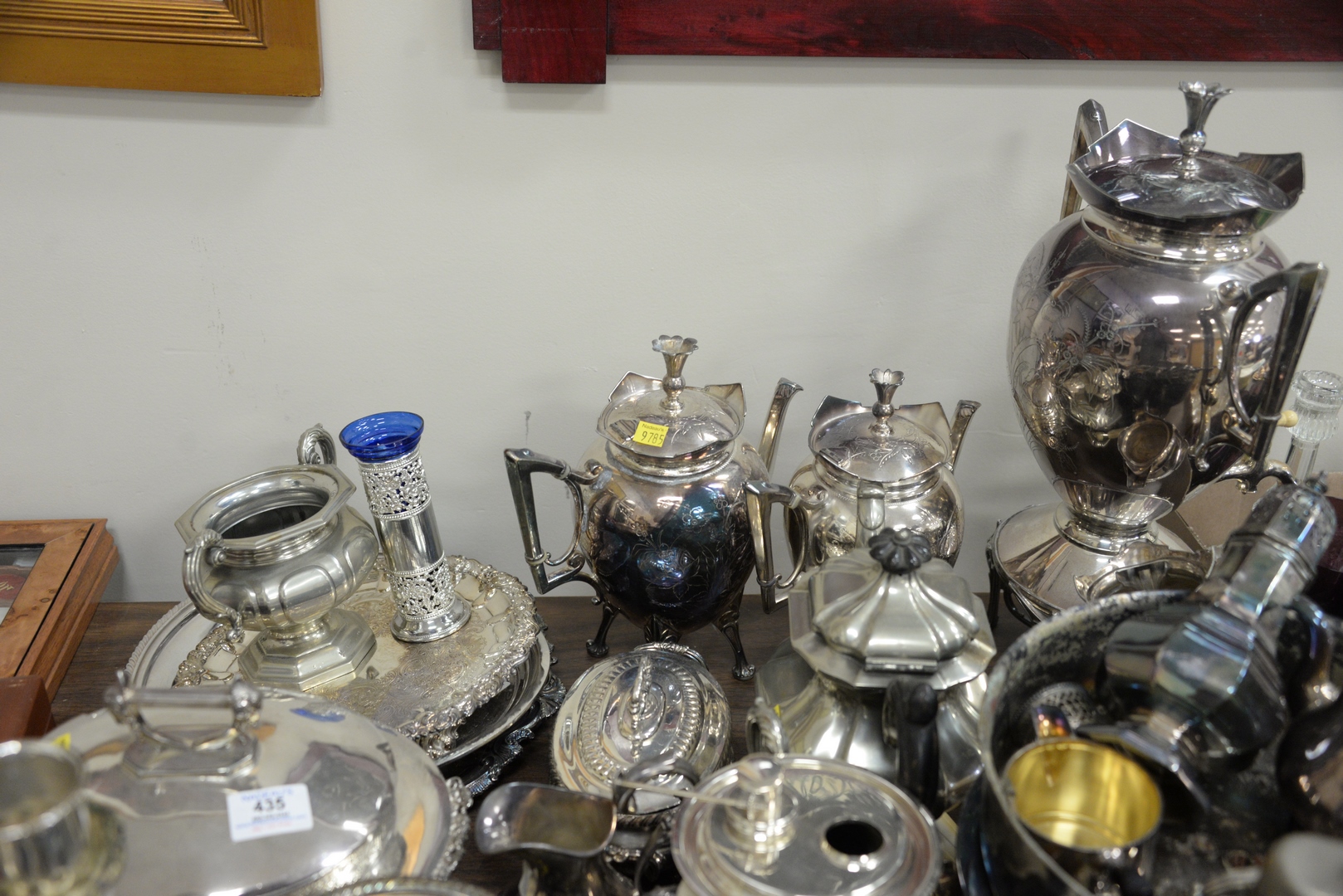 Lot 435: Large Lot of Silver Plate, to include tea and coffee set, candlesticks, vegetable dishes, etc., coffee pot height 18 1/2 inches.